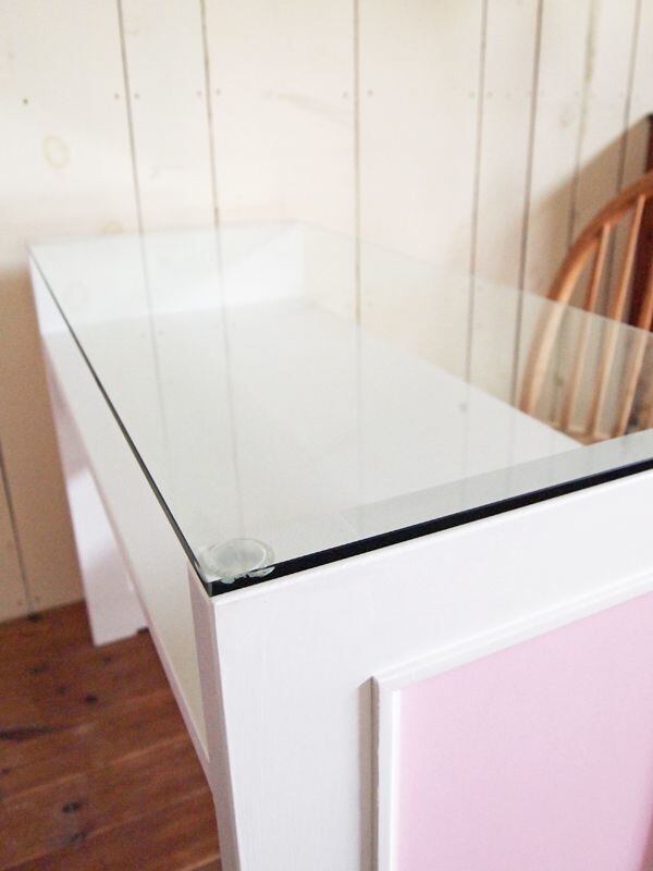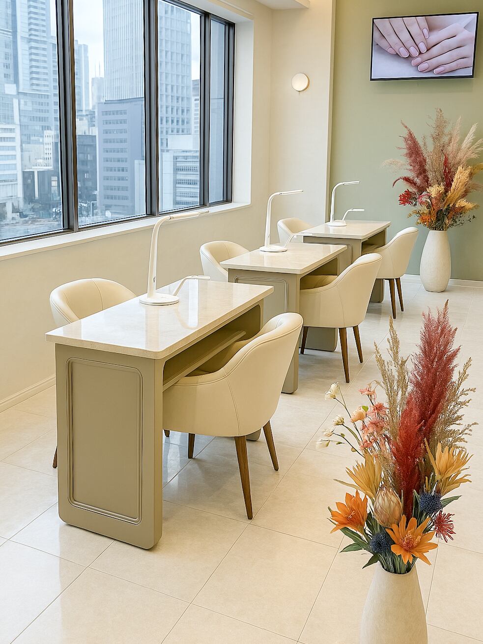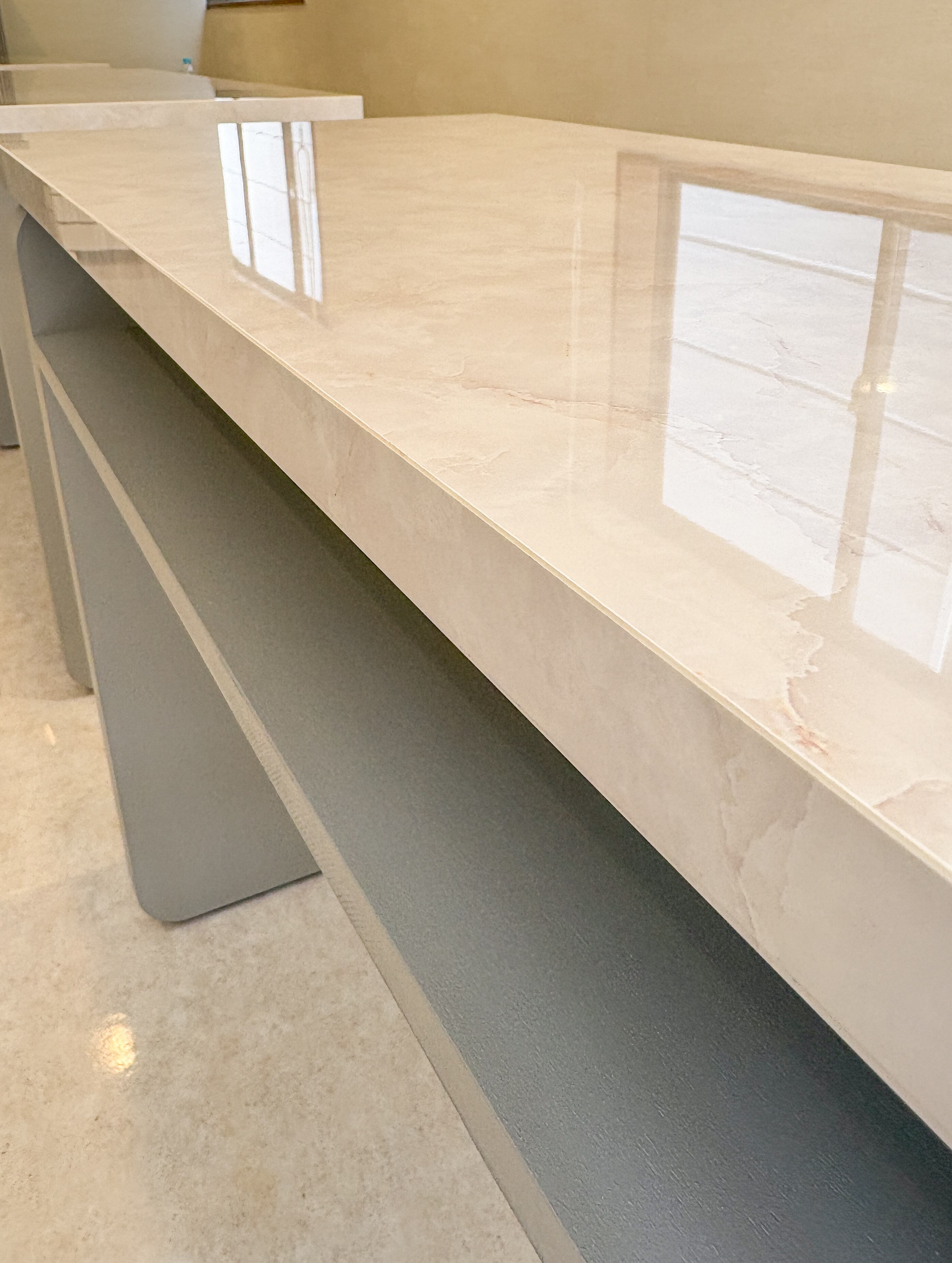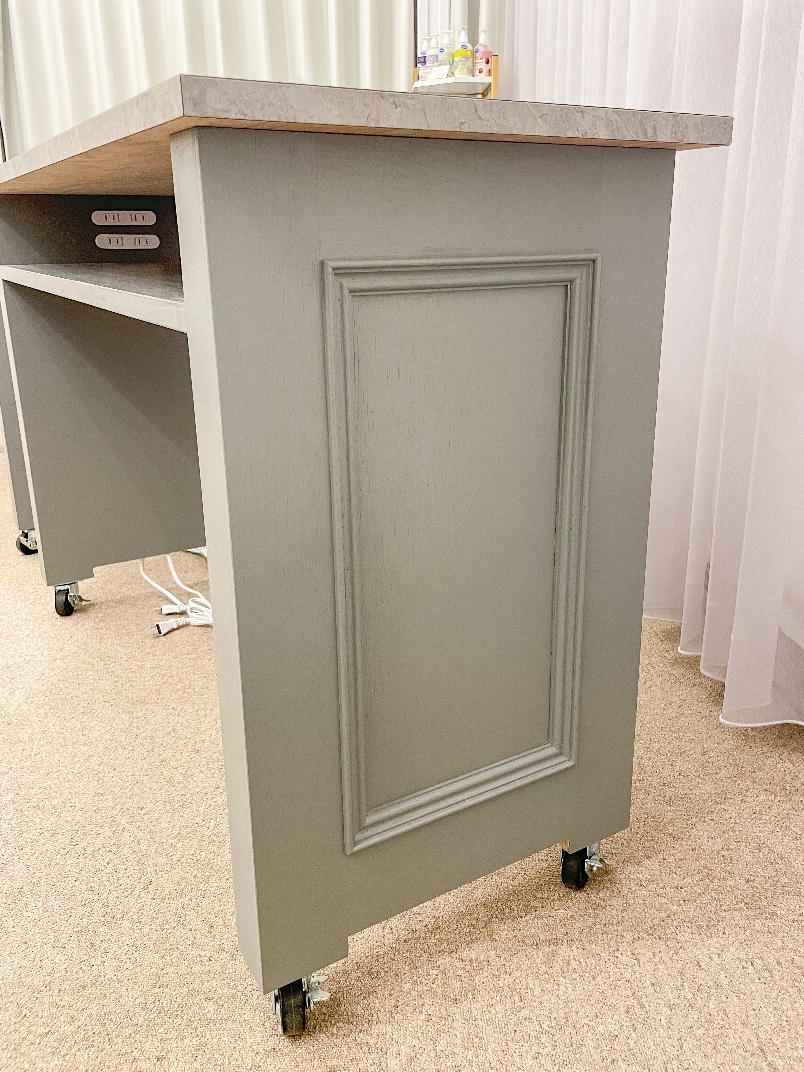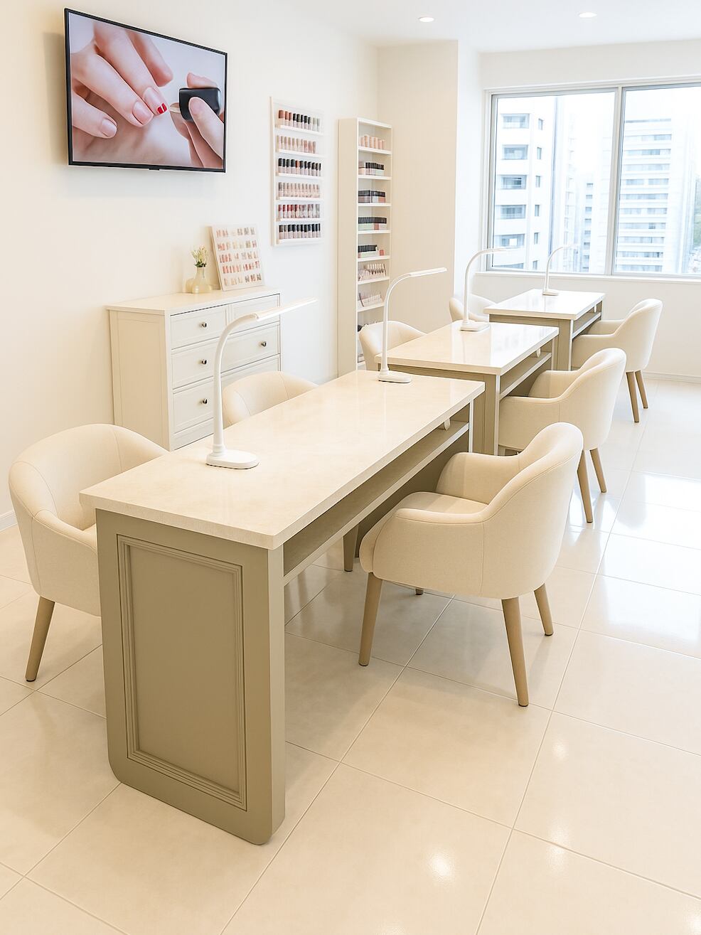 兵庫県にオープンするネイルサロンに、かわいい大理石天板のネイルデスクをオーダーメイドさせていただきました。足の角を丸くカットして、柔らかい雰囲気にカスタムデザインしました。天板の厚みが30mmと少しだけ厚め。モールディングを使って豪華に装飾したネイルテーブルです。