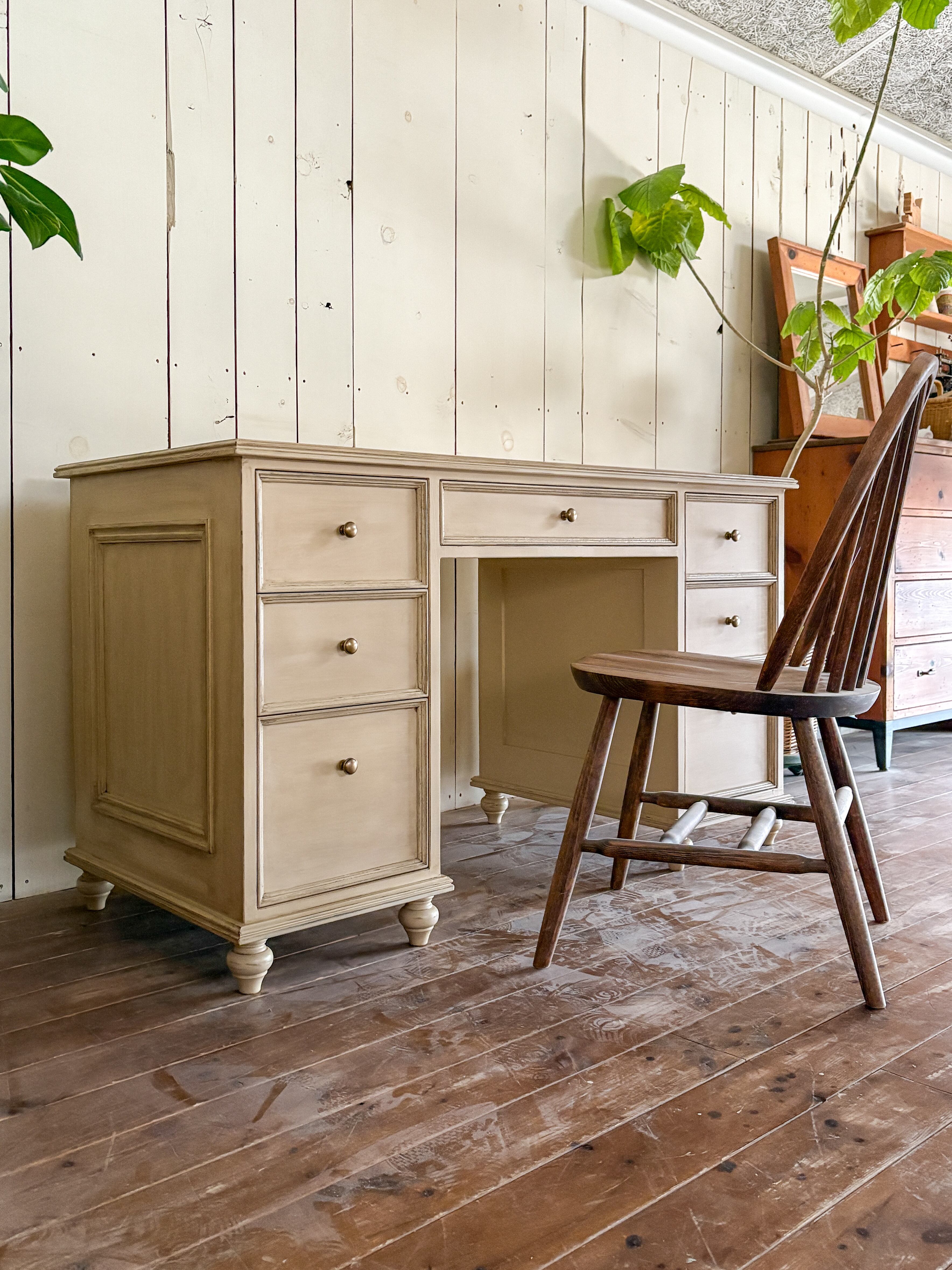正面、側面、背面、どこから見ても豪華なワークデスク。足元のろくろ足もかわいいポイントです。引出しが全部で7杯、置くまで引き出せるスライドレール式。予め中に収納するものが決まっていれば、使い勝手の良いサイズで製作いたします。写真はW1300×D600、サイズオーダーお気軽にご相談下さい。