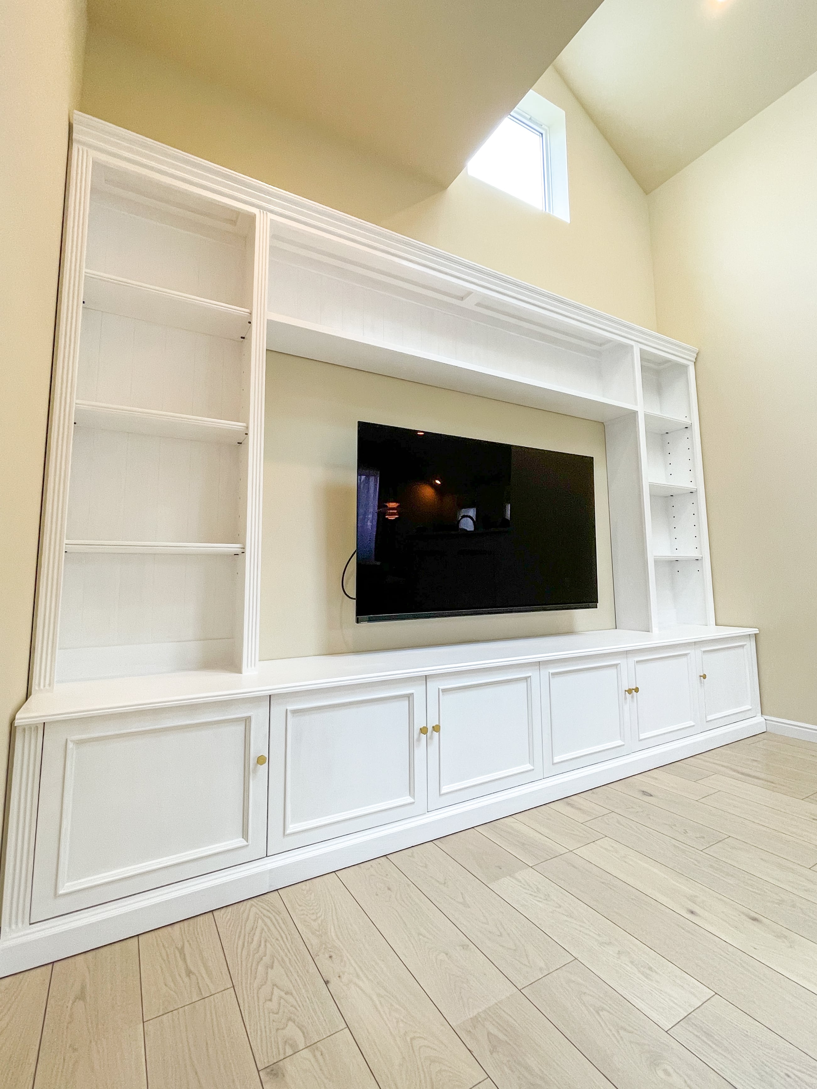 愛知県のオーナー様宅に、海外インテリア風の高級感ある壁面収納家具をオーダーメイドさせていただきました。マンションのリビングに設置するため、6つのパーツに分解して、屋内で組み立て。マンションやご自宅2Fへの搬入が可能です。洋書スタイルインテリアの実現は、グレイスファニチャーにお任せ下さい♪