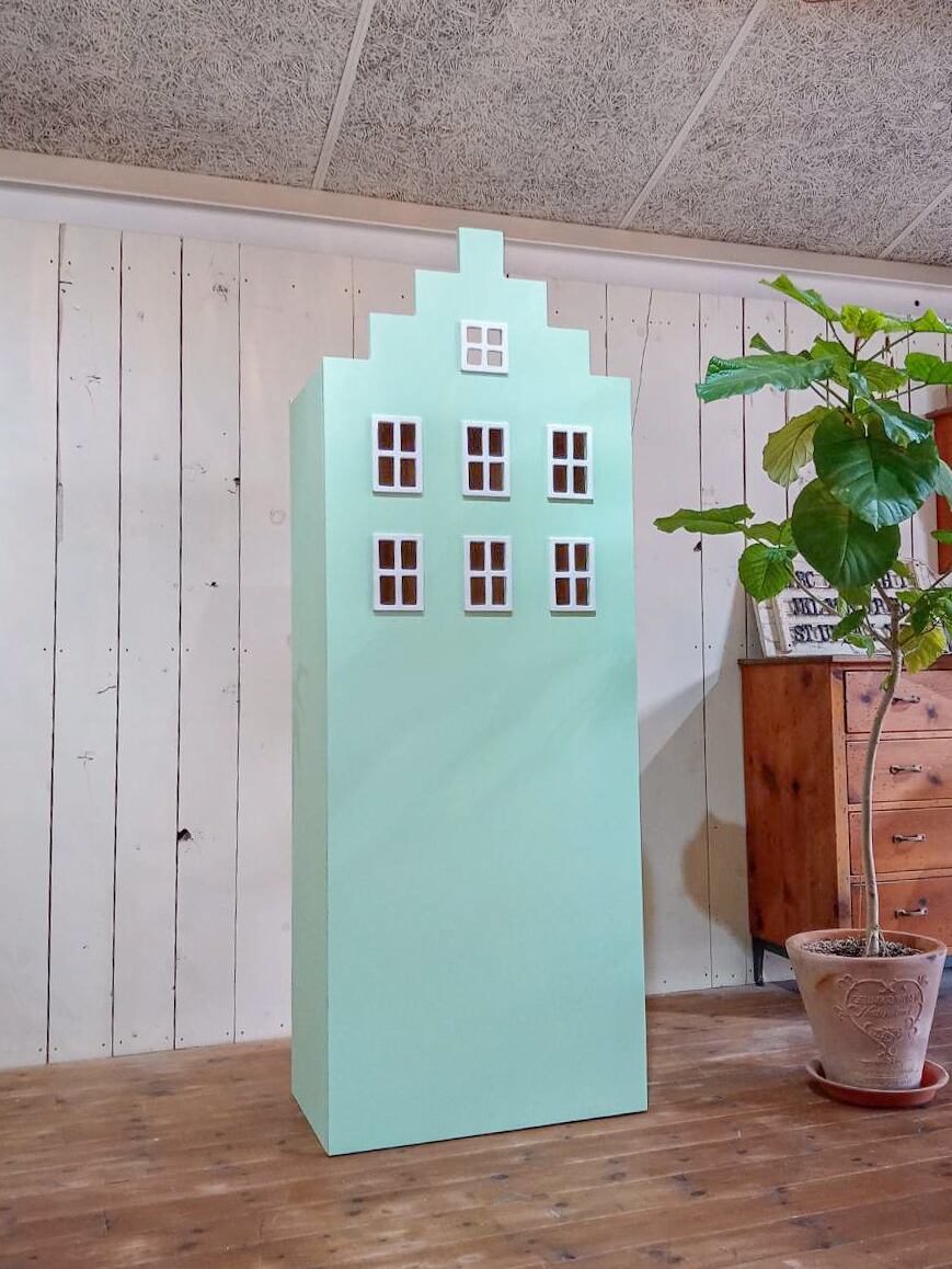 ヨーロッパの子供部屋を思わせるかわいいビル型のシェルフ。大きな扉を開けると棚が4段、子供服やおもちゃ、絵本の収納家具にいかがでしょうか♪基本カラー13色を酔いしておりますが、特注パステルカラーも対応可能です。