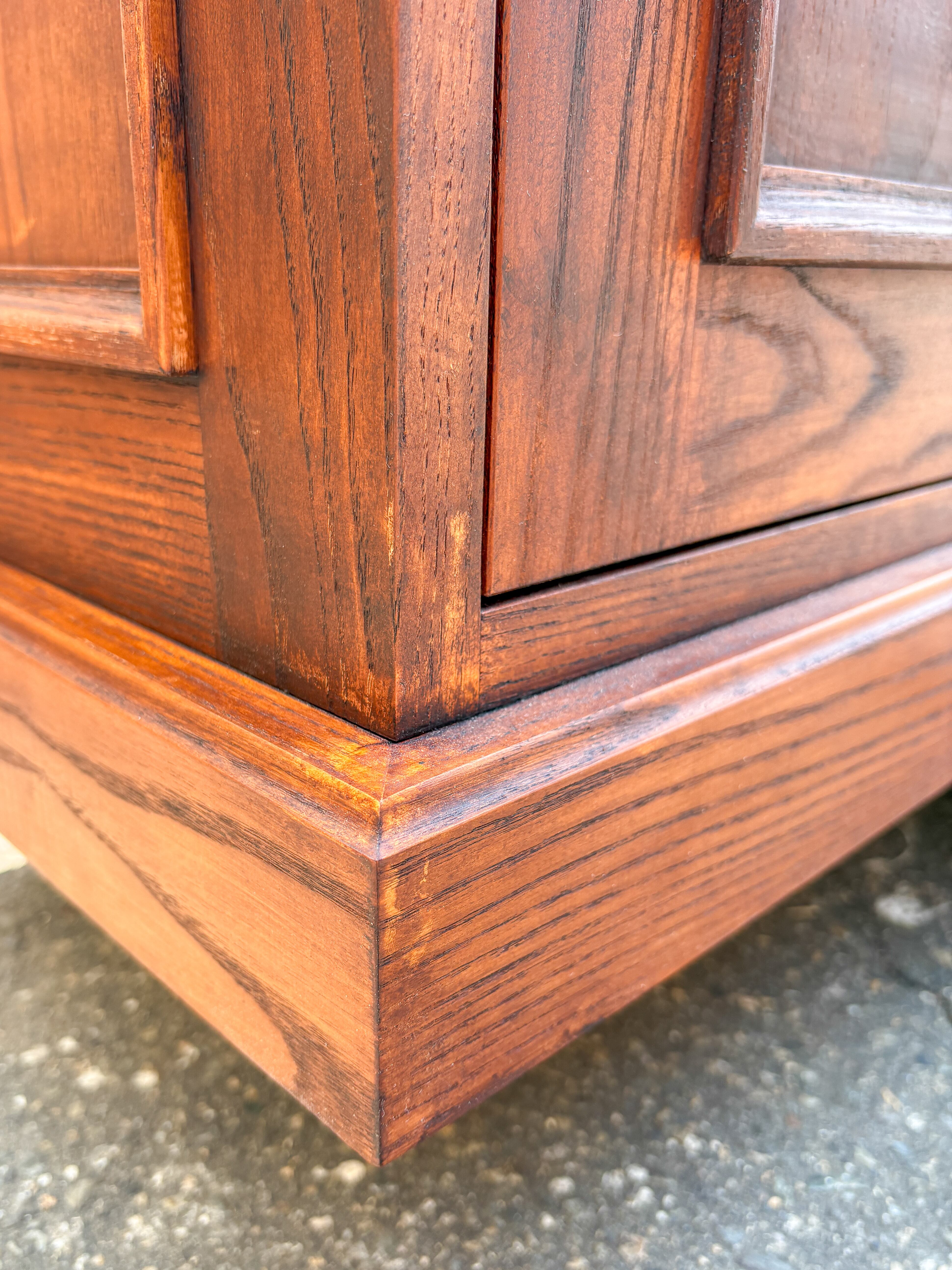 写真はW1800、D280、H880mm、結構な重量があるので自立します。W2400のキャビネットの上に載せれば、壁一面の豪華なディスプレイ什器になります。(キャビネットは別売)。写真は「アンティークブラウン色ワックス仕上げ」、ウッドカラーは8色をご用意しております。