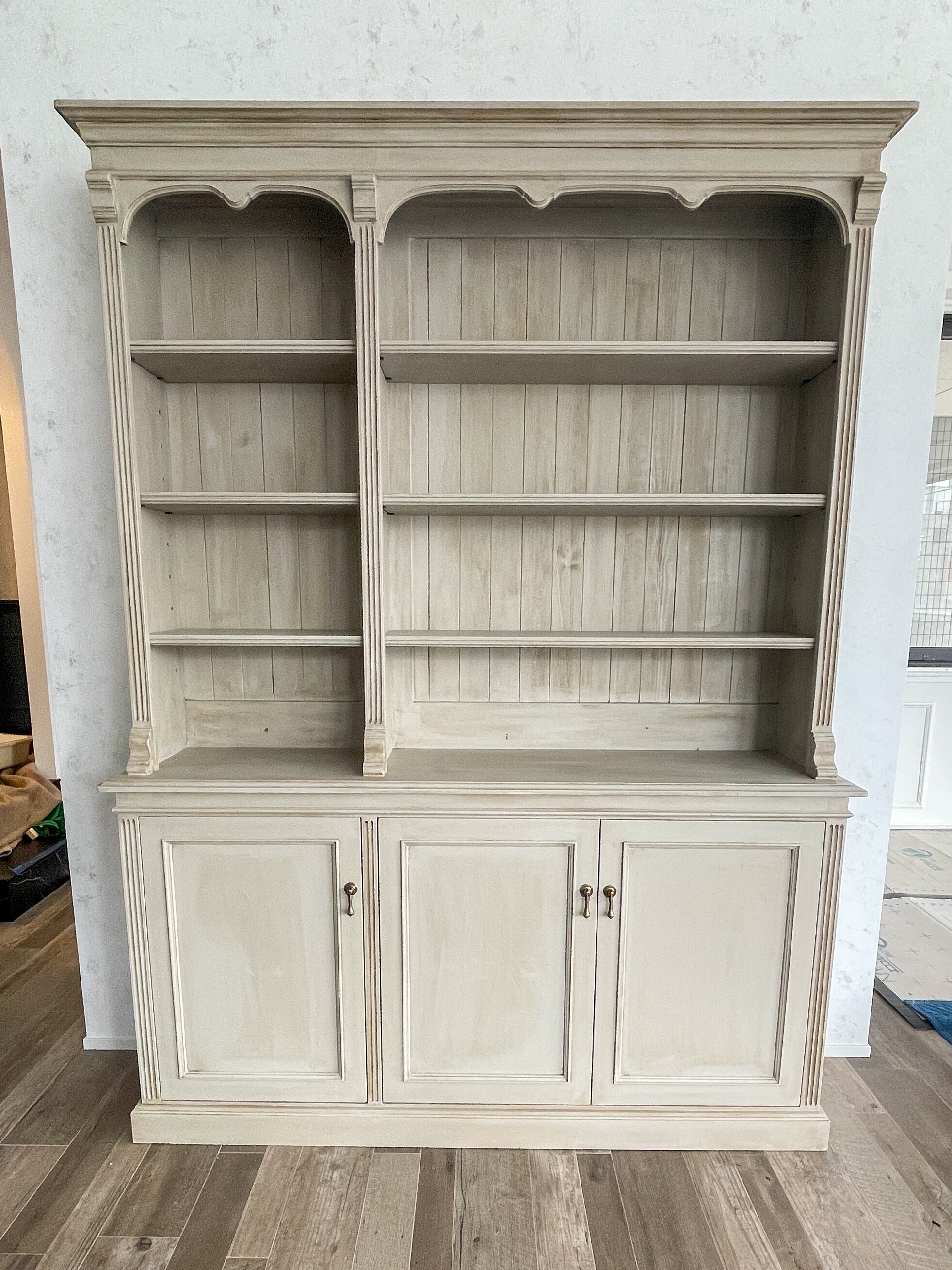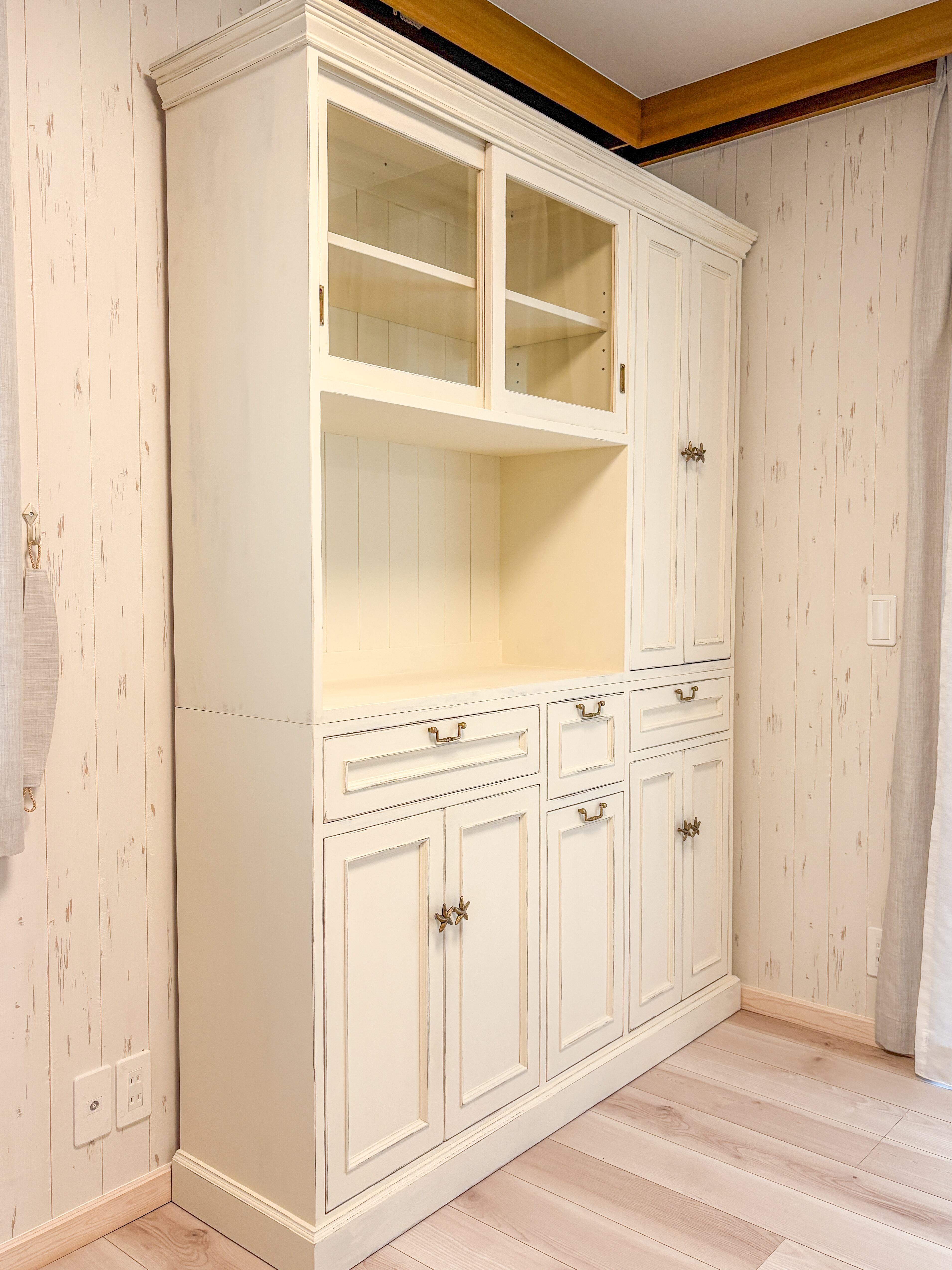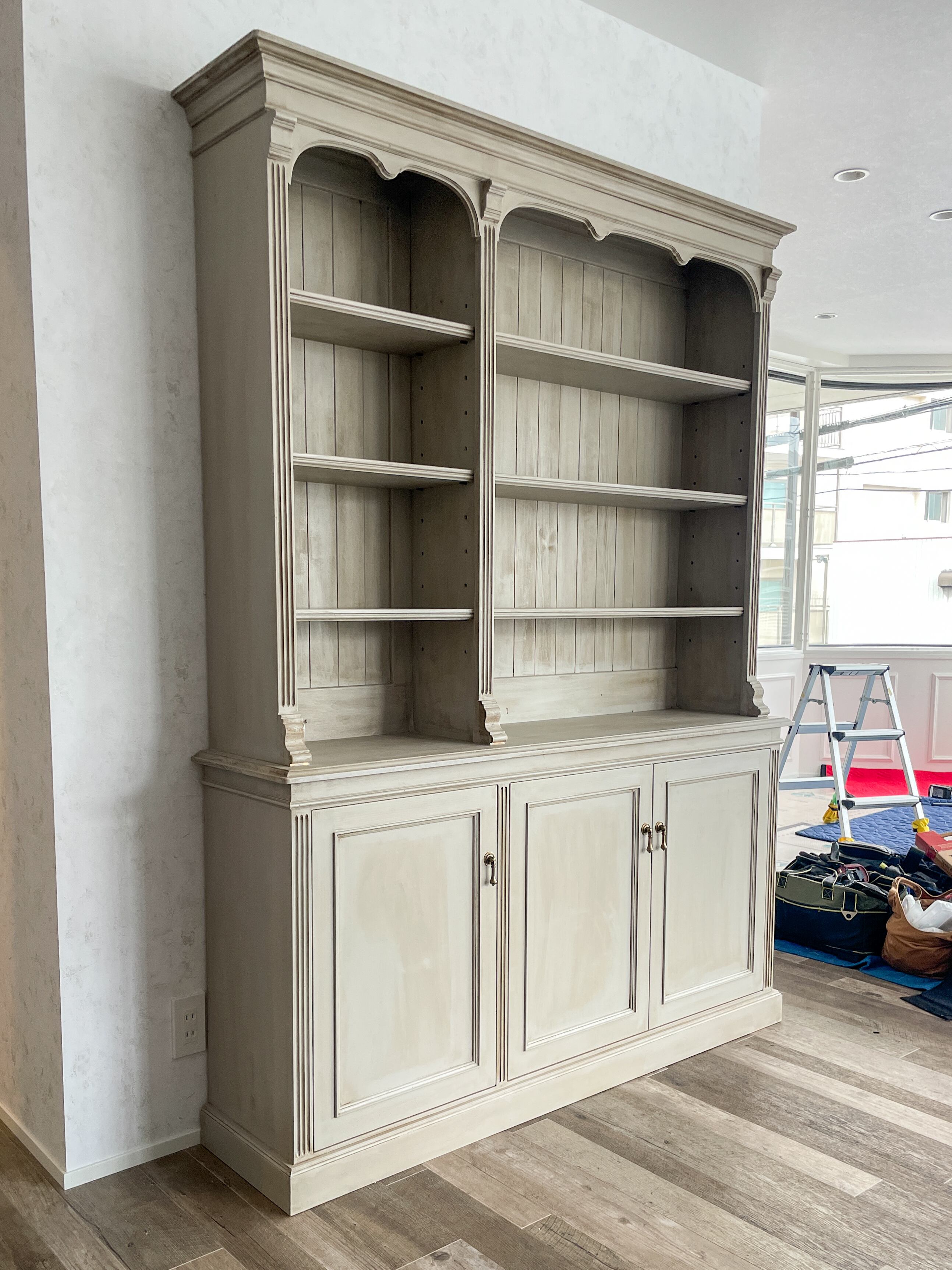 滋賀県のリノベ住宅に、アンティーク調デザインの食器棚をオーダーメイドさせていただきました。シーサイドデッキ風の壁紙やインテリアに合わせた、アンティークホワイトペイント仕上げ。あなたの理想を叶えるカップボードの製作は、オーダー家具の専門店グレイスファニチャーにお任せ下さい!