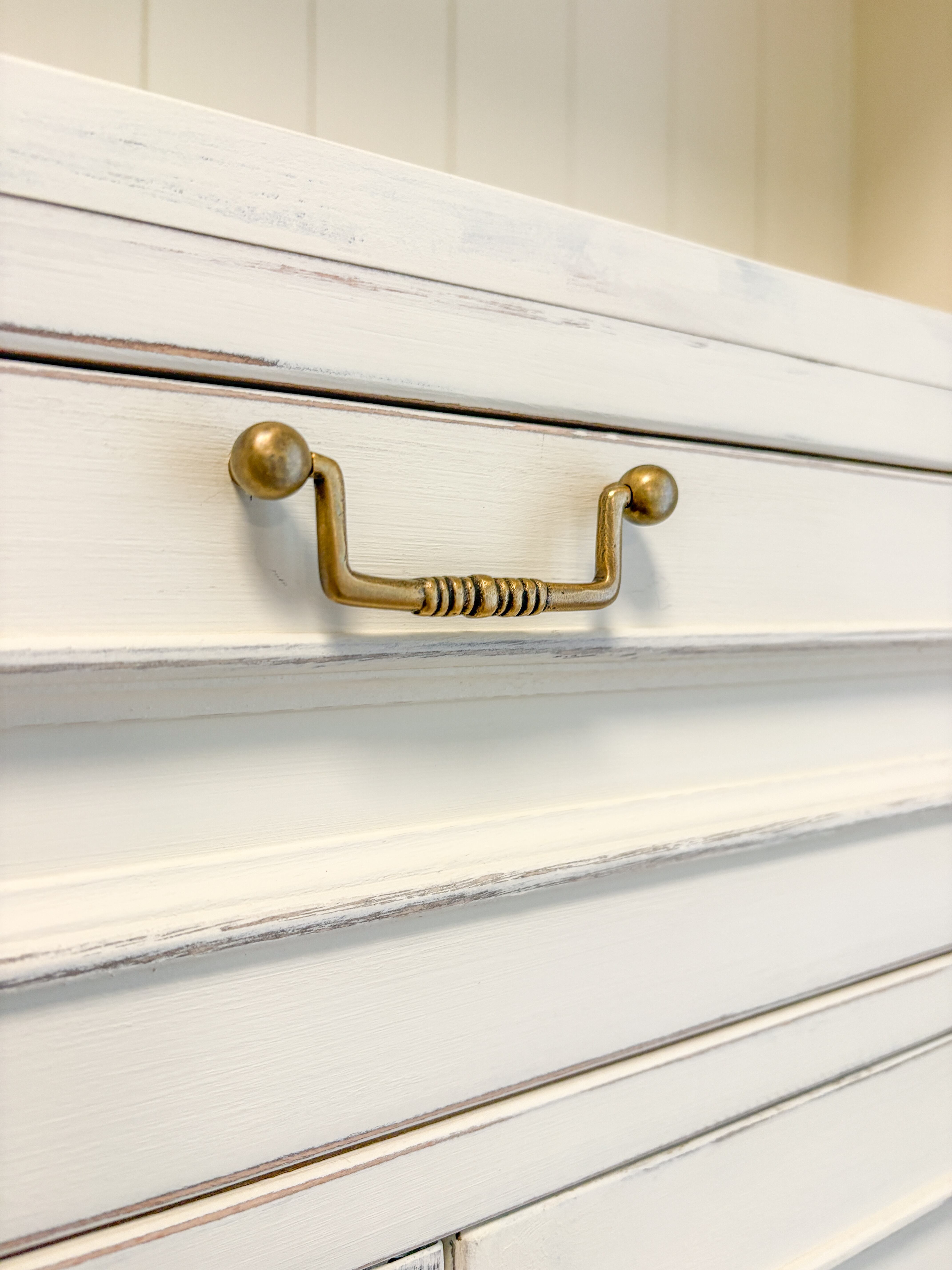 アンティーク感を表現するために、各所細かなところまでモールディングで立体的に装飾しました。写真はエイジングを塗装を施したアンティークホワイト色、他21色の基本カラーからもお選びいただけます。真鍮製の取手は、クラシックなものから個性的なデザインまで100種類以上のデザインから選べます。オーダー家具の製作実績は3500件以上、熟練の家具職人が一点一点手作りいたします。ご新築やお引越し、お店のオープンに、アンティーク調家具のオーダーメイドはグレイスファニチャーにお任せください。