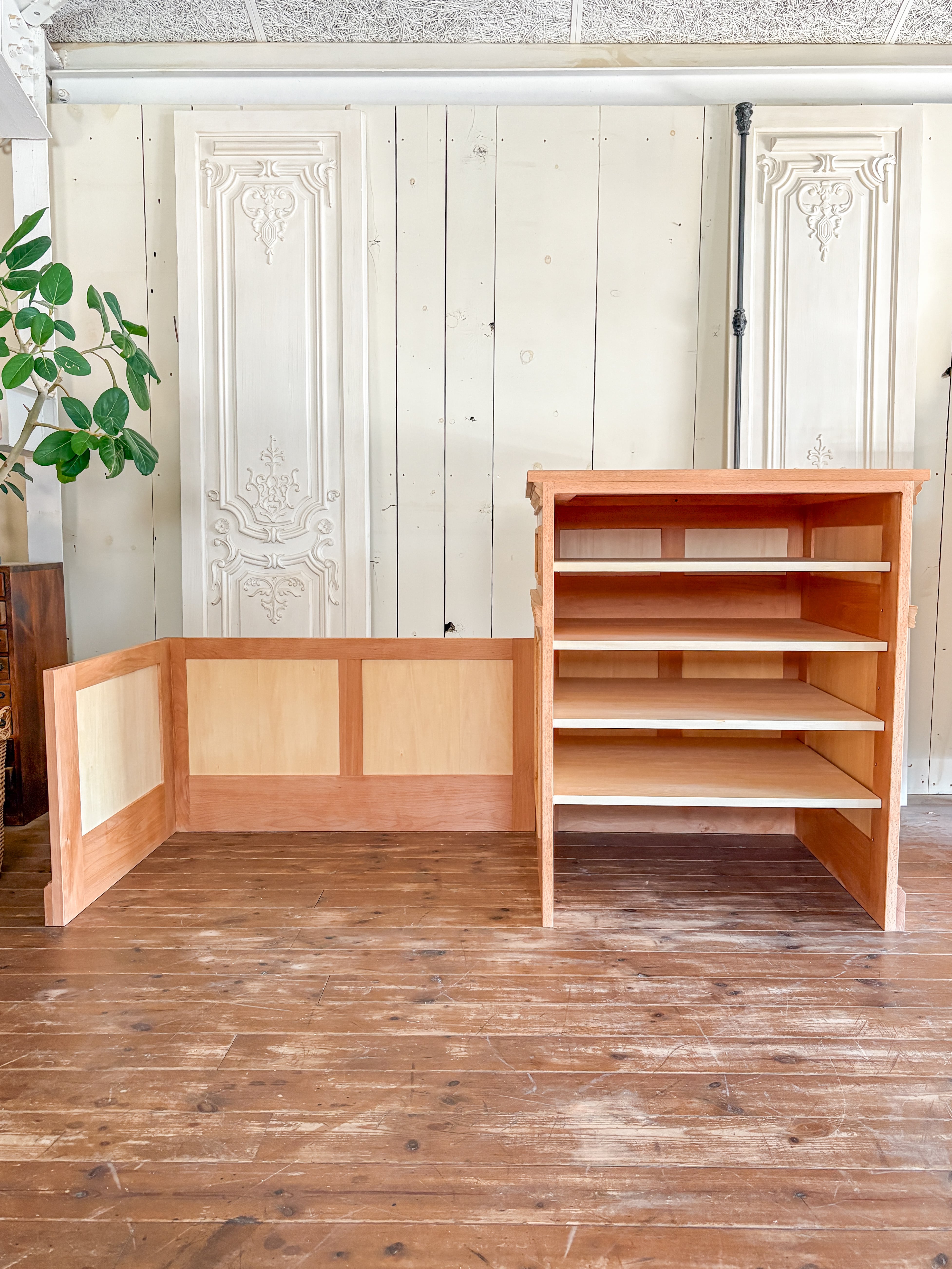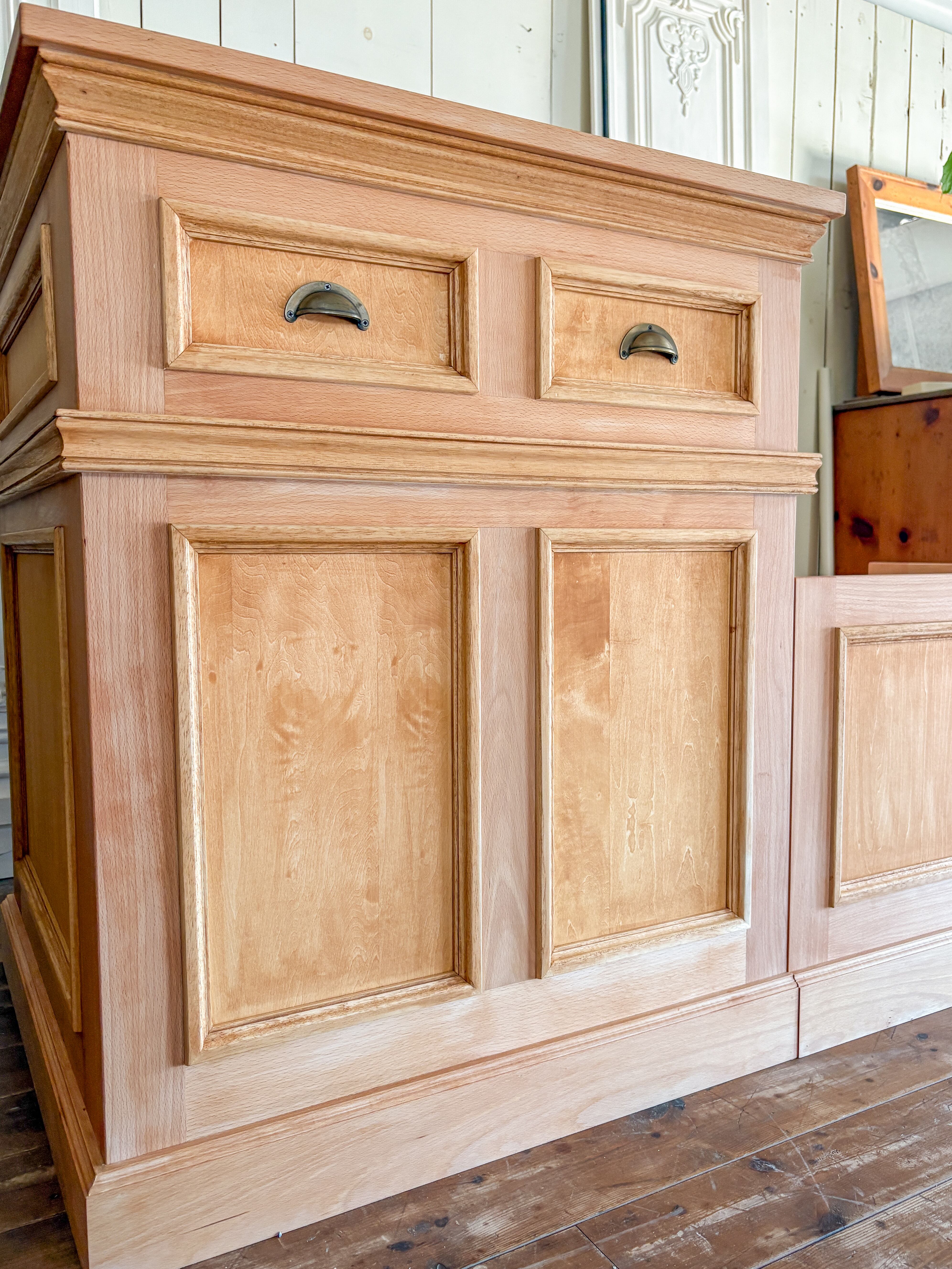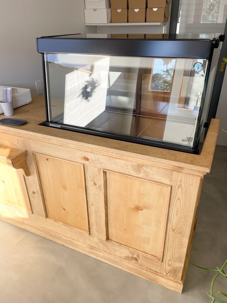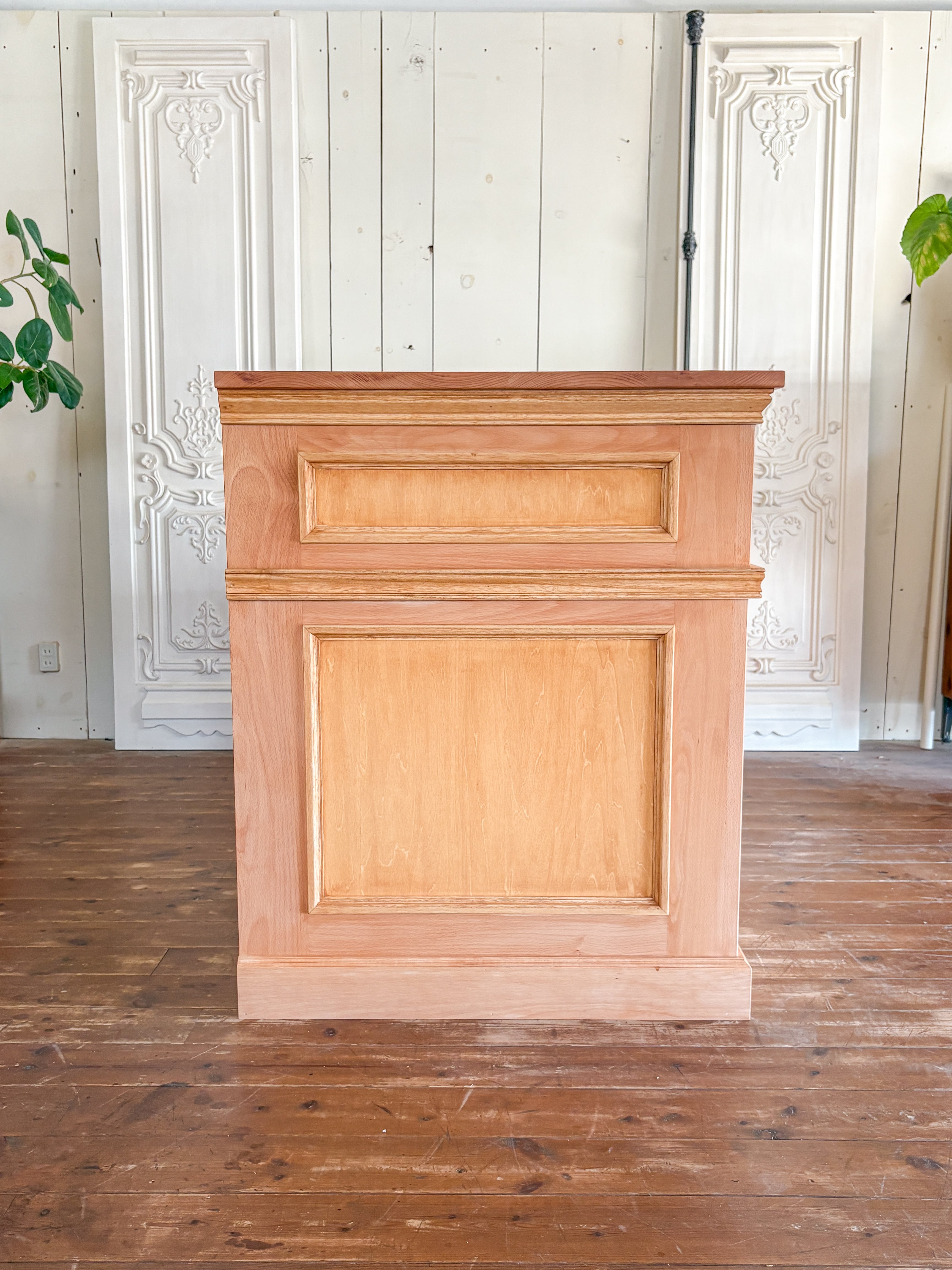 東京のティー専門カフェに納品させていただいた、冷蔵ショーケース向けカウンター。ビーチ無垢材を使ったウッドカウンターで、高級感のあるアンティーク調デザインの店舗家具です。W900mm幅の床置き式冷蔵ショーケースに合わせてサイズオーダー致しました。入口でお客様を迎える、お店の顔になるインテリアの製作、グレイスファニチャーにお任せ下さい。