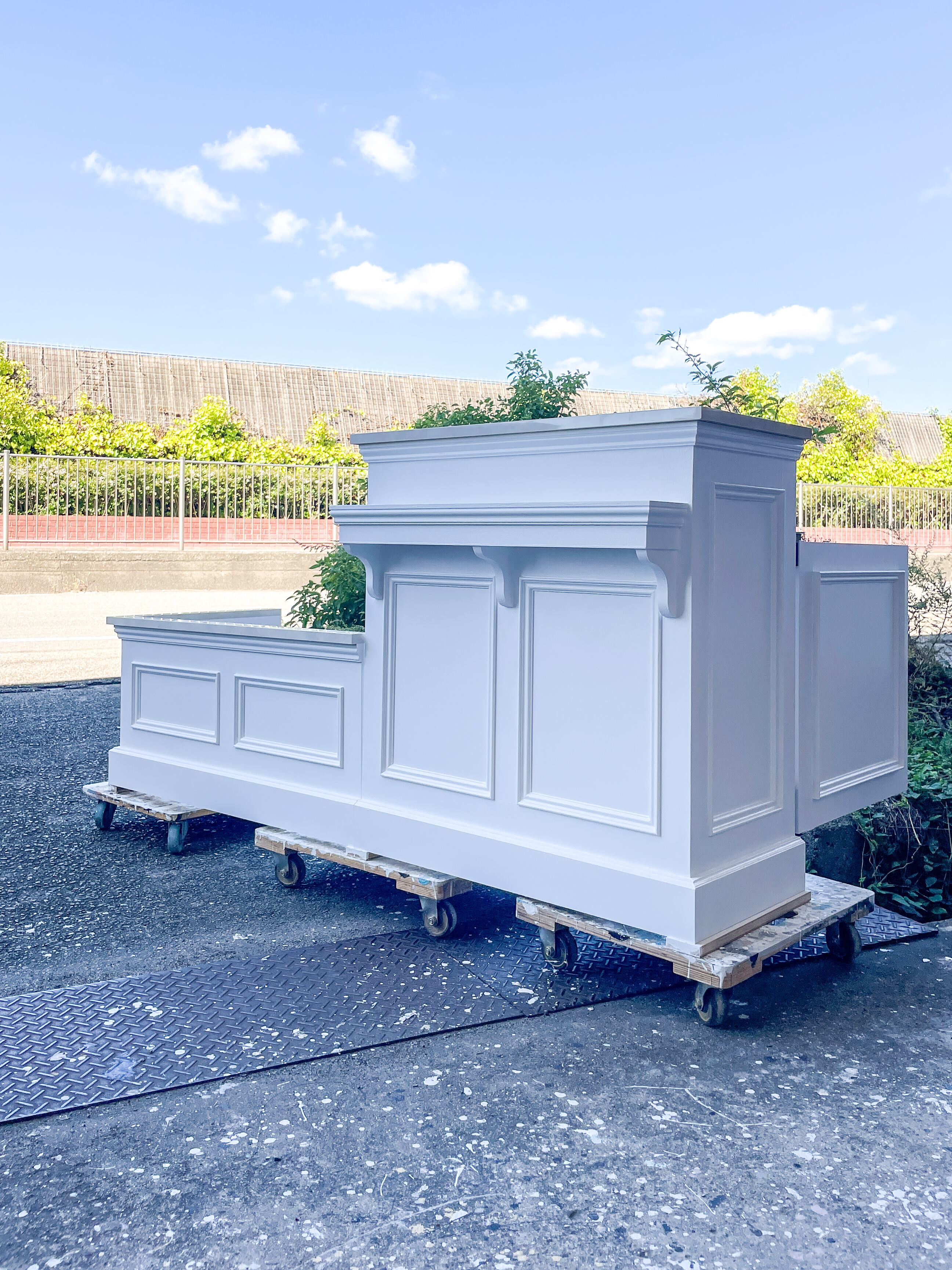 写真はW900の床置き式冷蔵ショーケースを収めて、総幅1700mmのカウンター。高さは900mmで腰くらいの高さです。お持ちの冷蔵ショーケースや、お店の広さ、業務に応じたサイズオーダーを致します。モールディング装飾や大理石天板を使って、高級感がありかわいいアンティーク調デザインの店舗家具を専門に製作しています。お色は写真のホワイト以外に、13色からお選びいただけます。