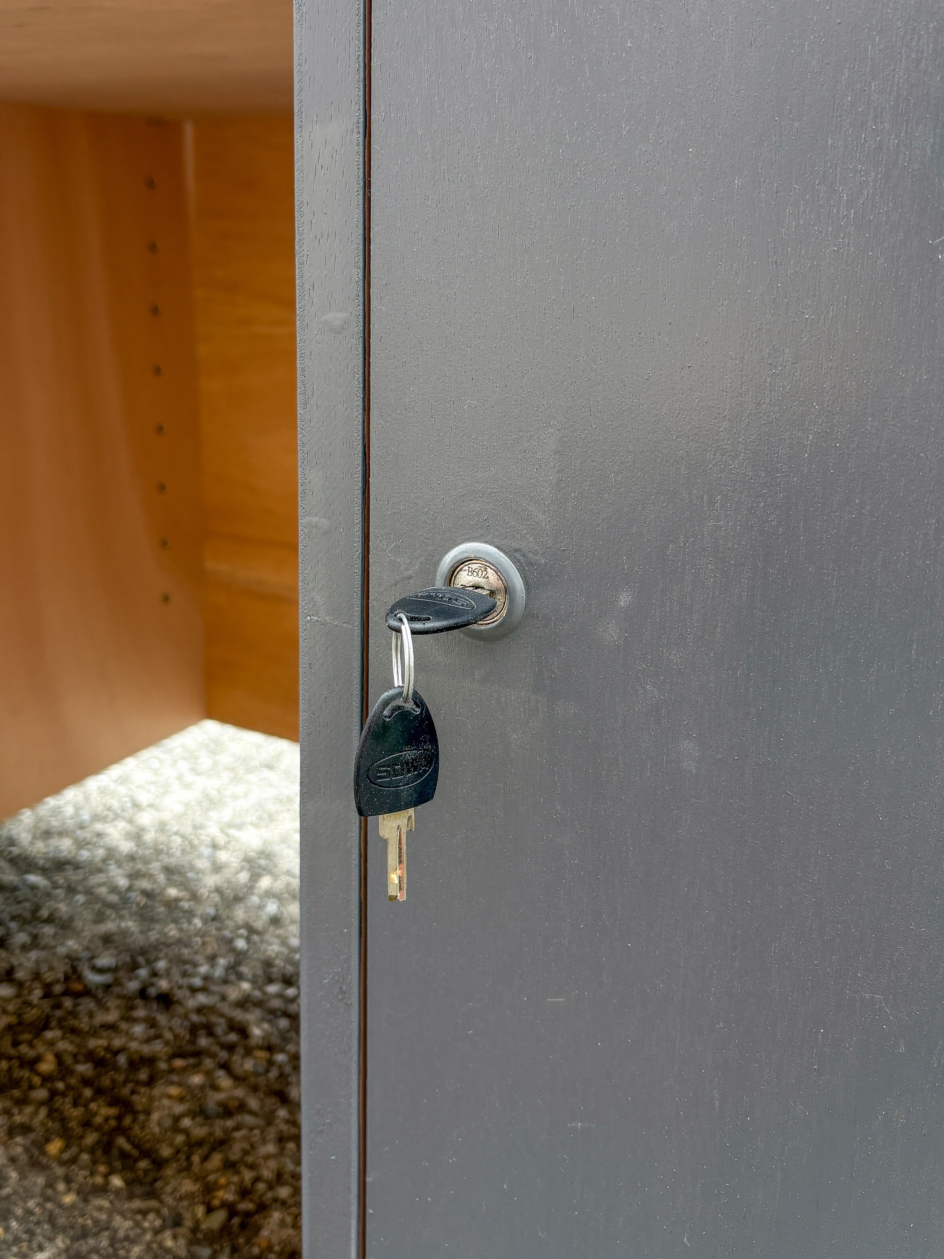 写真はW1800、奥行き600、高さ1100mmの大きな受付カウンター。サイズオーダーも承ります。内側の収納は、引き出し、スライド扉、鍵付き扉、オープン棚など様々なカスタマイズに対応いたします。写真は浅い引出し✕4、開ける動作が楽なスライド扉収納、足元が自由なオープン可動棚、鍵付きの扉です。貴店の業務に合わせた収納機能で特注製作します。