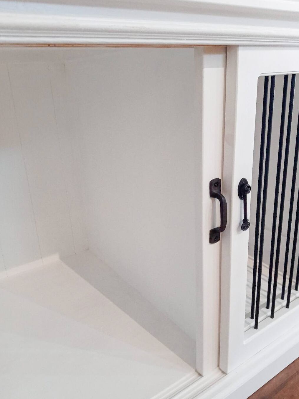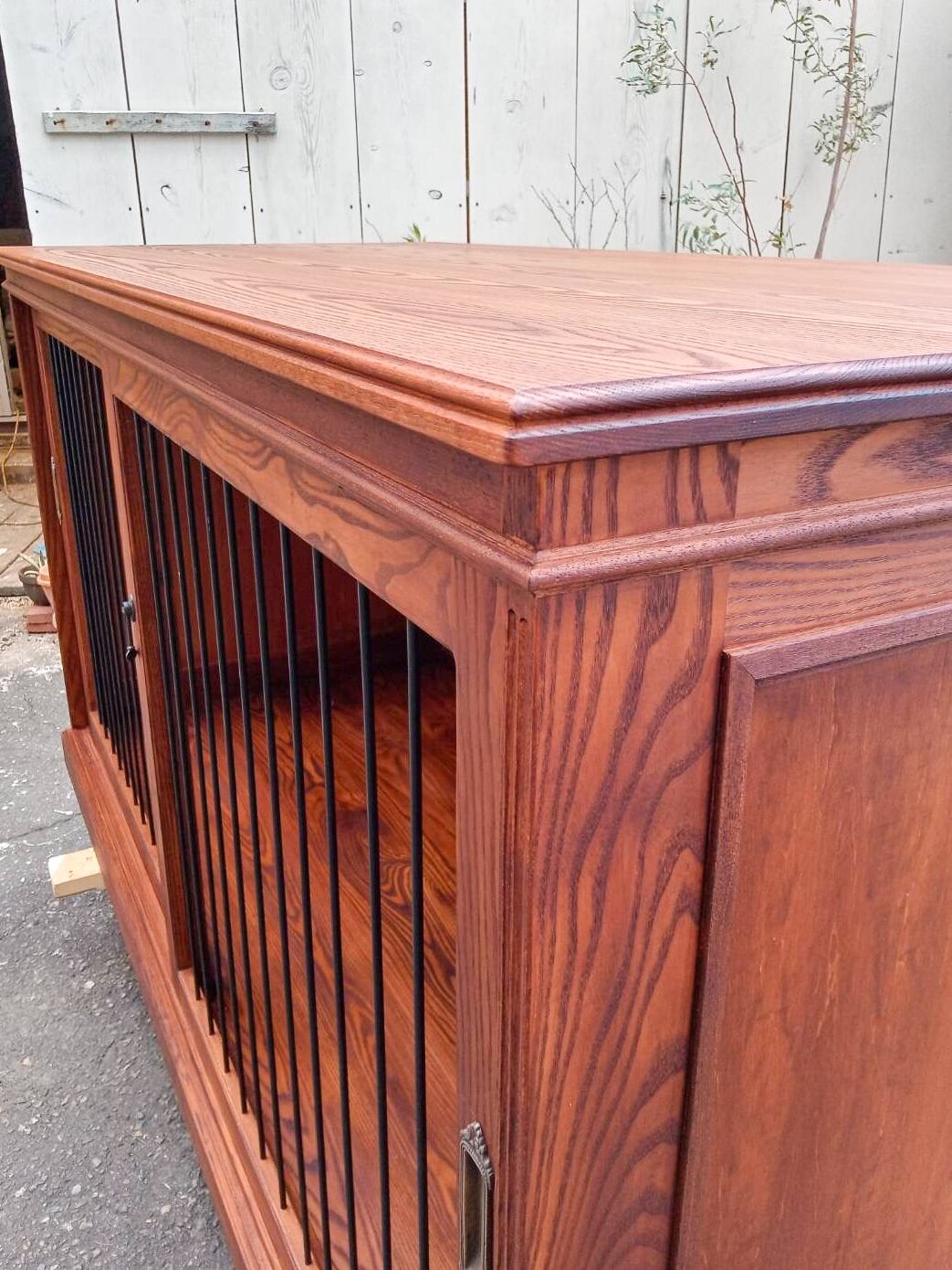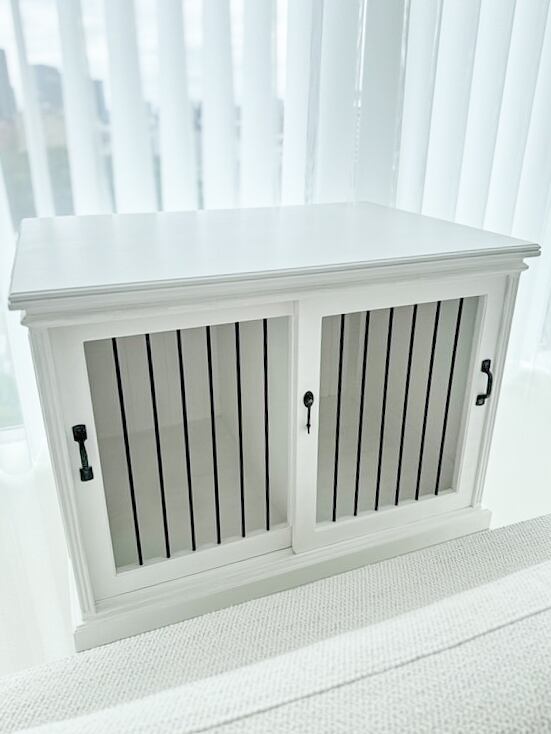 詳細紹介画像のサイズはW820、D580、H590(mm)、中央に仕切り板があって、左右の空間は別れています。クレートを2個収納できるサイズカスタムをした1点です。アイアンフェンスのスライド扉は鍵付きで、施錠できます。金具は黒、ゴールド、シルバーなど様々なものを用意しております。