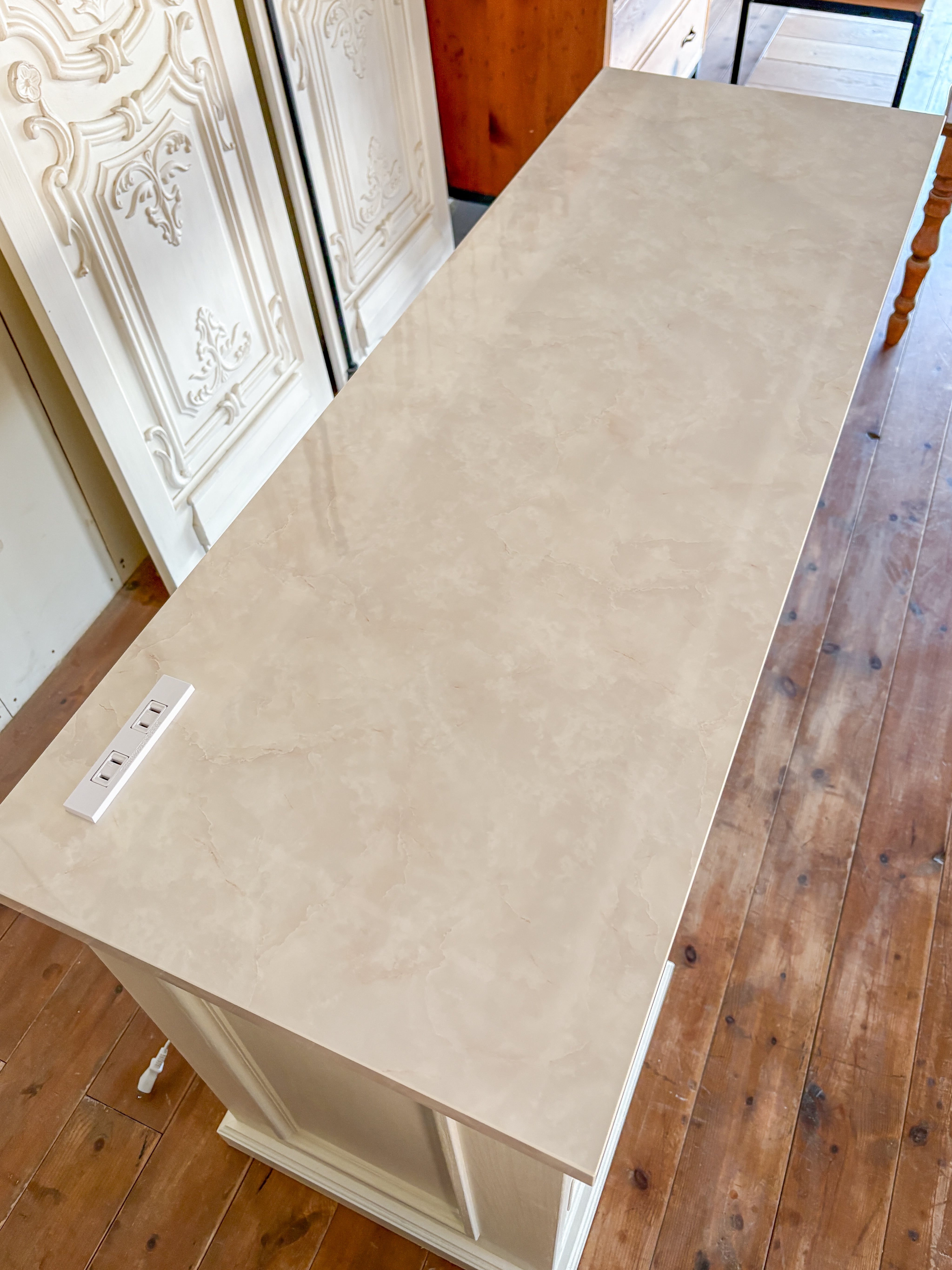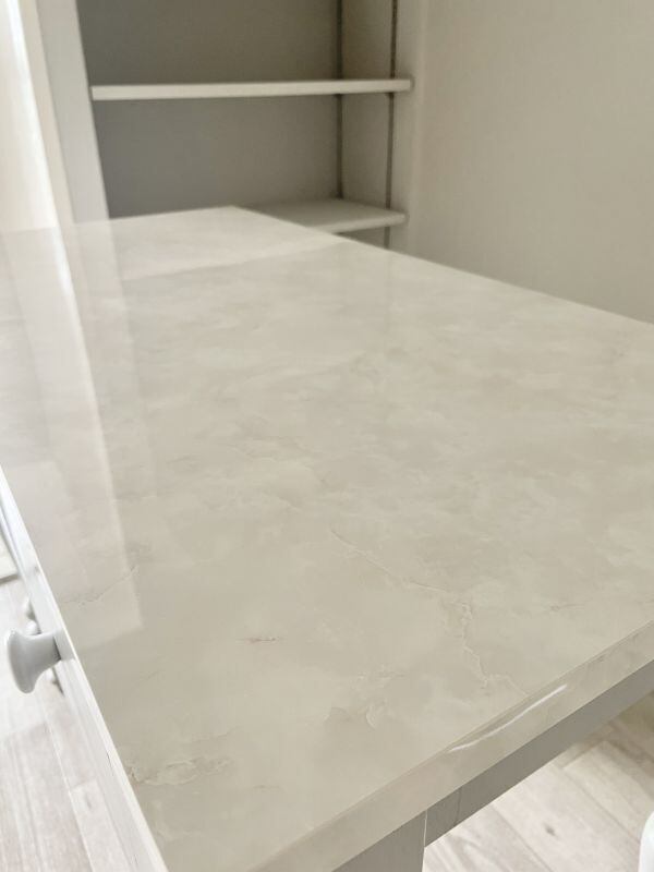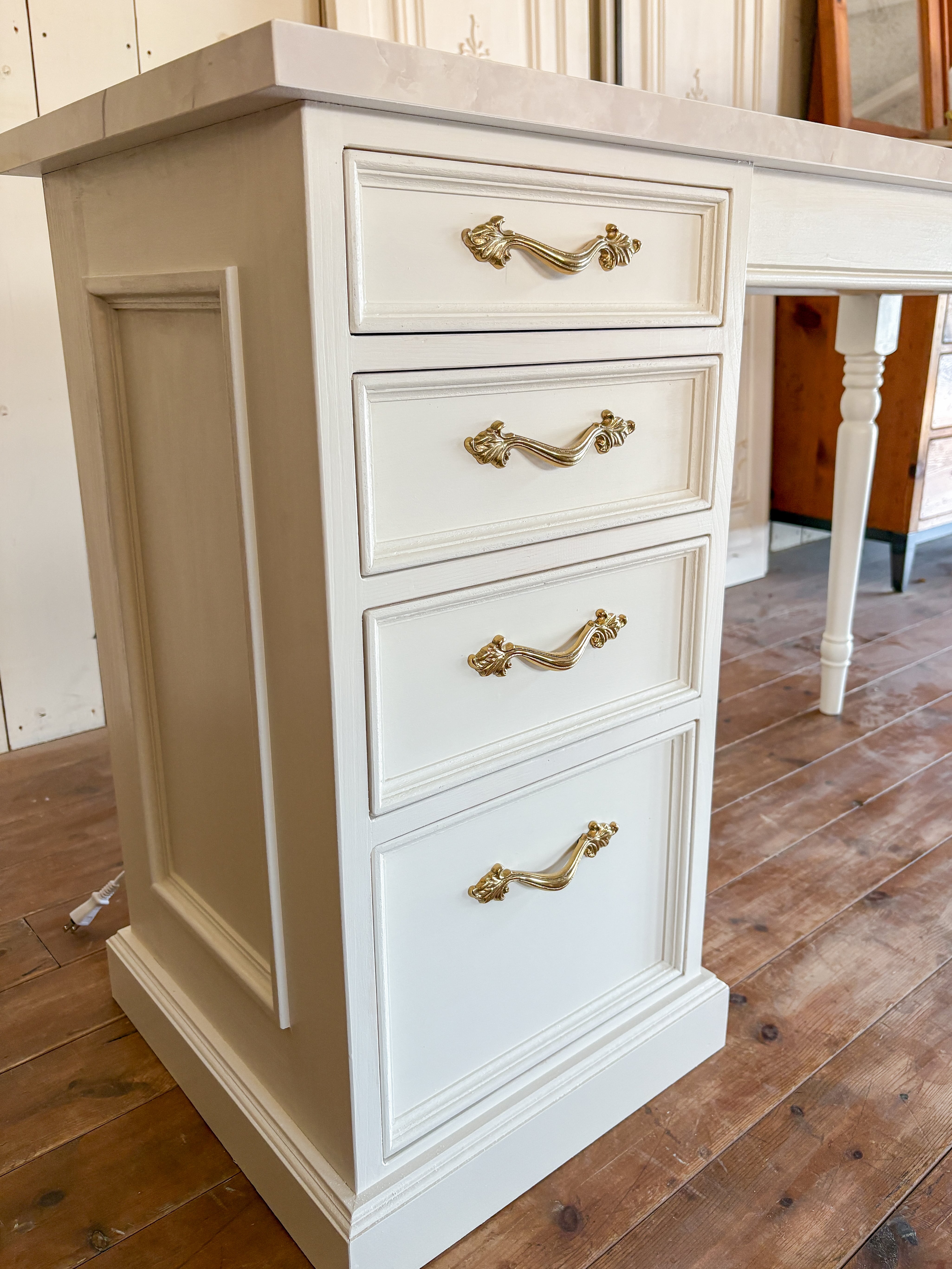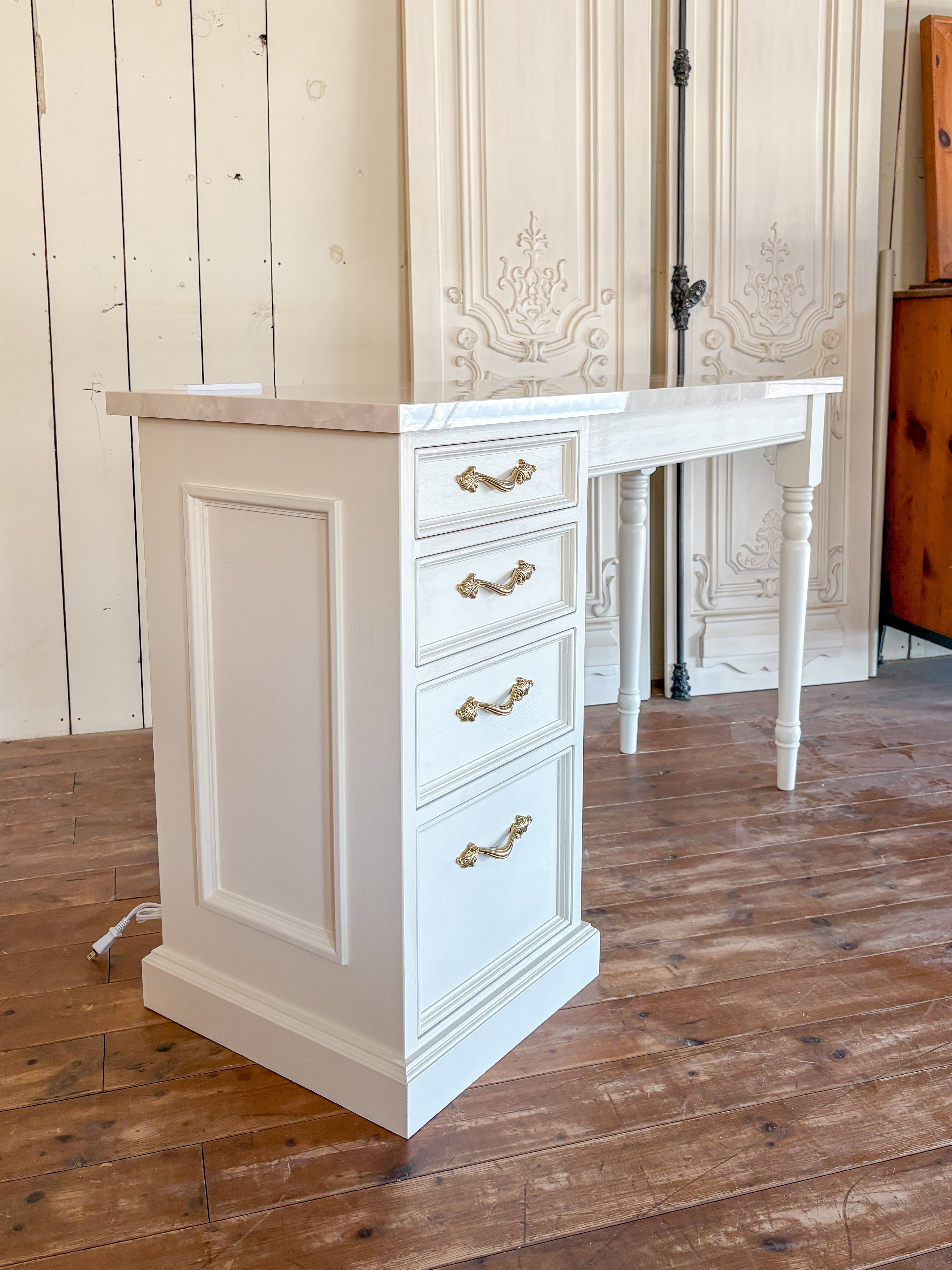 東京のオーナー様宅に、大理石天板のかわいいドレッサーを製作させていただきました。ろくろ足とチェストが付いたアンティーク調デザインの片袖デスク。天板には大理石柄のメラミンを採用して、アセトンやアルコールの使用に対応。ご家庭用はもちろん、ネイルサロンのネイルテーブルにもおすすめです。