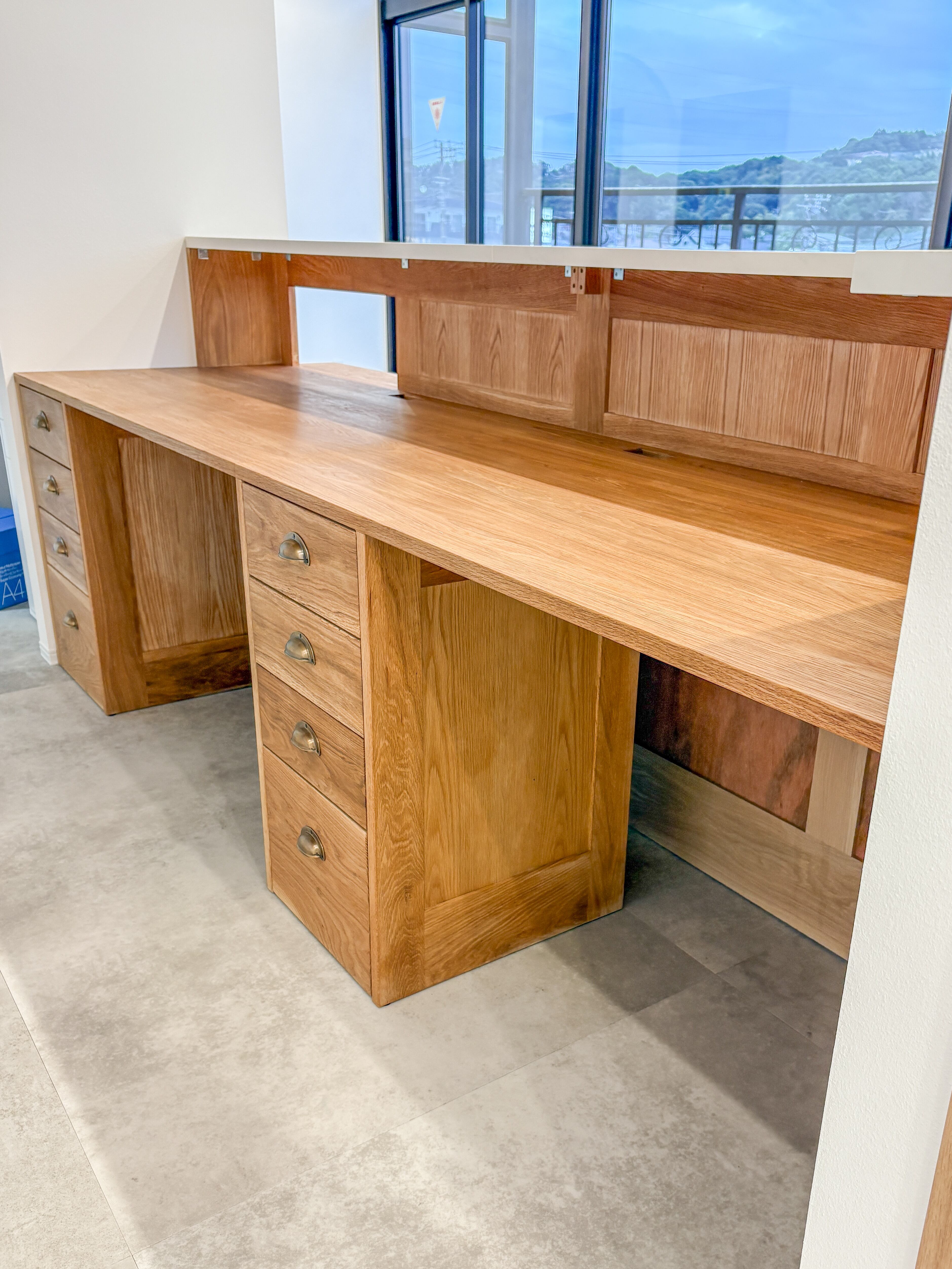 神奈川県で移転する医院の受付カウンターを、オーダーメイドさせていただきました。優しい雰囲気で、落ち着く待合室づくりのために、天然木ホワイトオーク材で作りました。シンプルでいて豪華な見た目のアンティーク調デザインの受付カウンターです。