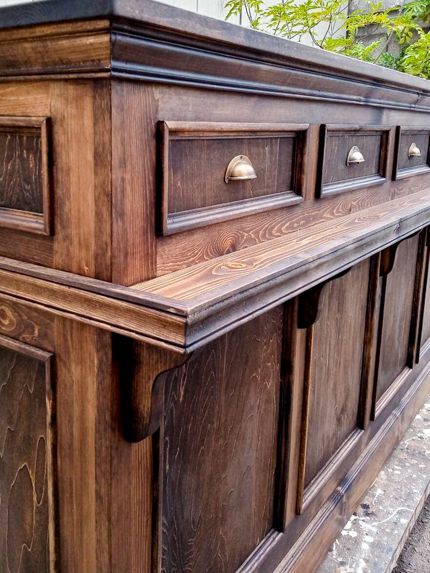 写真はW2730mmサイズ、大きなレジカウンターの特注製作はグレイスファニチャーにお任せください。正面腰くらいの高さにシェルフが付いていて、お会計時の荷物置きや、ディスプレイに活躍します。内側には大きなチェストを2台設置。引出し以外に、扉、棚、スライドテーブルなどカスタマイズできます。