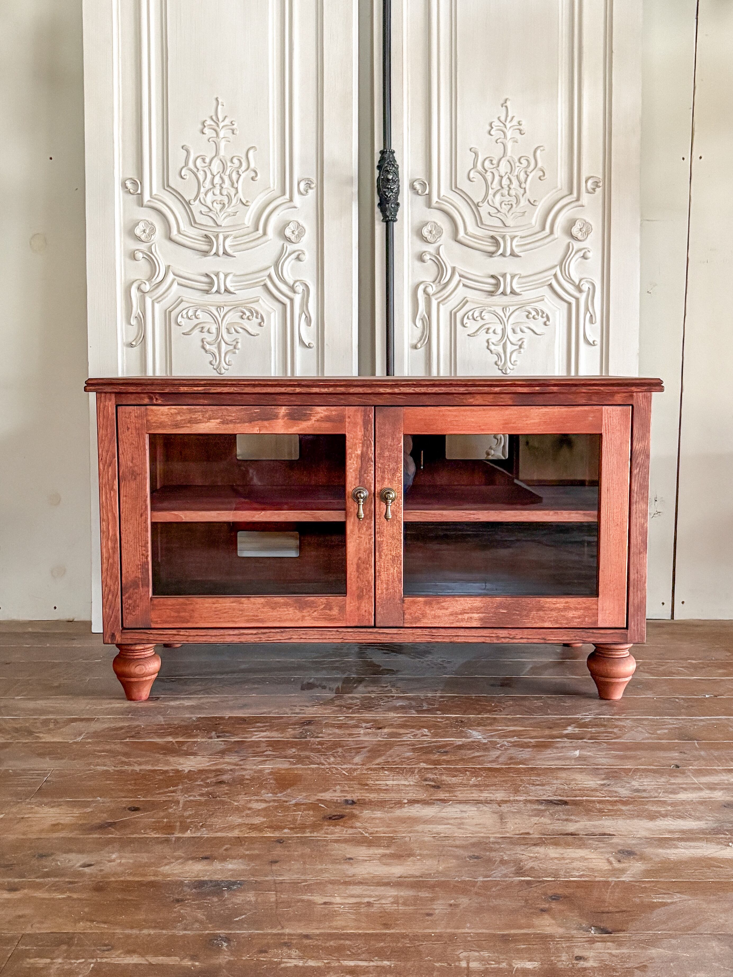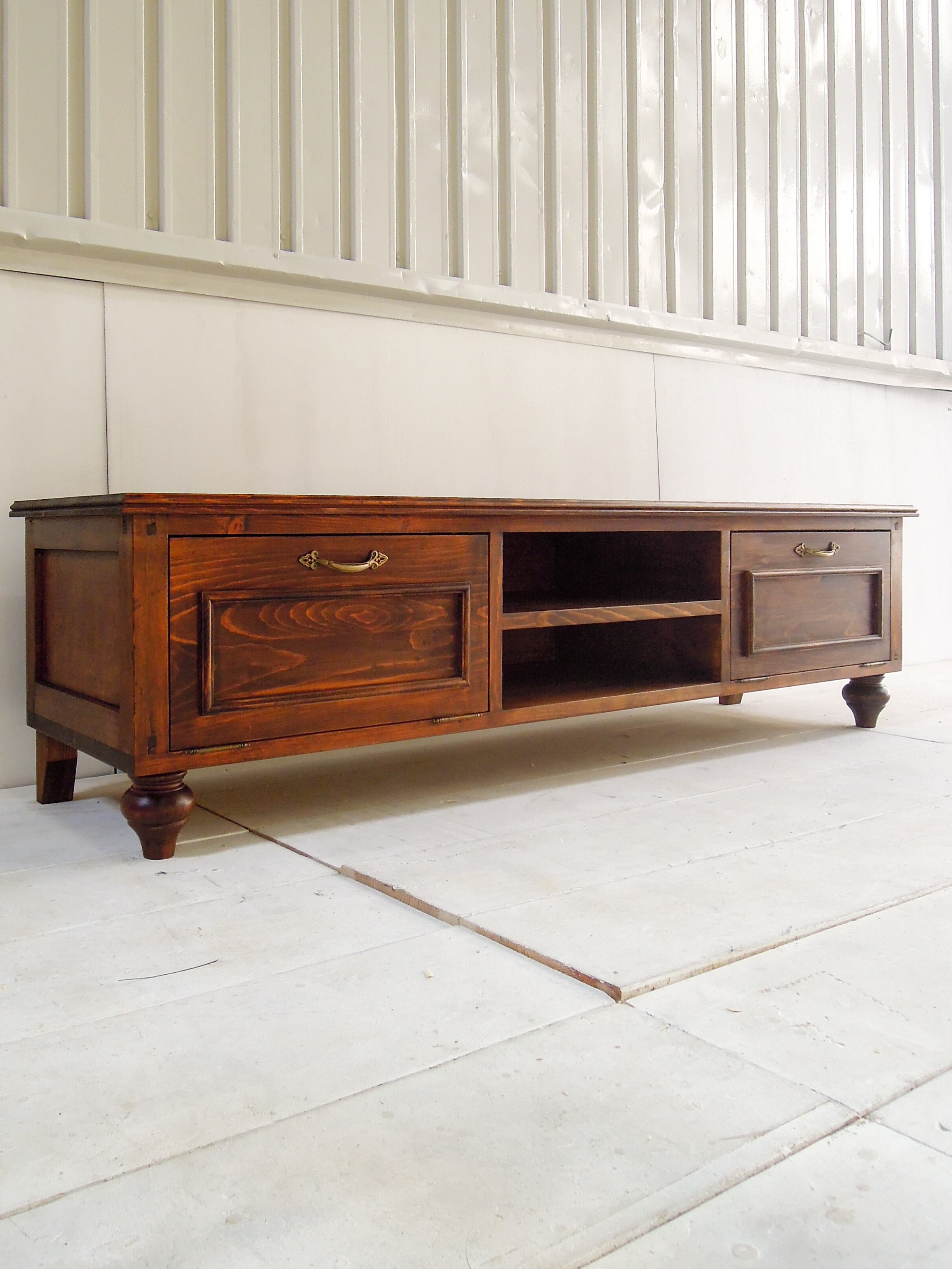 パイン無垢材で製作したガラスキャビネット。兵庫県のオーナー様にオーダーメイドさせていただきました。ろくろ足やモールディング加工を施したレトロなデザインのテレビ台。輸入住宅や洋書スタイルインテリアによく似合うアンティーク調インテリアをお探しの方は、グレイスファニチャーにお任せください。