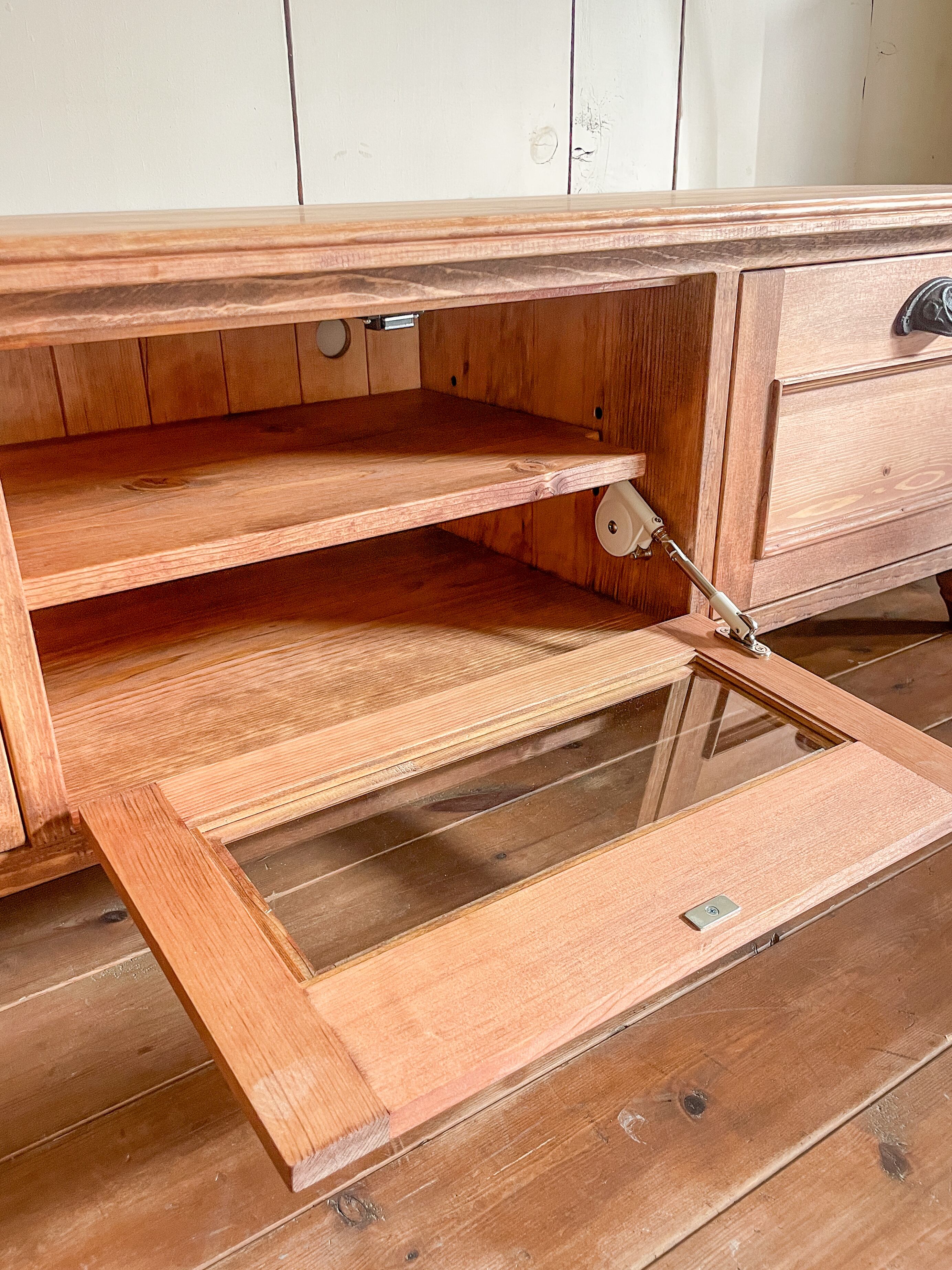 ガラス扉に真鍮の取っ手のコンビがとってもかわいいテレビキャビネットです。