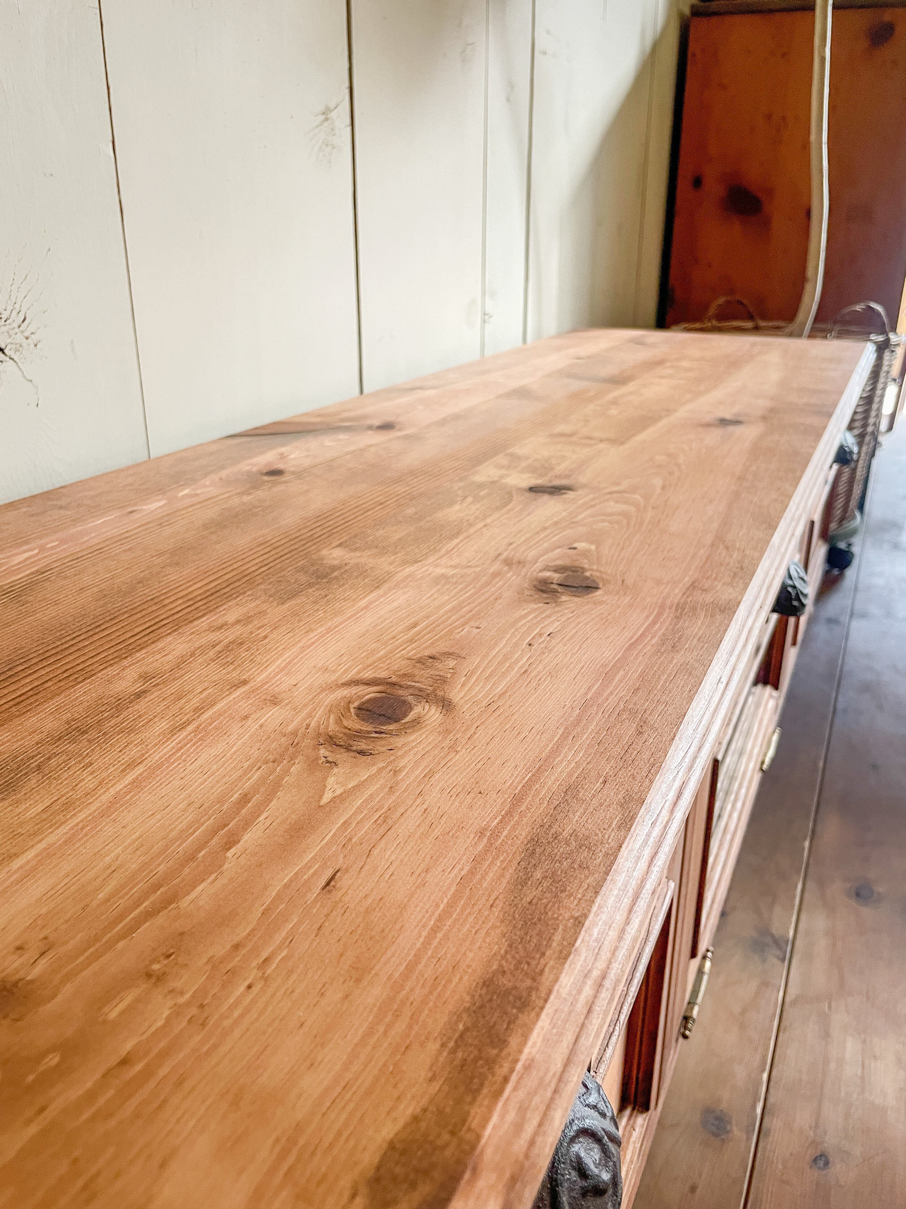 パイン材は、松の木です。柔らかく加工がしやすいため、古くから世界中で住居や家具の材料として使われてきました。丸い節がほぼ全面にあり、木材内部に松脂などの油分を多く含みます。柔らかいため傷がつきやすく、反りも起こりやすいですが、ひび割れはほとんど見られません。繊維内の油分が酸化することで色が経年変化しアメ色に変わるとよく言われます。ペンキで塗装した場合は、木材の痩せによる塗装割れ、松脂が表面に出て変色するなどの減少が起きます。