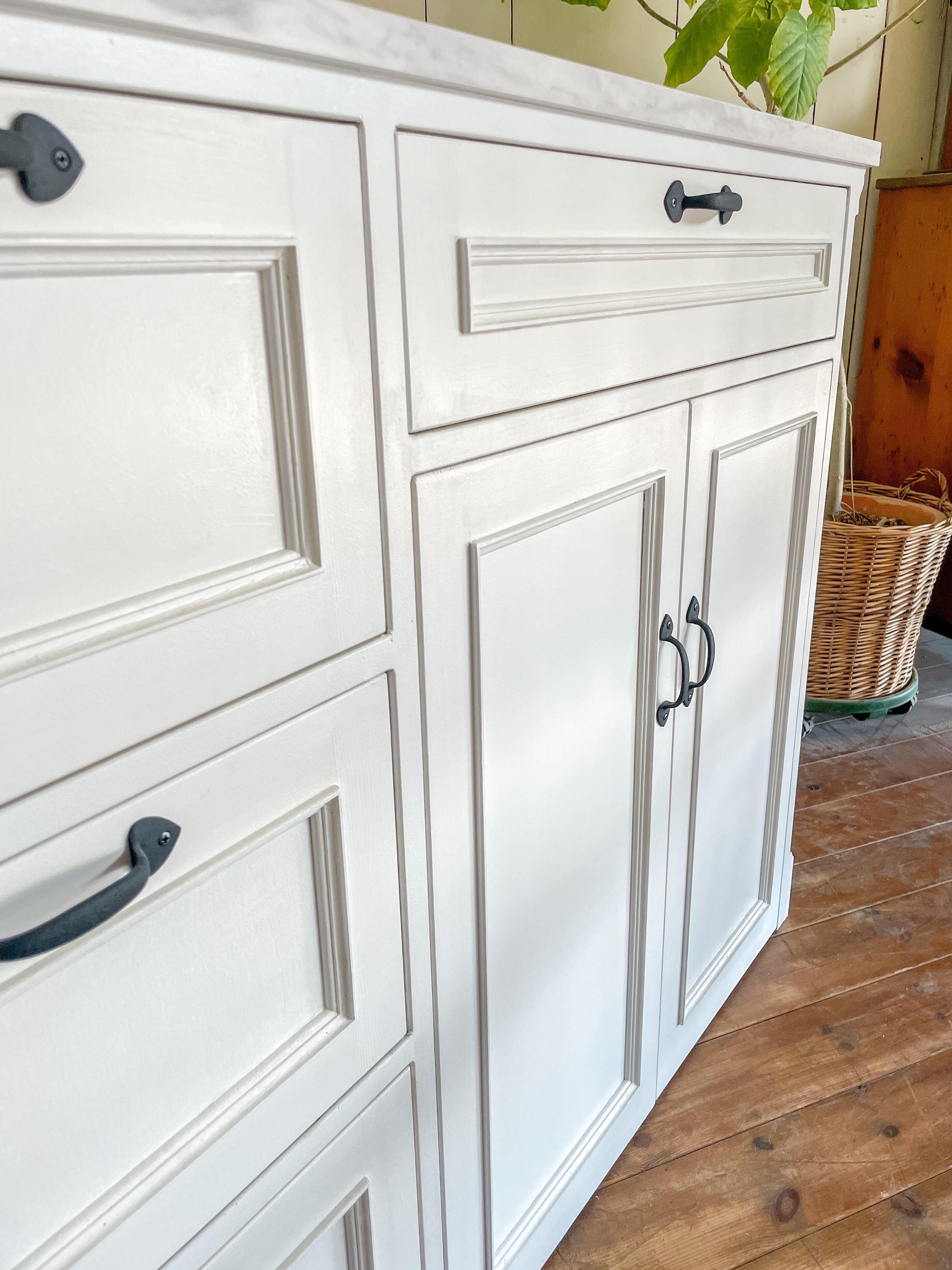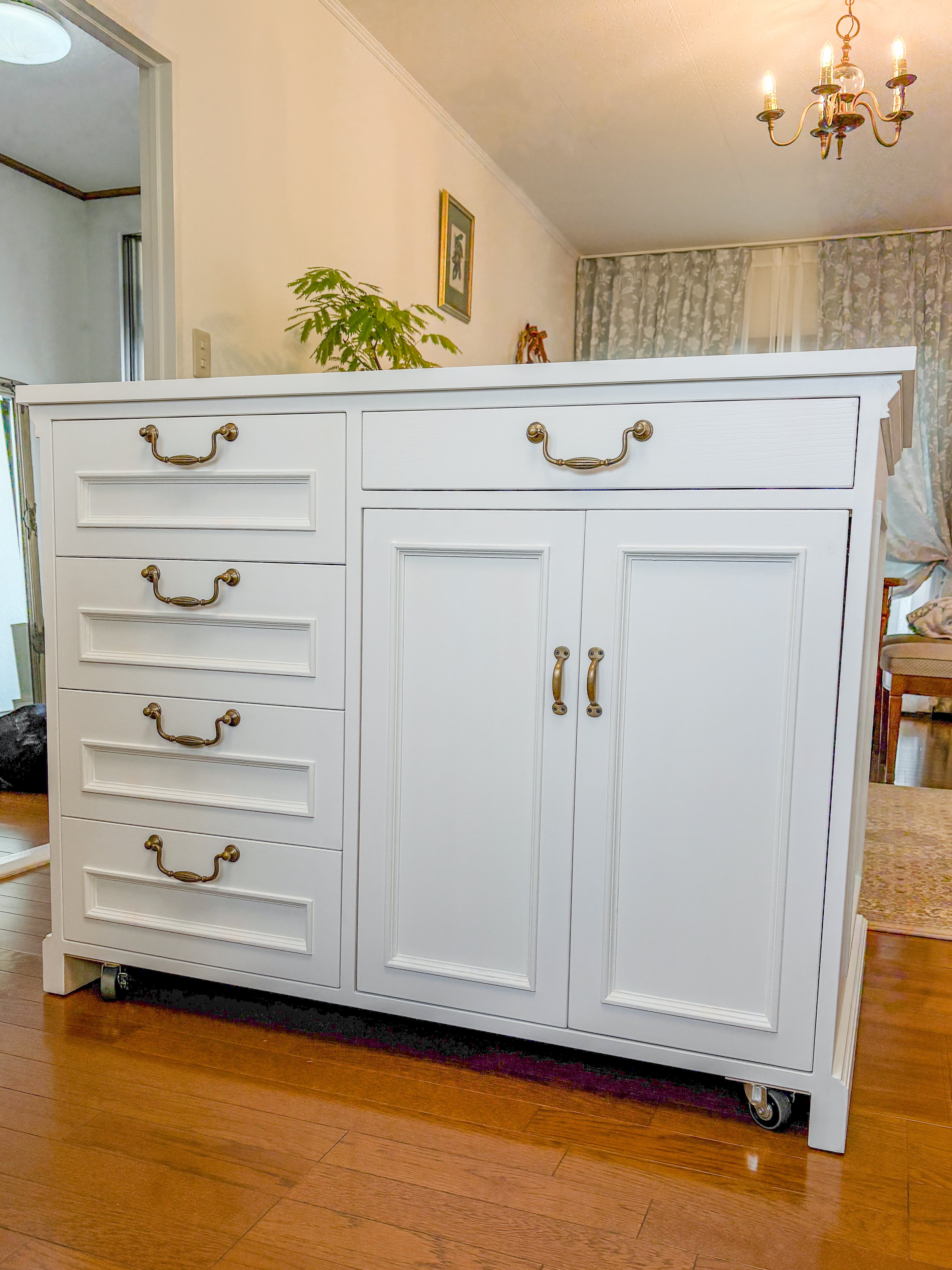 写真はホワイト色、アンティーク調デザインの真鍮金物がかわいくマッチしました。他基本カラー21色から選べます。熟練の日本人家具職人が一点一点製作いたします。日本全国に家具専門デリバリーで設置搬入致します。お宅に合わせたインテリアのオーダーメイド、お気軽にご相談くださいませ。