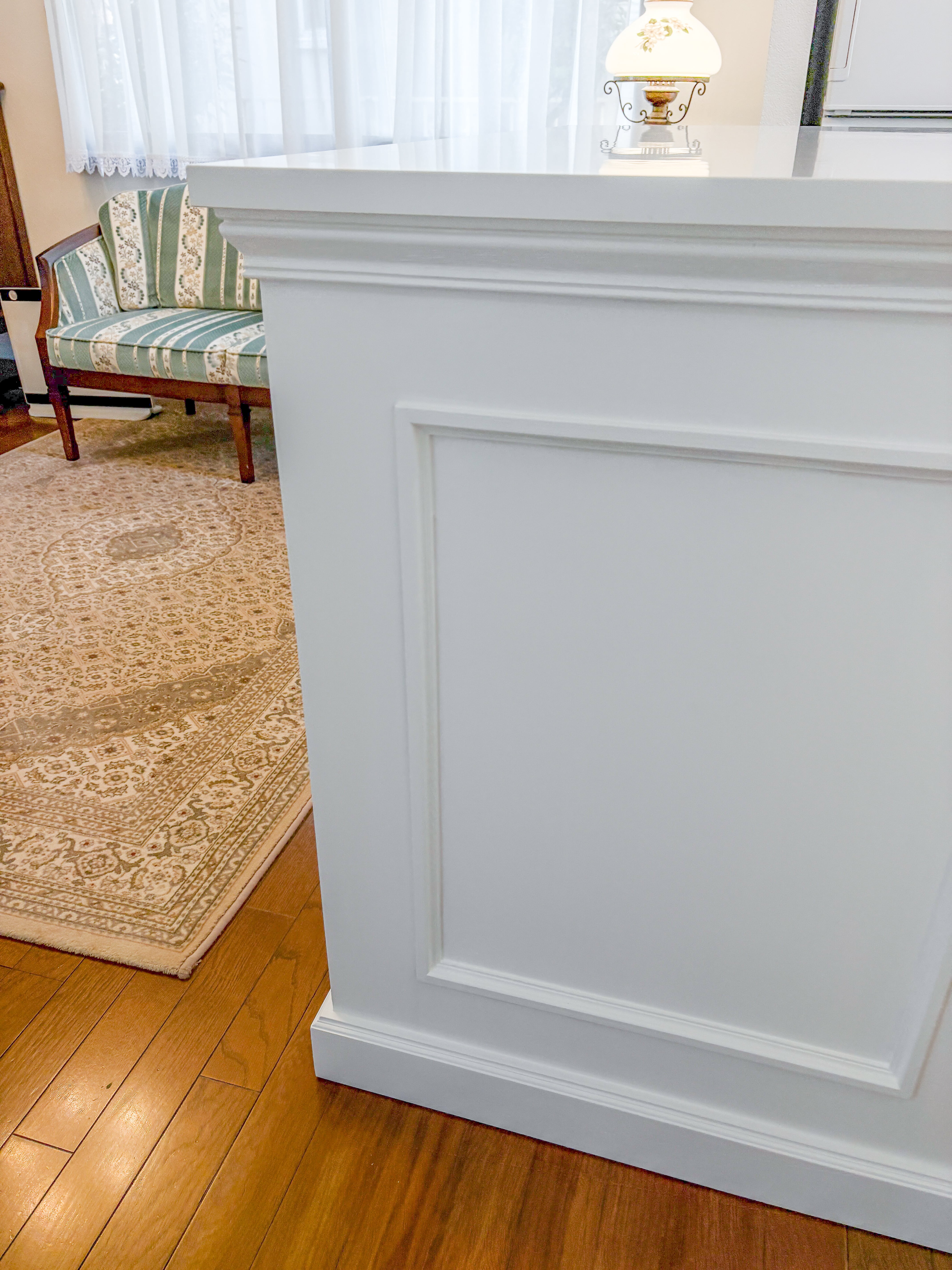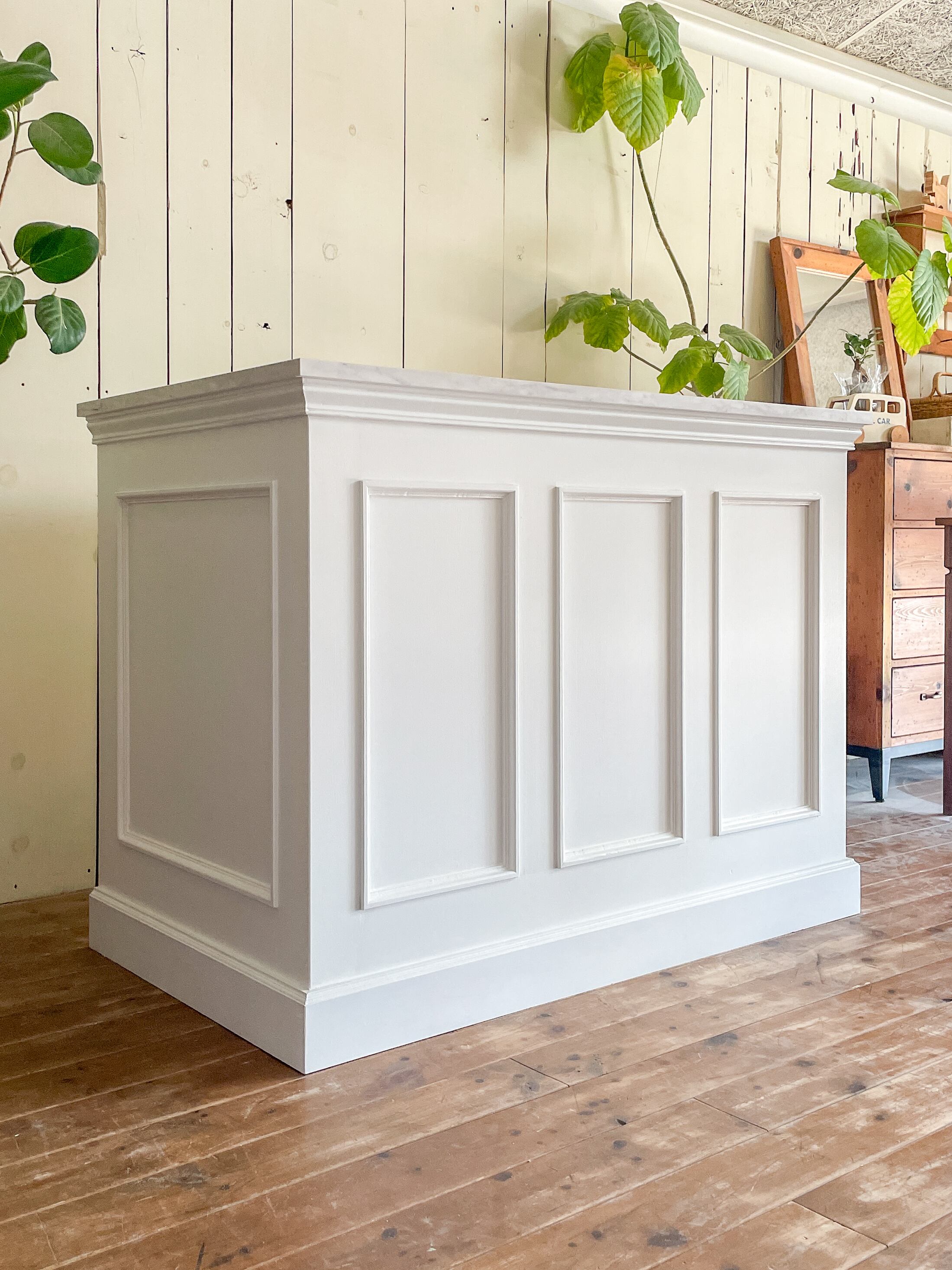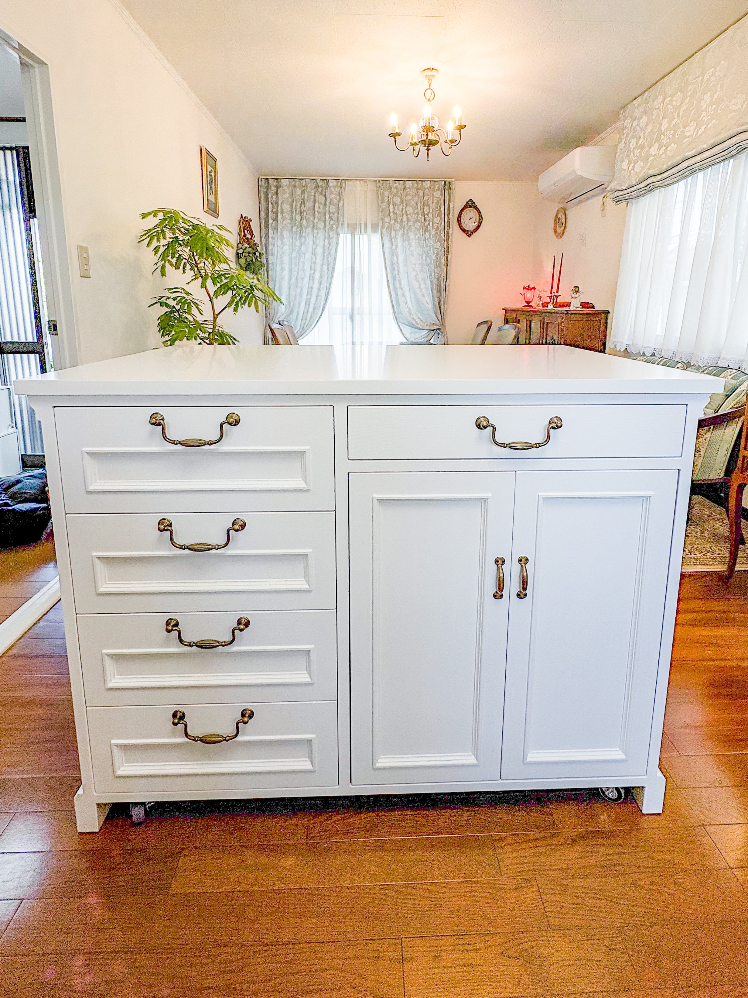 大阪のオーナー様に、海外インテリア風のアイランドカウンターをオーダーメイドさせていただきました。シチュエーションに合わせて移動できるようにキャスターをつけました。天板は白メラミンで防水防汚、耐熱性もあります。輸入住宅にぴったりのおしゃれなキッチンカウンターをお探しの方はお気軽にご相談くださいませ。