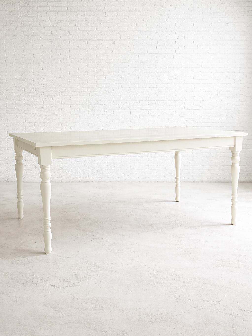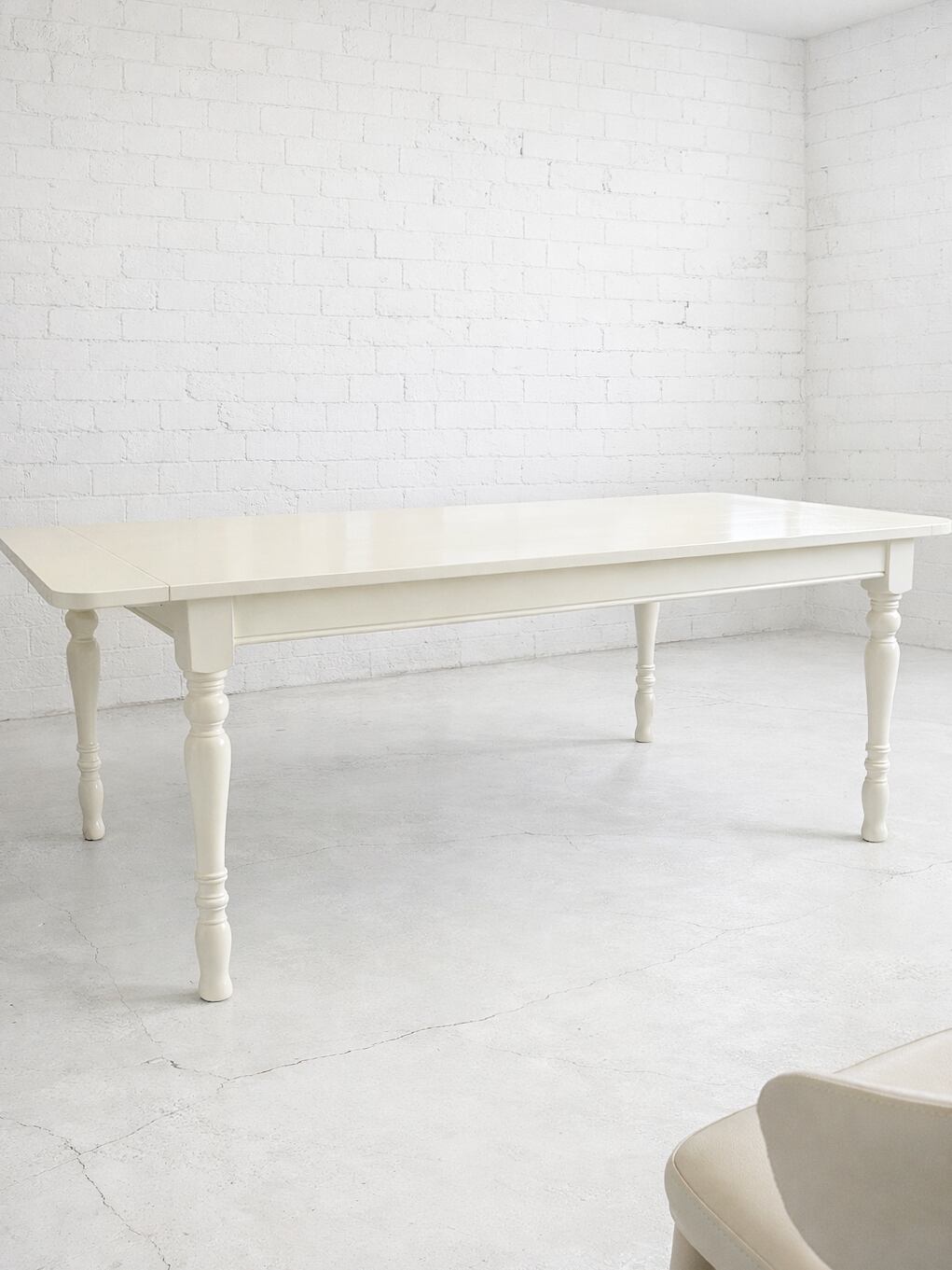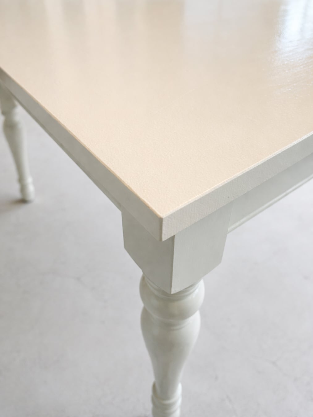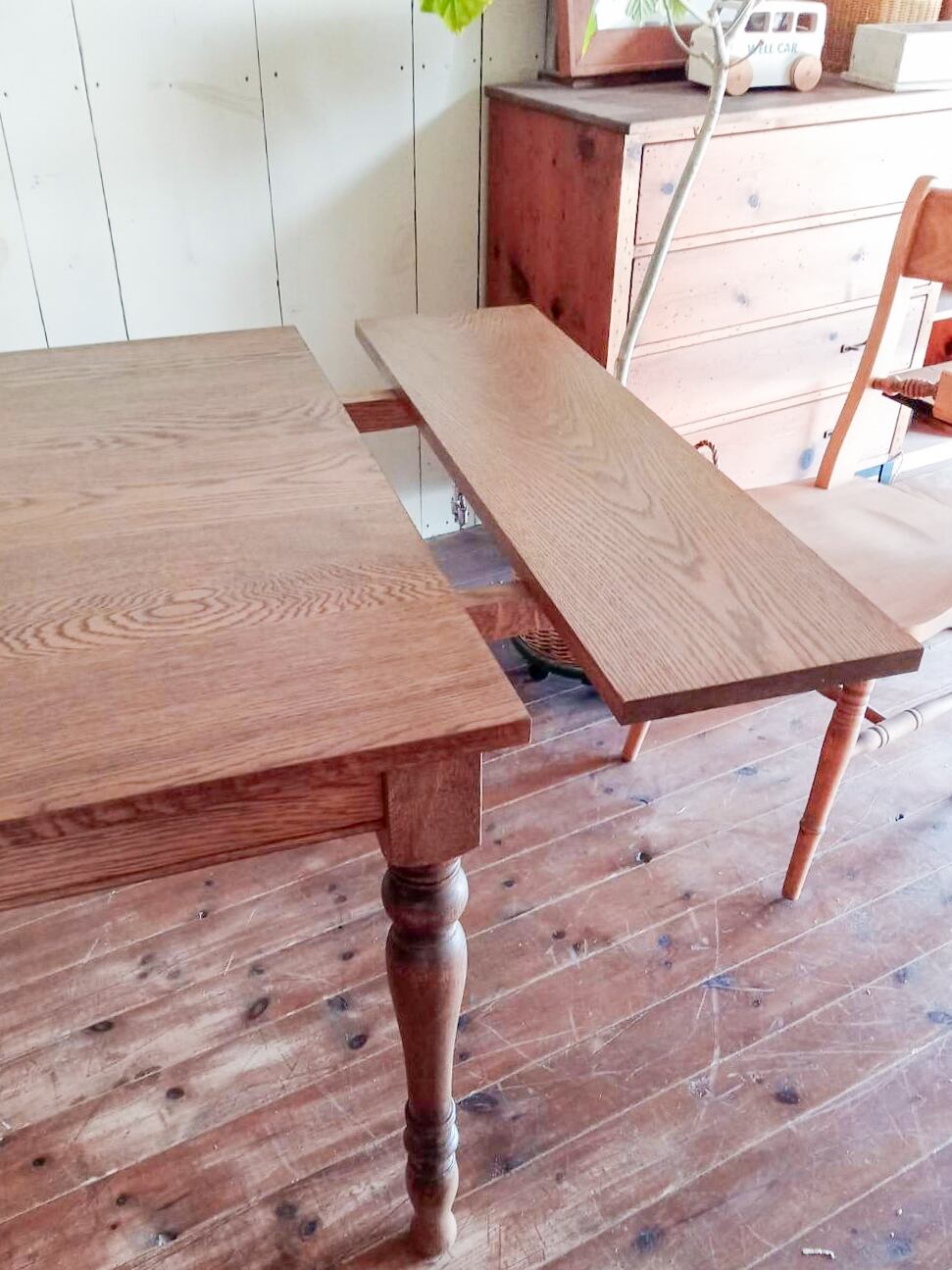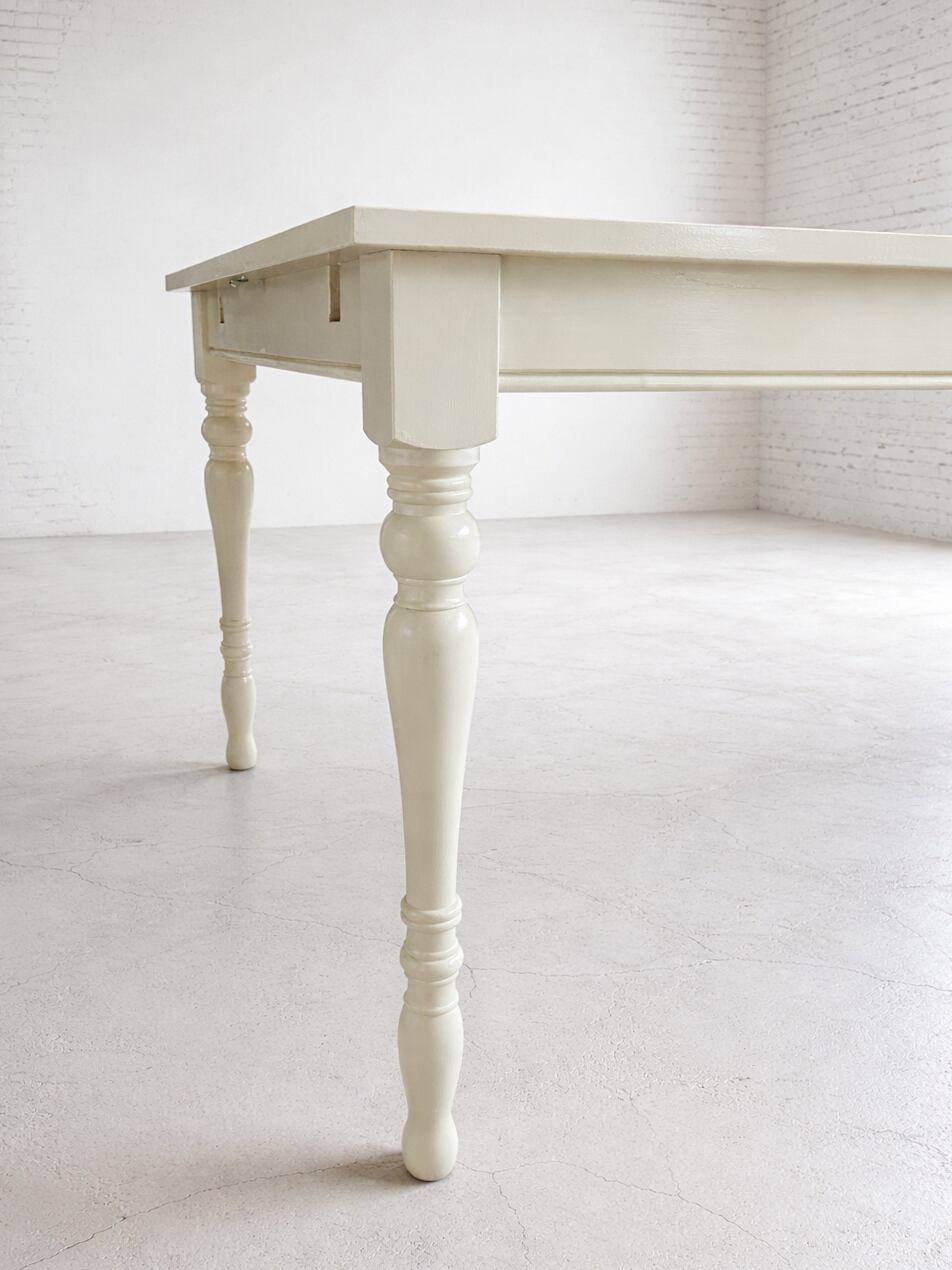通常時W1600✕D900は、ゆったりとした4人用サイズ。左右に250mmの延長天板を差し込むと、W2100になり、椅子を6脚並べても広々使えます。写真は「クリーム色」のウレタン仕上げ、ペンキカラーは13色をご用意しております。ペンキカラーの場合は安価なポプラ材を使いますが、ホワイトオーク材など高級材での製作も承ります。