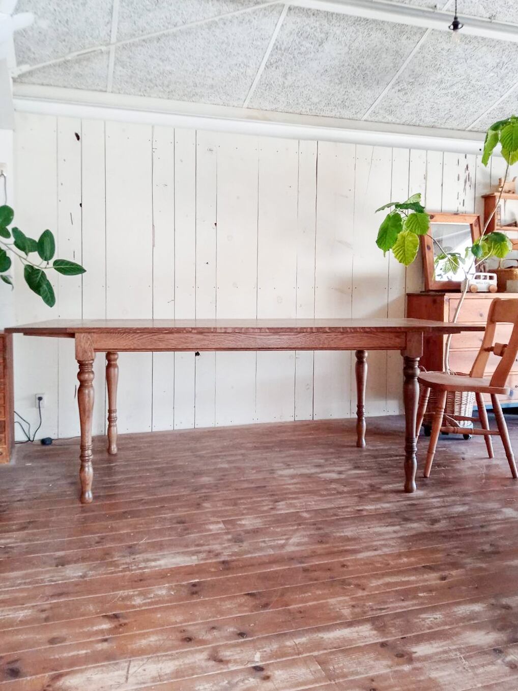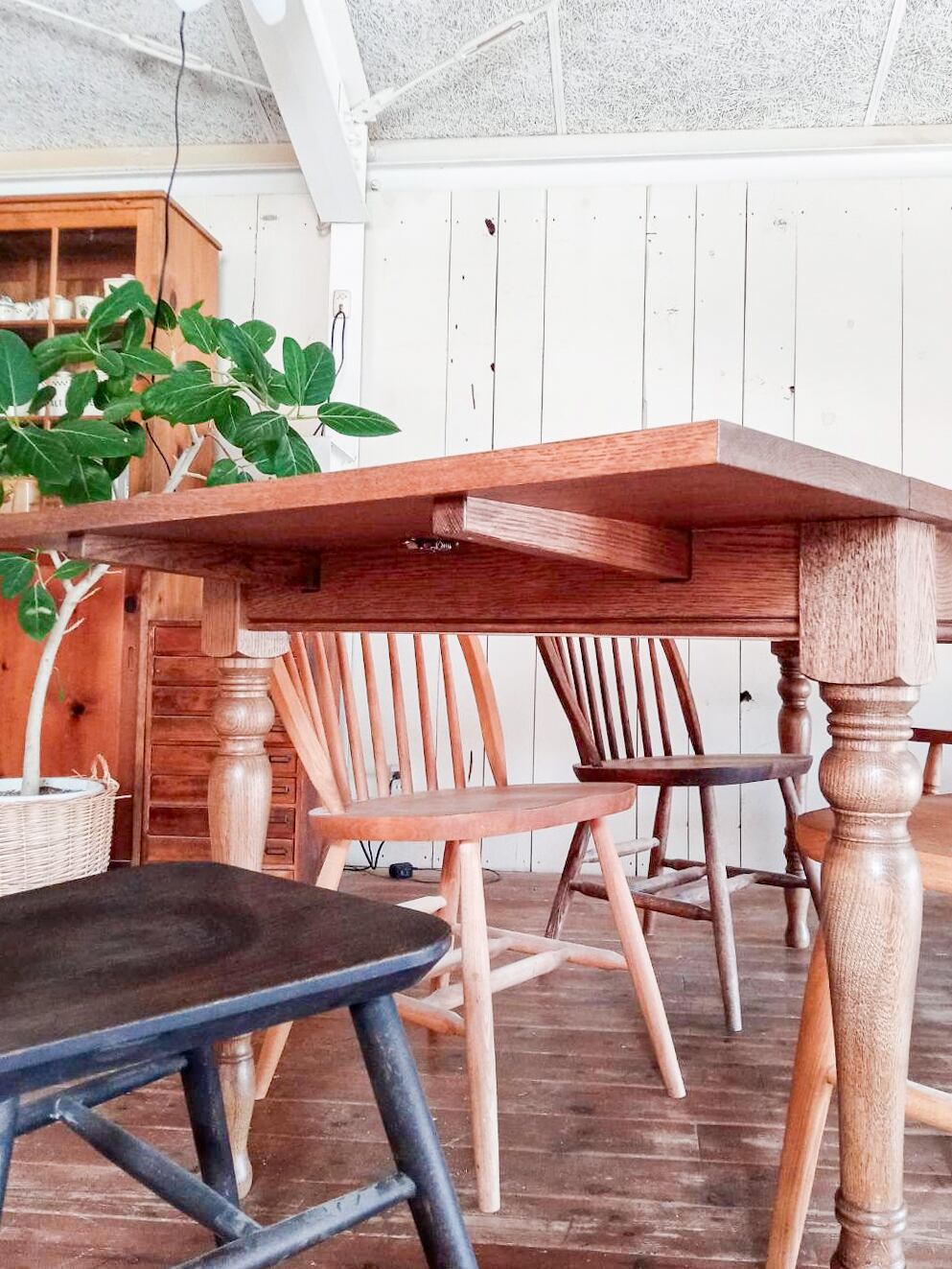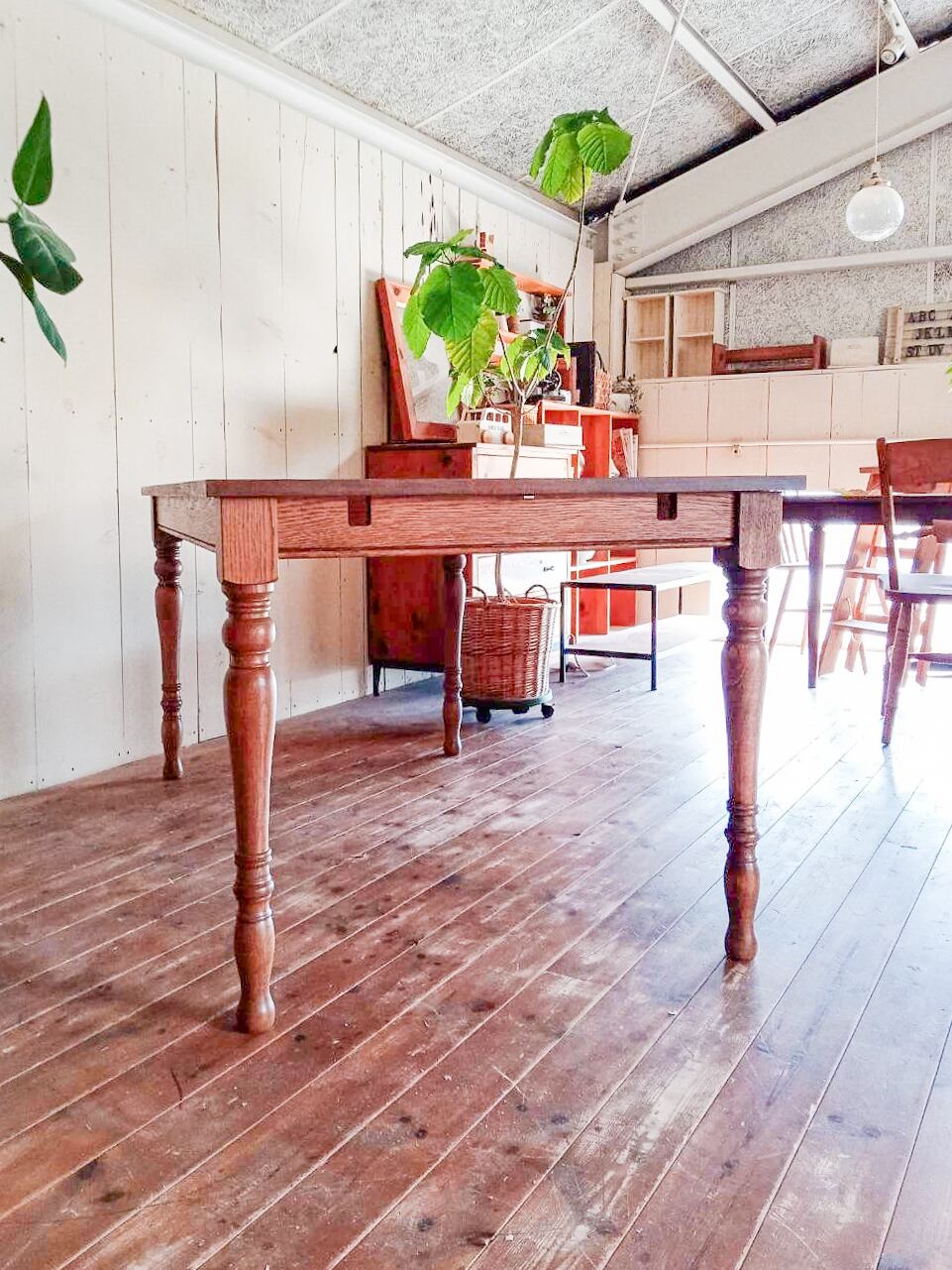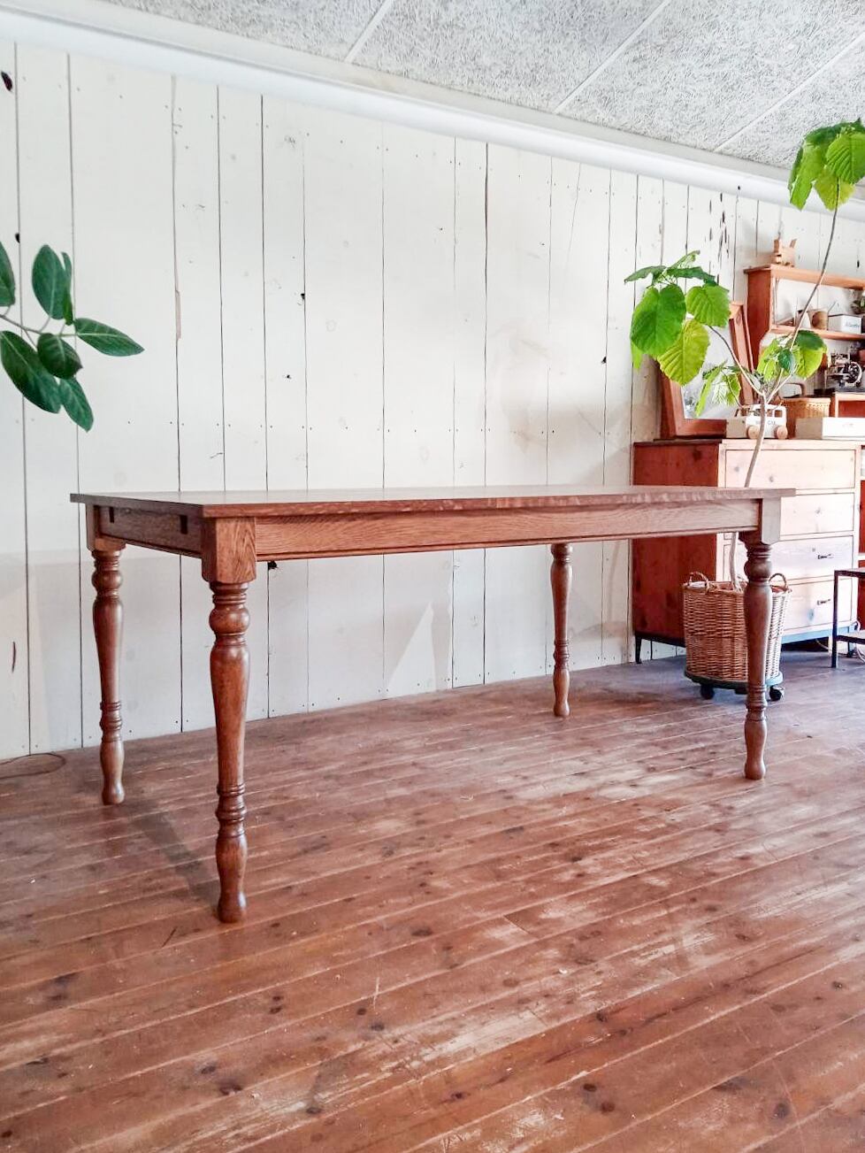 美しいデザインのろくろ足「スレンダー」を使った伸長式ダイニングテーブルが登場!輸入住宅やアンティークインテリアにフィットするダイニングテーブルです。通常1600mmから、延長天板を付けると最大2100mmに。来客や親族がお見えになる機会の多いご家庭におすすめの、エクステンションテーブルです。