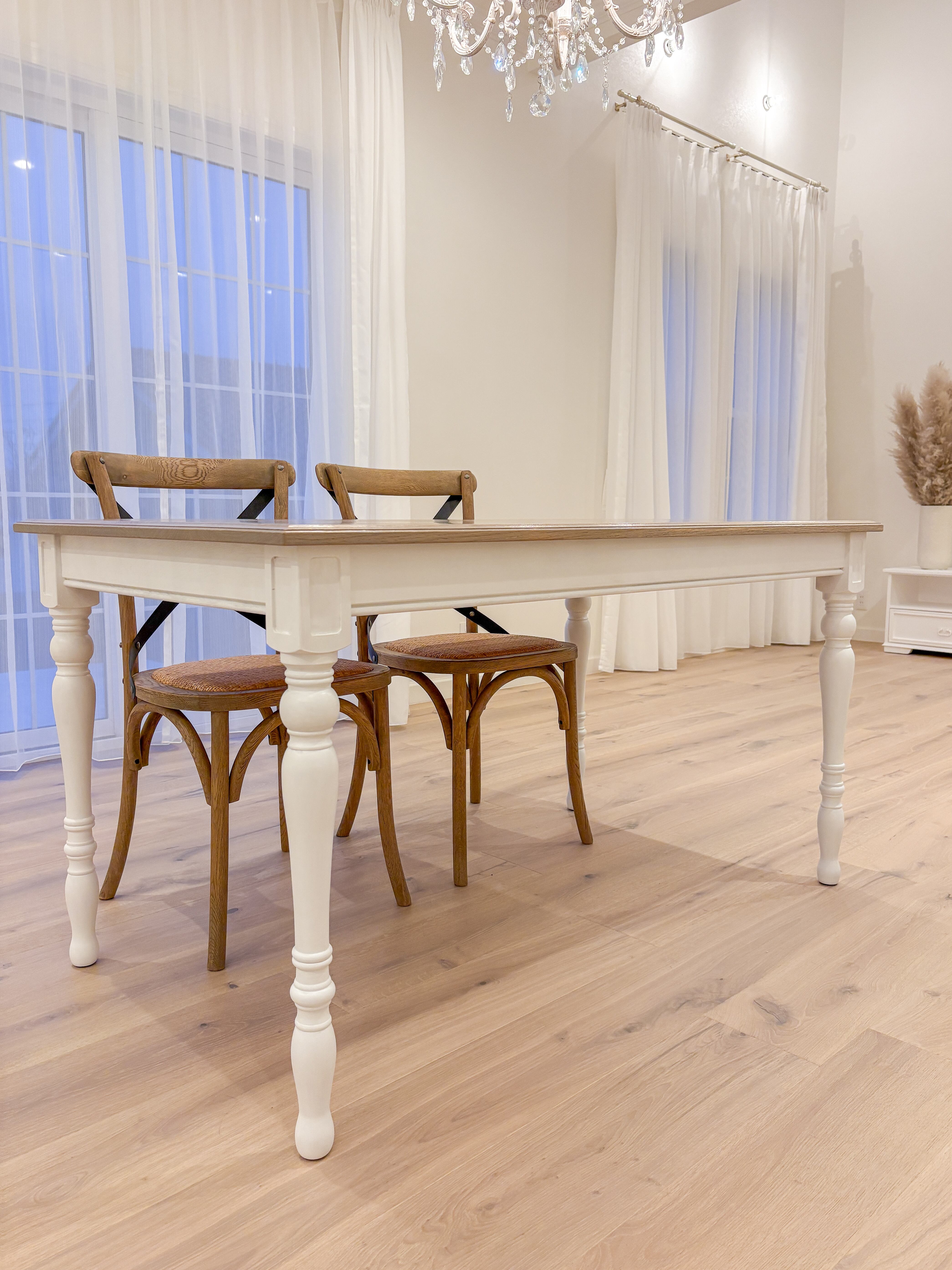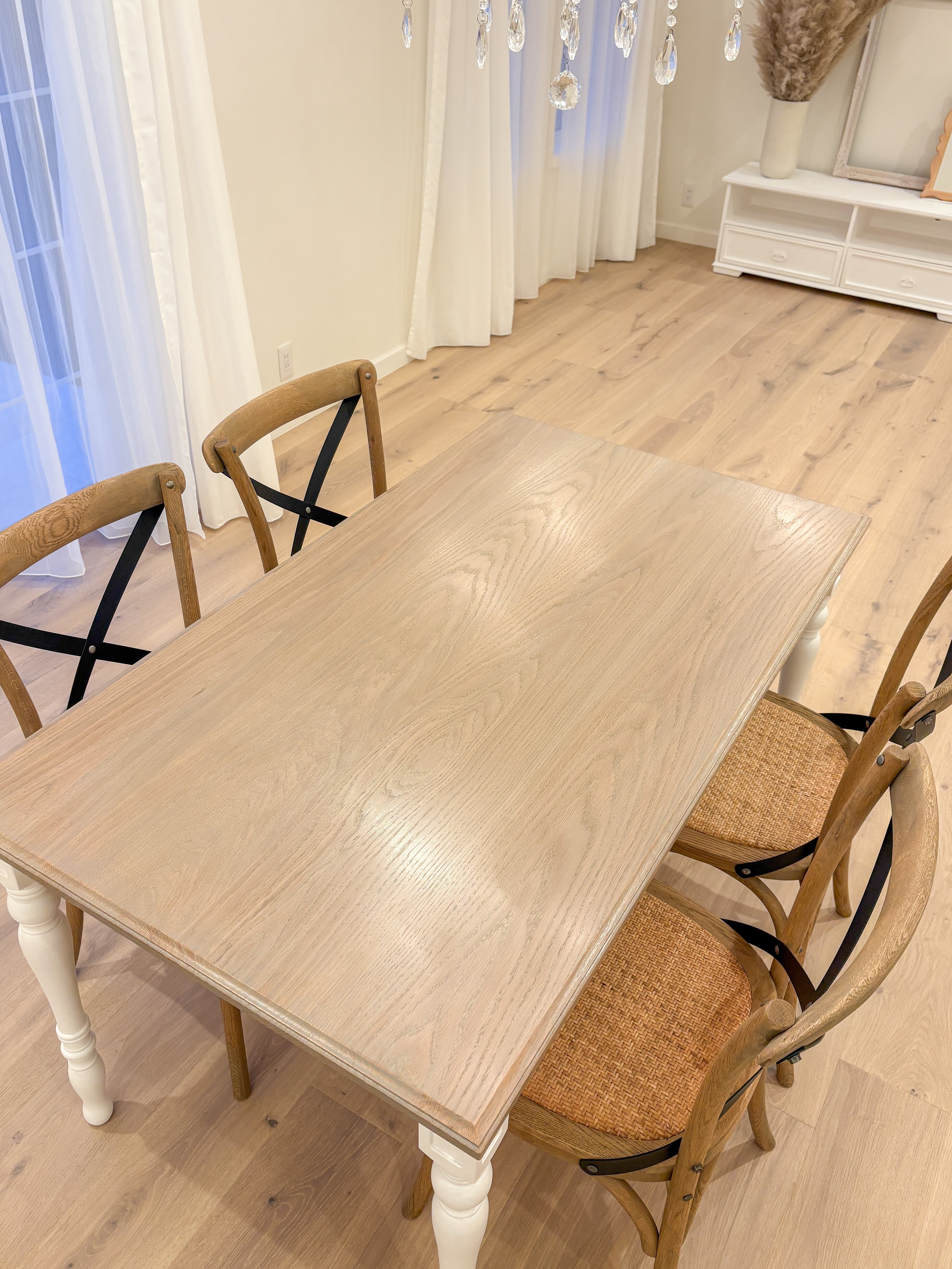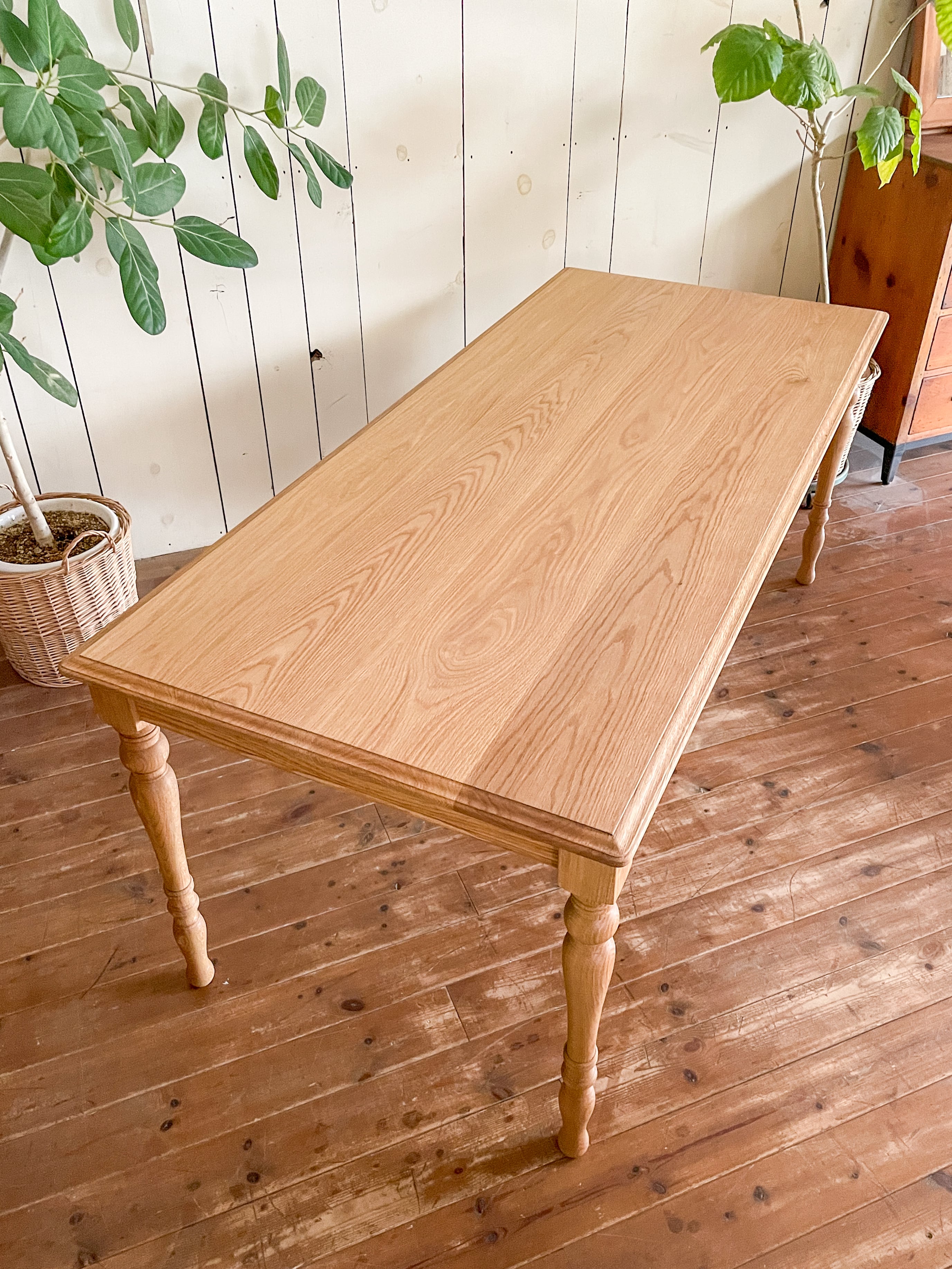 群馬県にご新築の輸入住宅に、美しいシルエットのろくろ足ダイニングテーブルを納品させていただきました。床材に合わせて、天板はホワイトオーク材をグレイッシュに仕上げました。足はキッチンに合わせて「ホワイト」。こだわりのインテリアにぴったりのダイニングテーブルが出来ました。