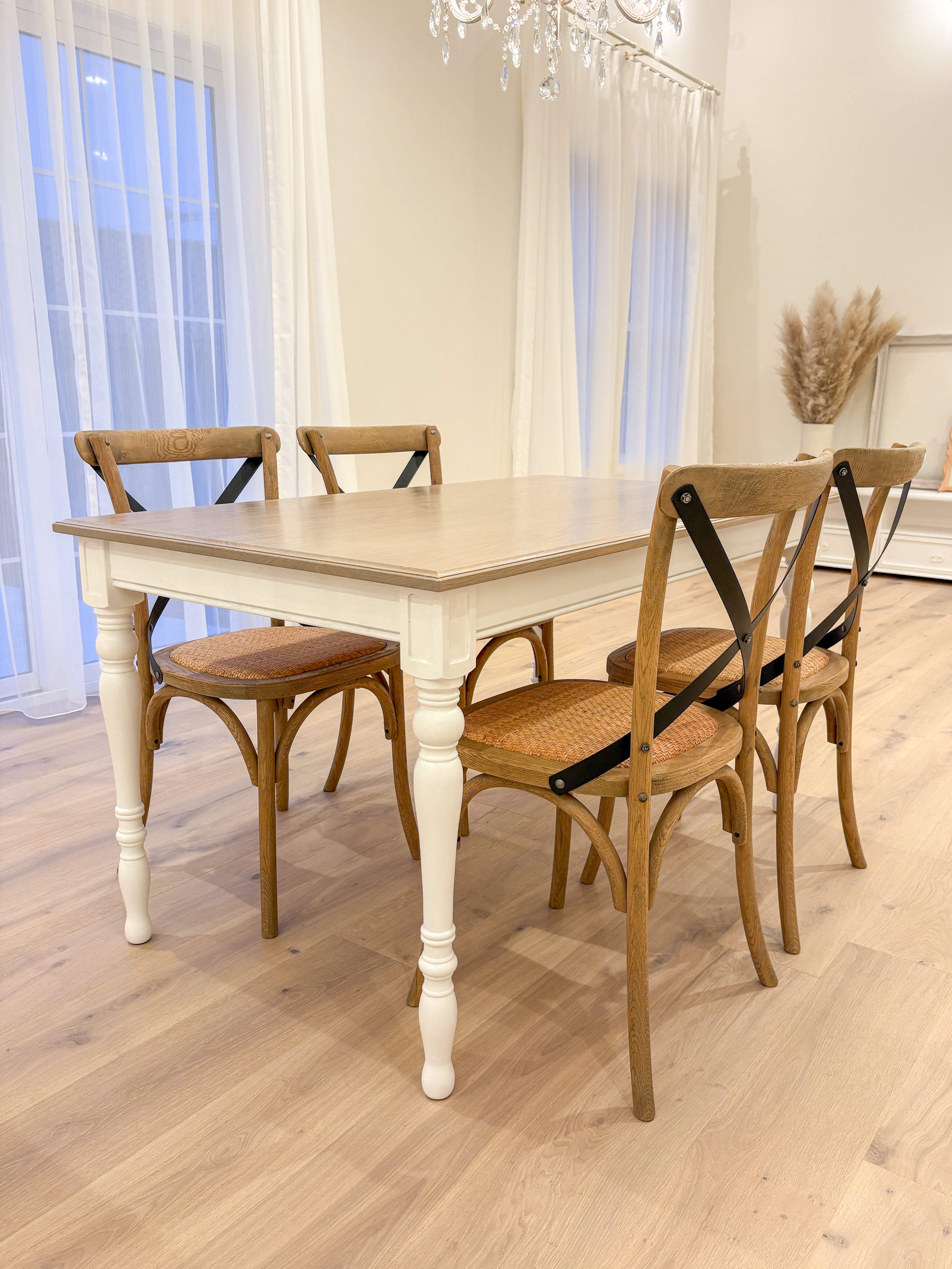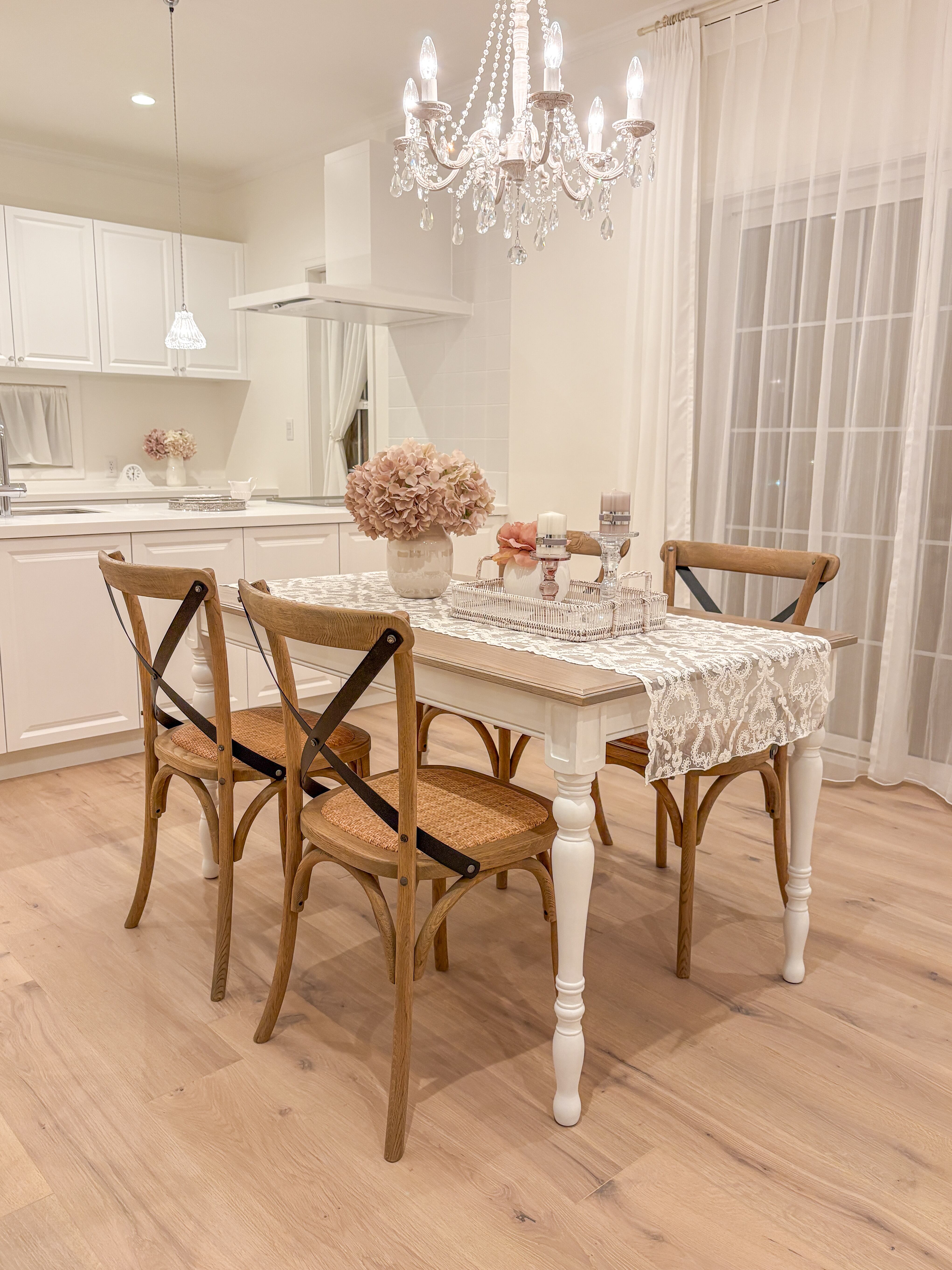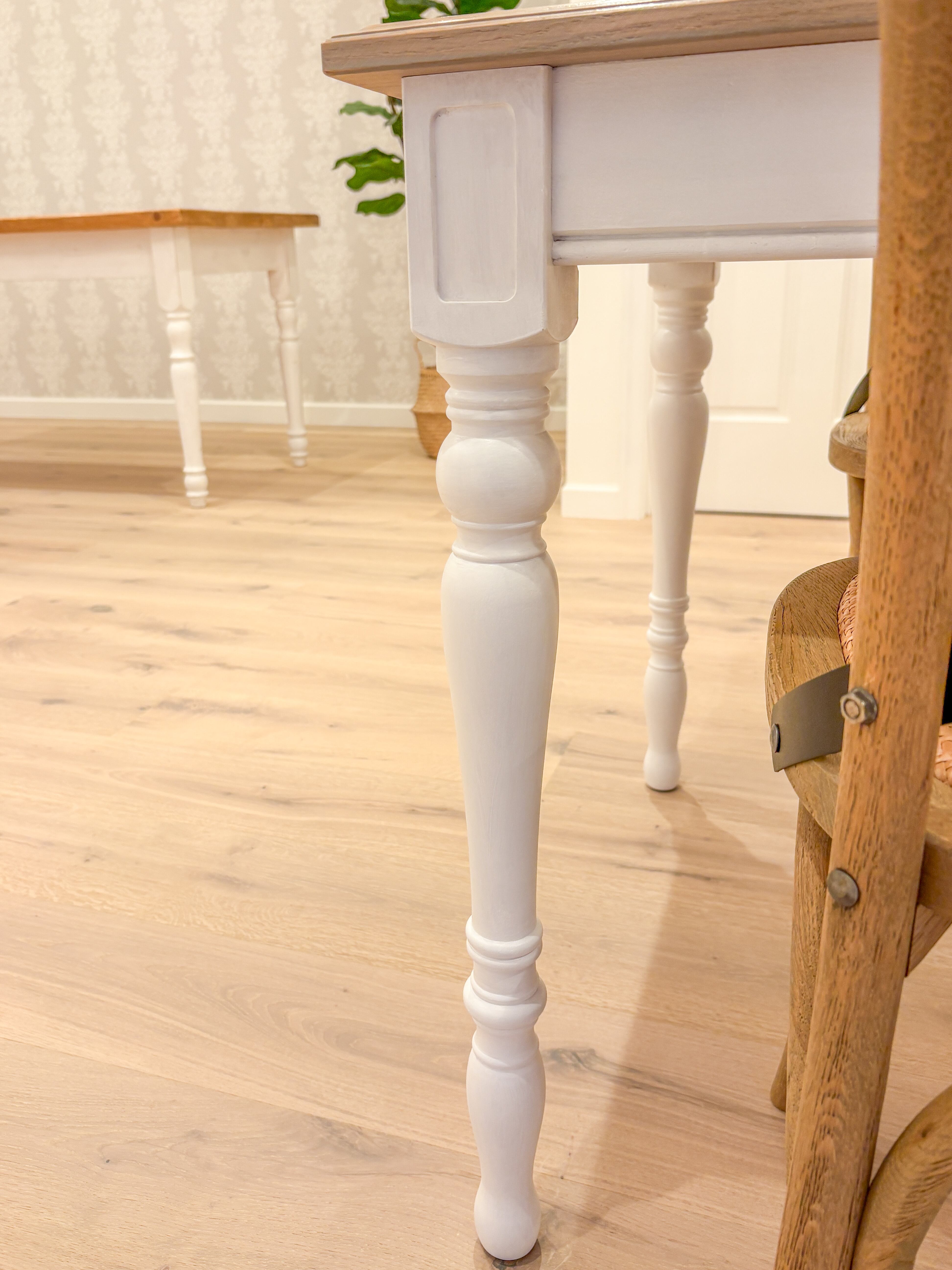 群馬県にご新築の輸入住宅に、美しいシルエットのろくろ足ダイニングテーブルを納品させていただきました。床材に合わせて、天板はホワイトオーク材をグレイッシュに仕上げました。足はキッチンに合わせて「ホワイト」。こだわりのインテリアにぴったりのダイニングテーブルが出来ました。