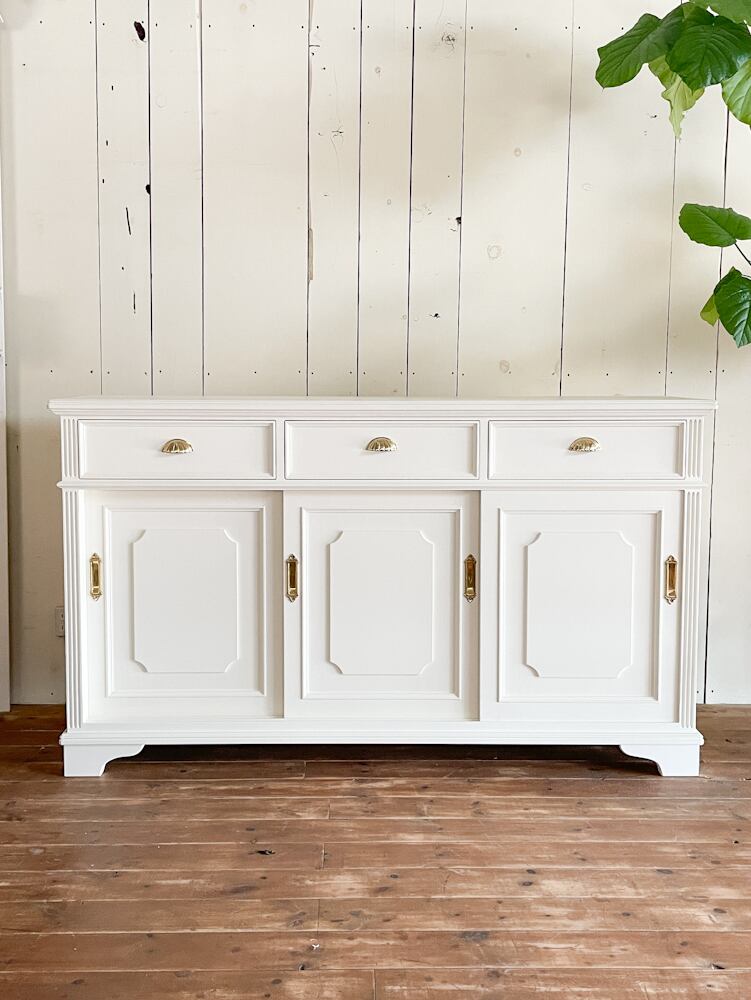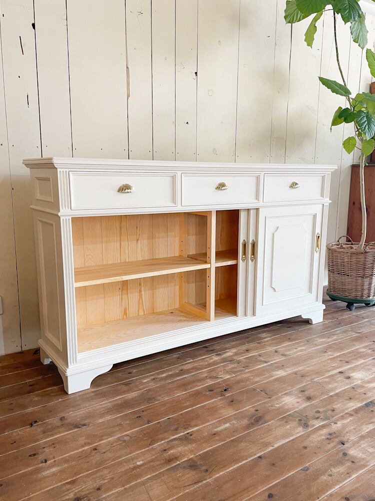 写真は、横幅1300、奥行き455mm、高さ1030mm、細かなサイズオーダーも可能です。スライド扉の中には細かな高さ変更ができる可動棚。収納とディスプレイ両面で優秀なサイドボードで。お花や季節のデコ―レションをして楽しんで下さい♪