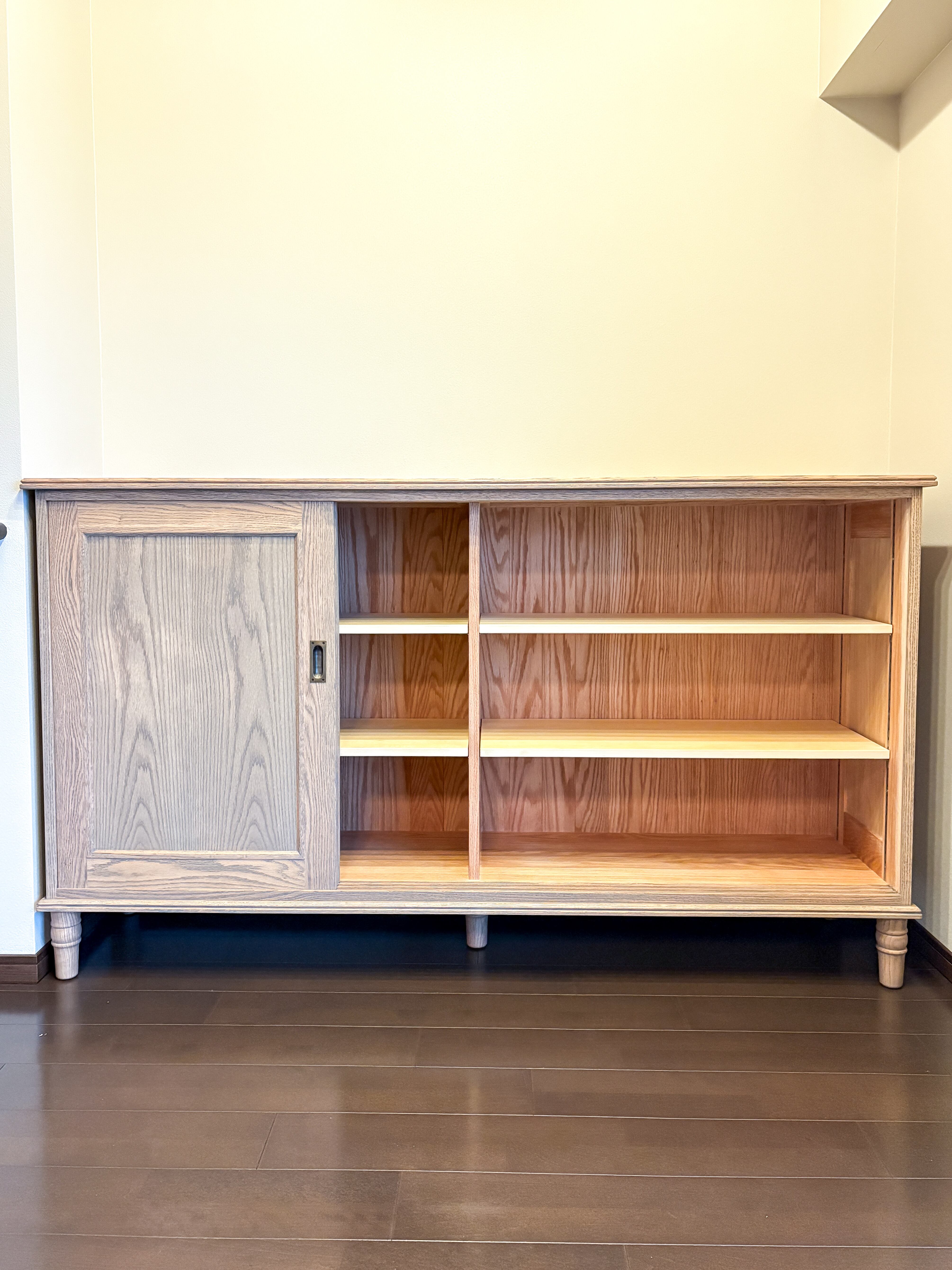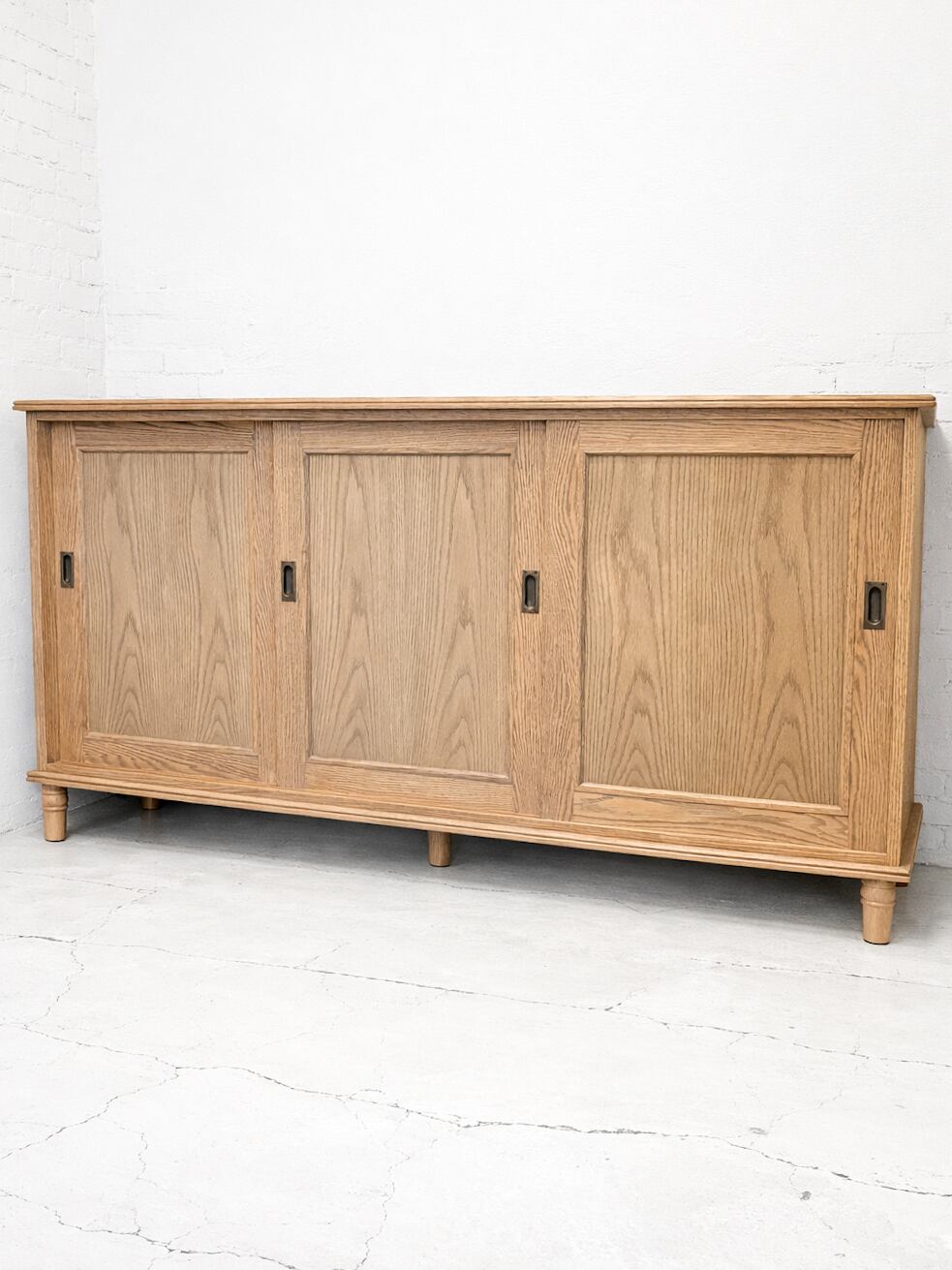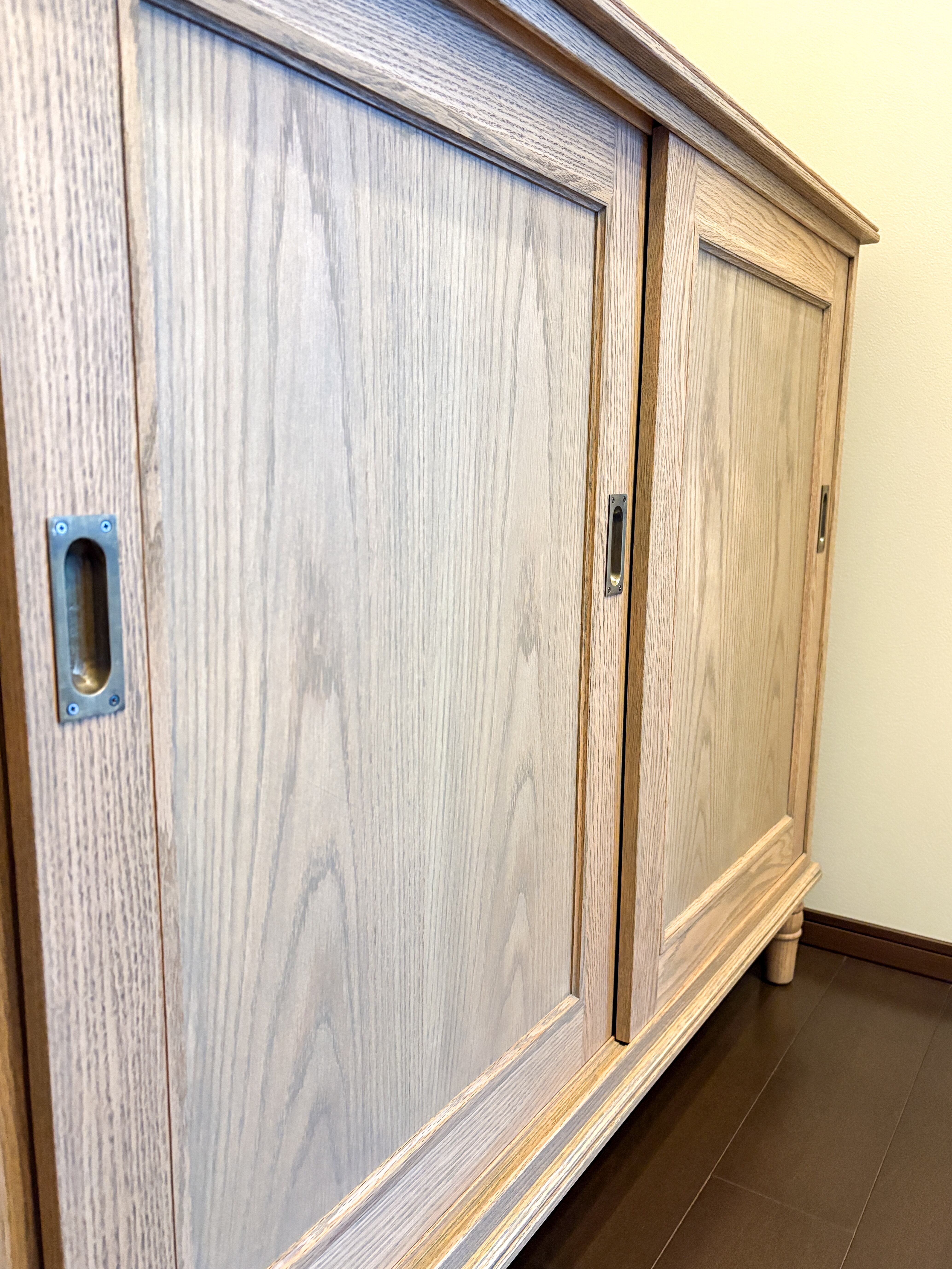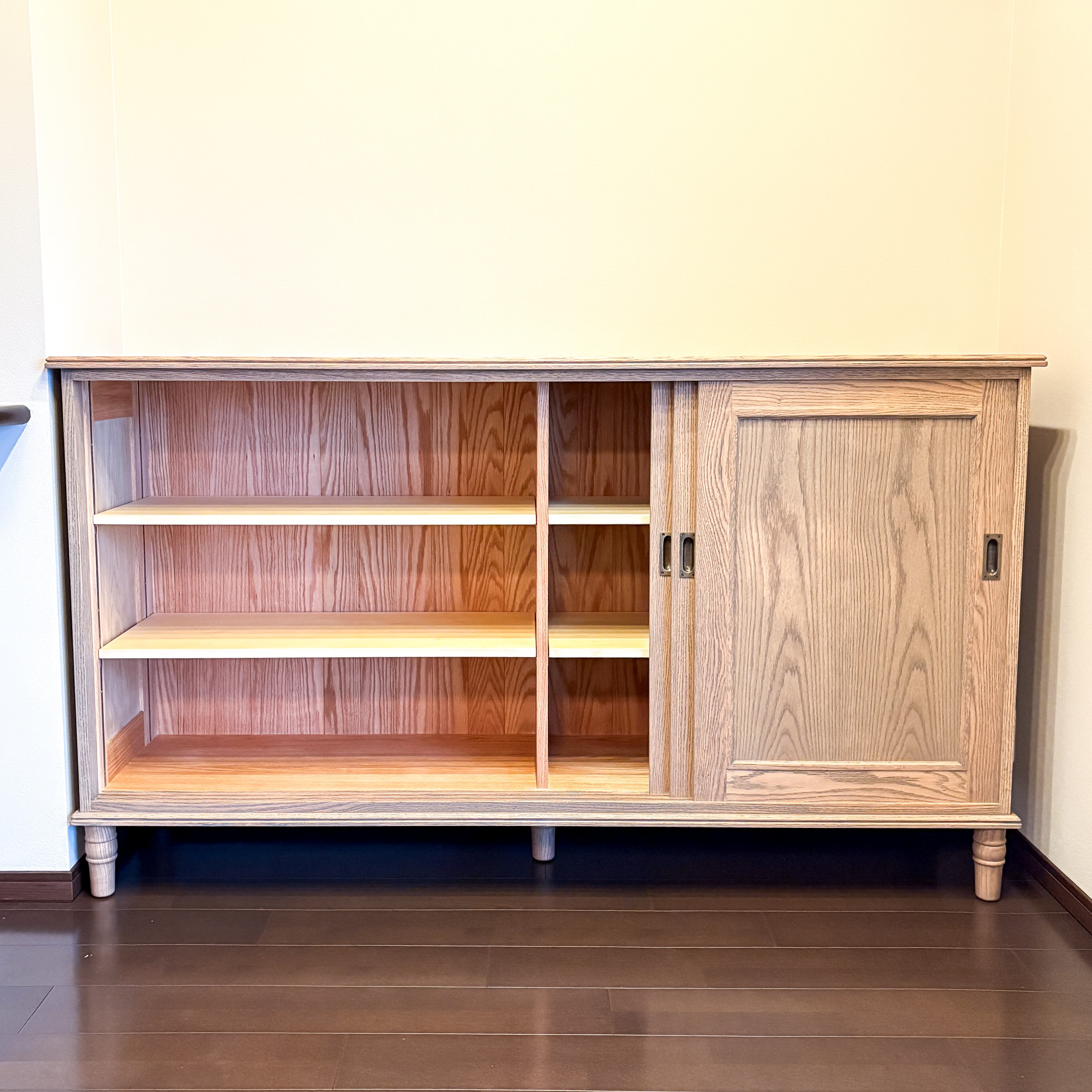 京都のオーナー様宅に、オーク材で作ったレイロなサイドボードを納品させていただきました。日本人に馴染み深い引き違い戸は、開き戸と違い開閉にスペースが不要で、使い勝手が良いです。ろくろ足で足元をスッキリ。ご家庭だけでなく、店舗向けにもアンティ―ク調デザインの家具オーダーメイド製作しています。