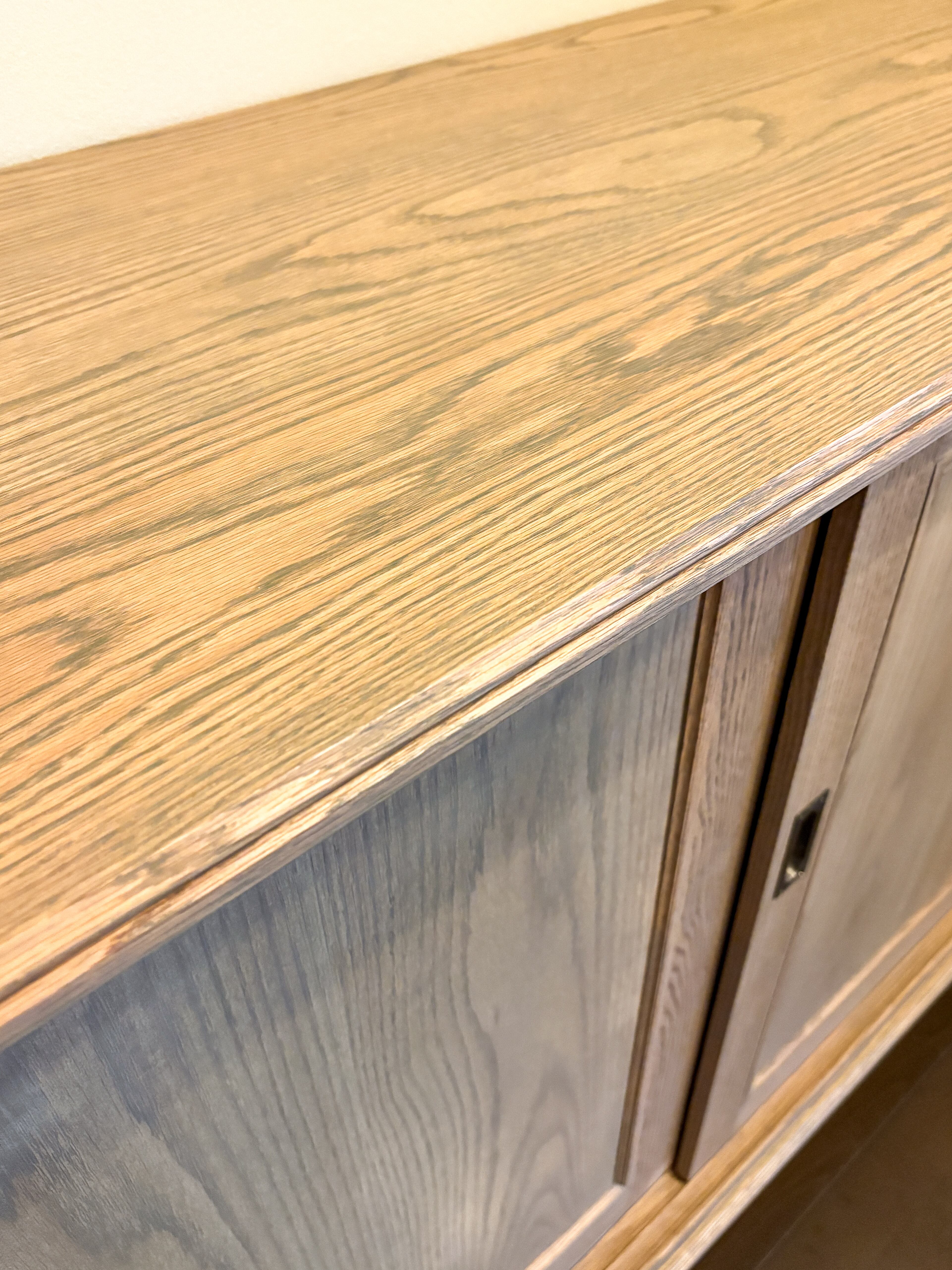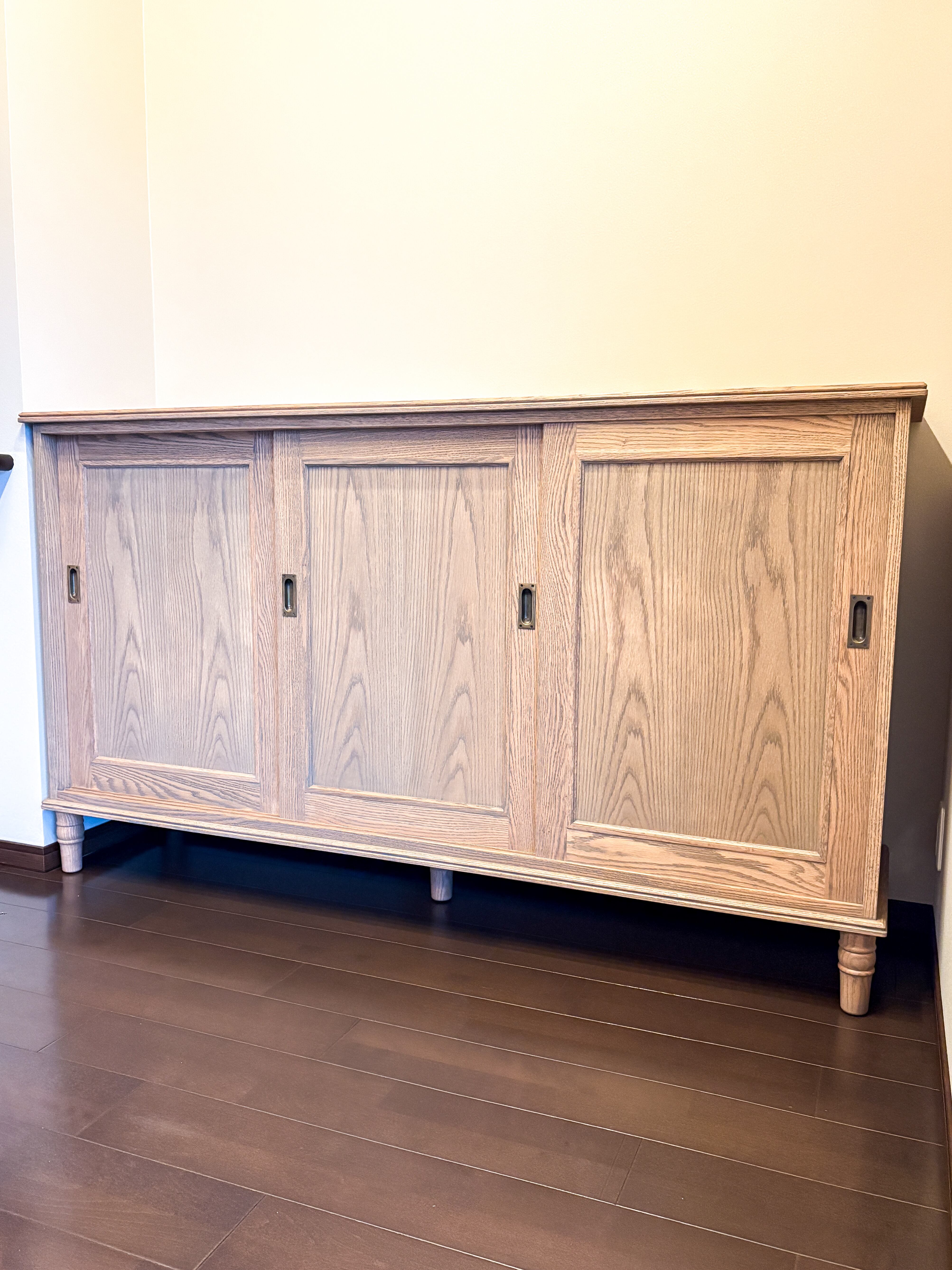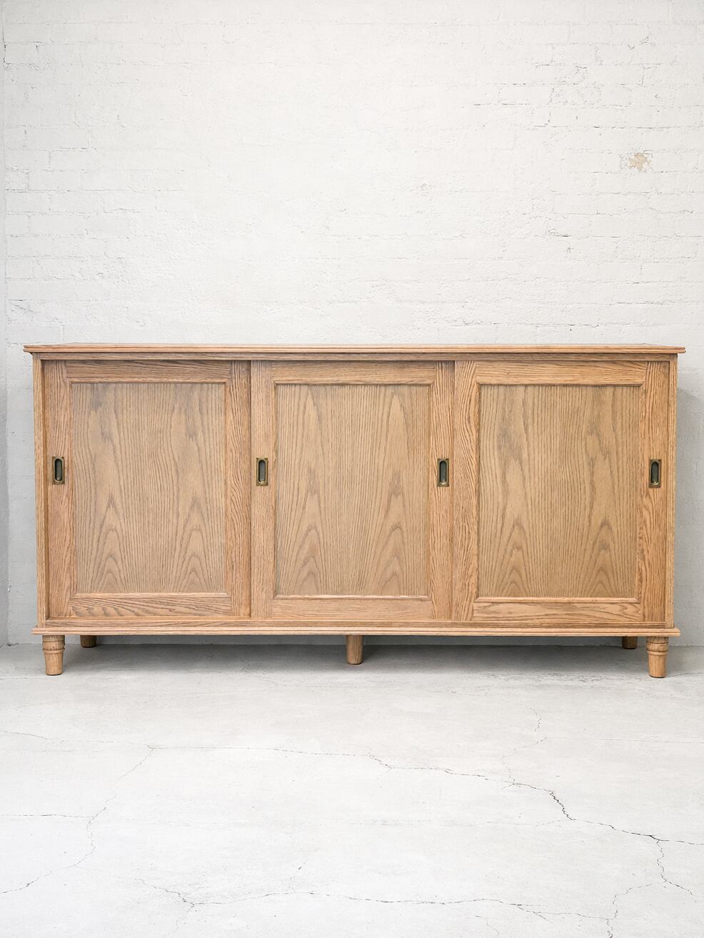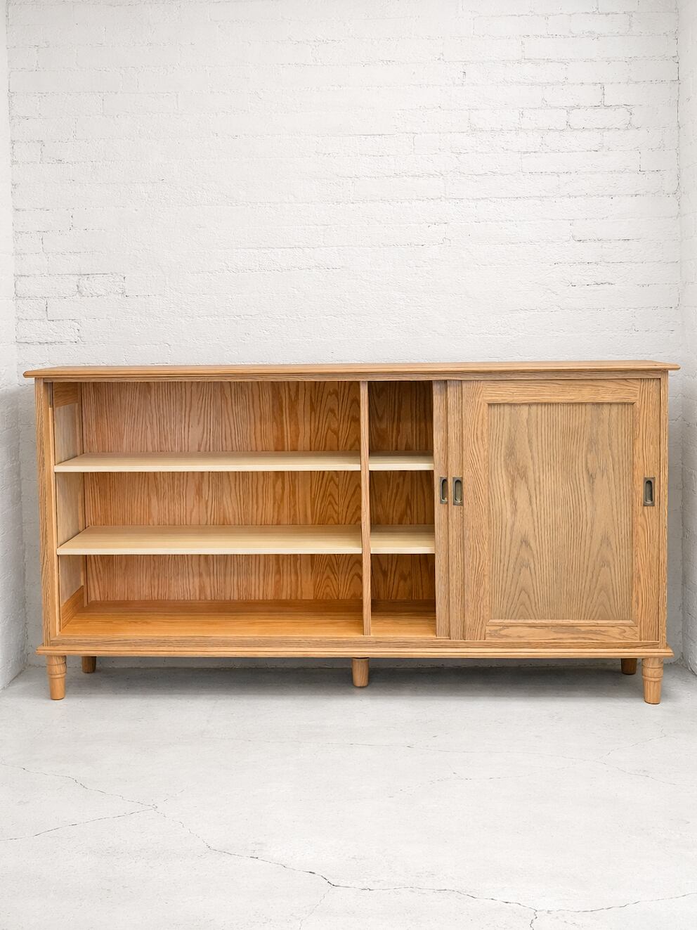 京都のオーナー様宅に、オーク材で作ったレイロなサイドボードを納品させていただきました。日本人に馴染み深い引き違い戸は、開き戸と違い開閉にスペースが不要で、使い勝手が良いです。ろくろ足で足元をスッキリ。ご家庭だけでなく、店舗向けにもアンティ―ク調デザインの家具オーダーメイド製作しています。