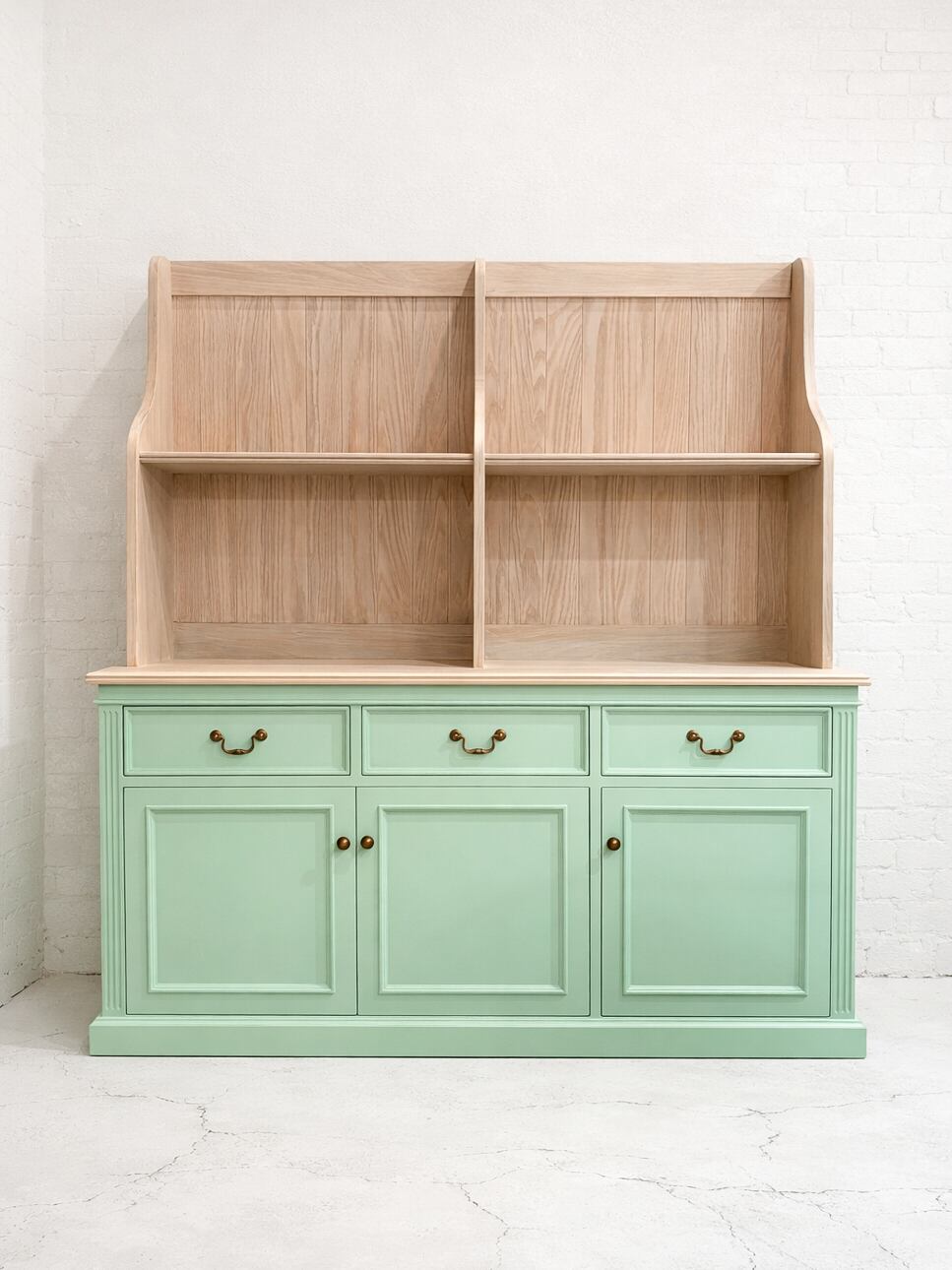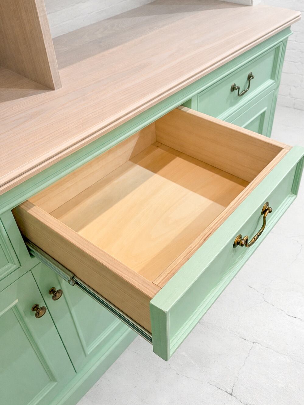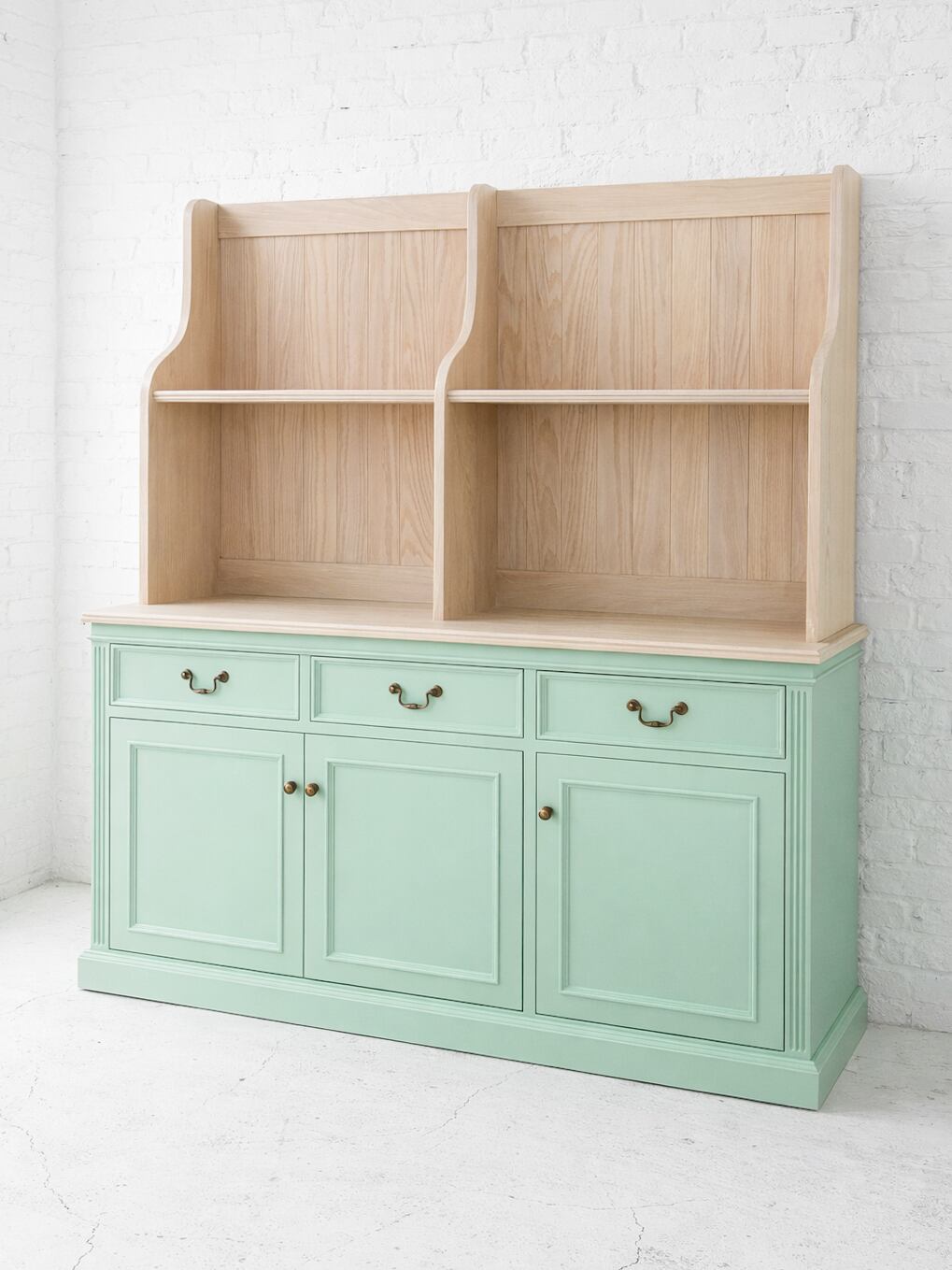 キャビネットのミントグリーン色は、お店のコンセプトカラー。基本カラーは13色ですが、日塗工色番も対応しております。熟練の日本人職人が1点1点手作りしております。納品実績は3500件以上、基本は無垢の木材を使い、予算や用途に応じてメラミンや合板での製作も致します。家具専門デリバリーで日本全国へお届け、お気軽にご相談下さいませ。