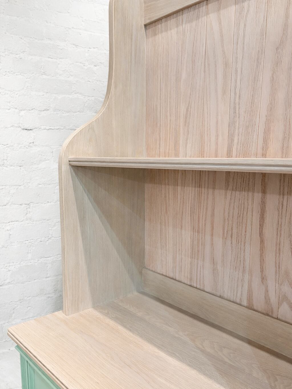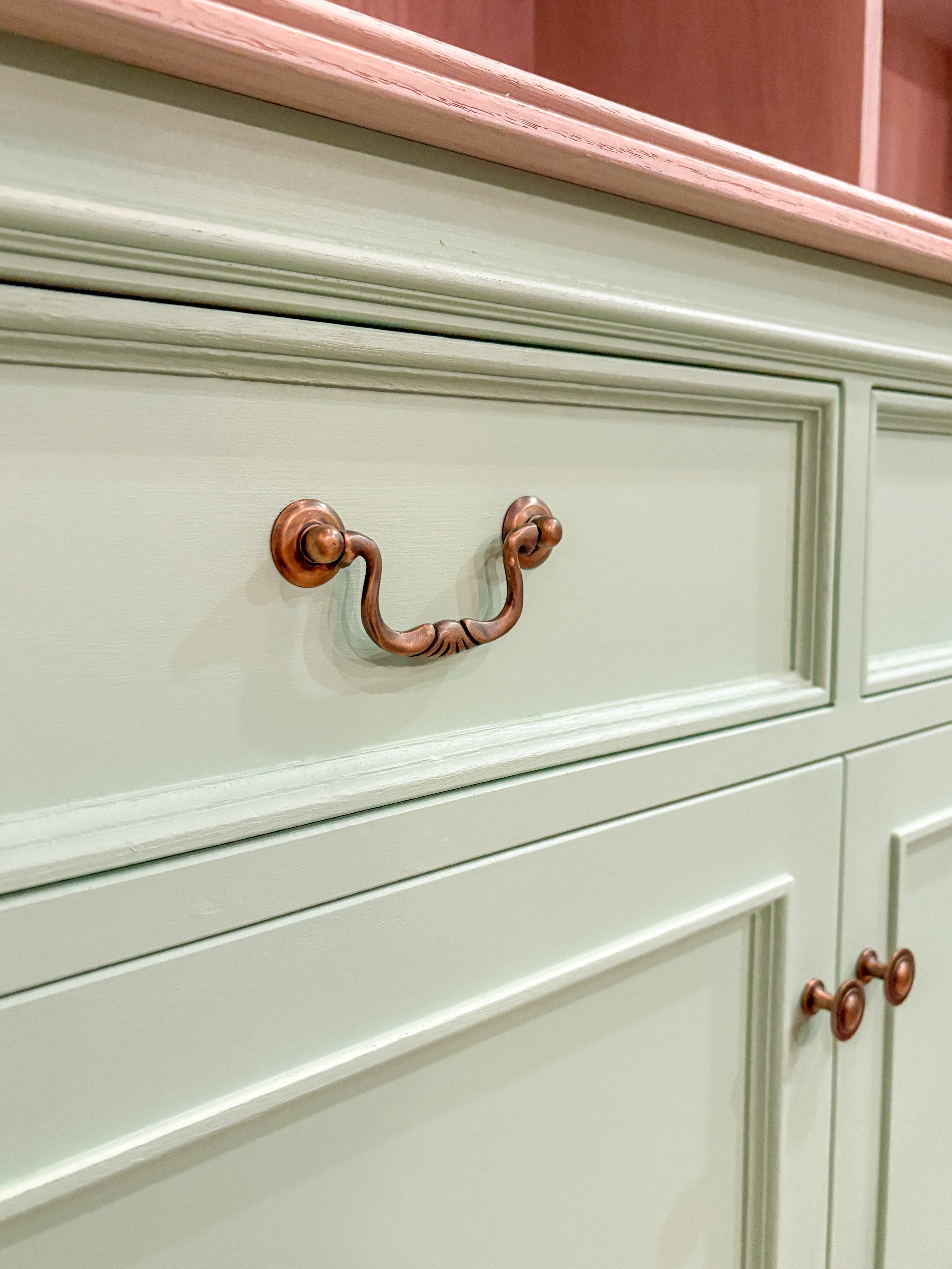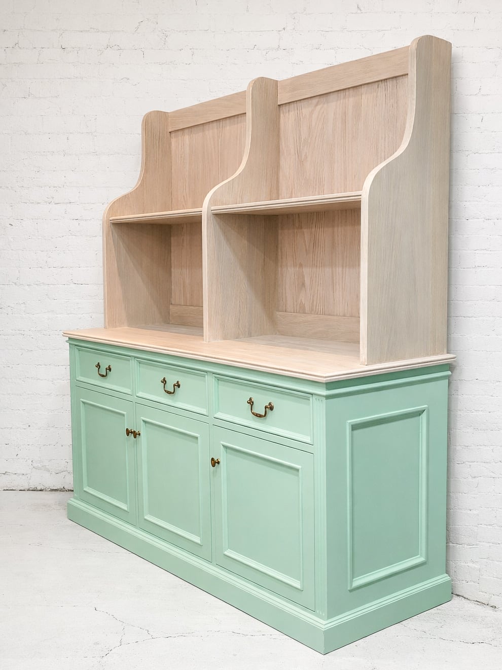 キャビネットのミントグリーン色は、お店のコンセプトカラー。基本カラーは13色ですが、日塗工色番も対応しております。熟練の日本人職人が1点1点手作りしております。納品実績は3500件以上、基本は無垢の木材を使い、予算や用途に応じてメラミンや合板での製作も致します。家具専門デリバリーで日本全国へお届け、お気軽にご相談下さいませ。