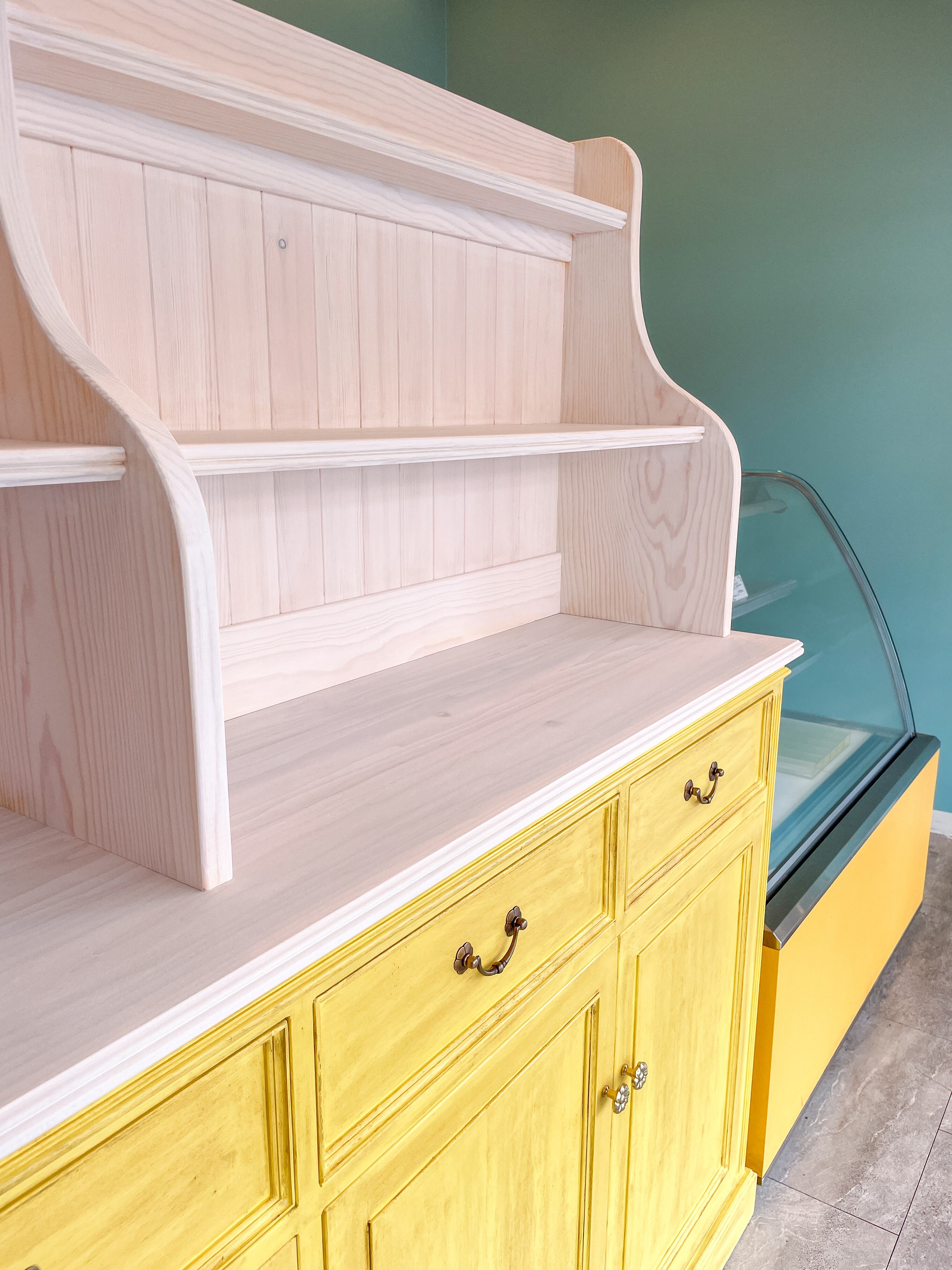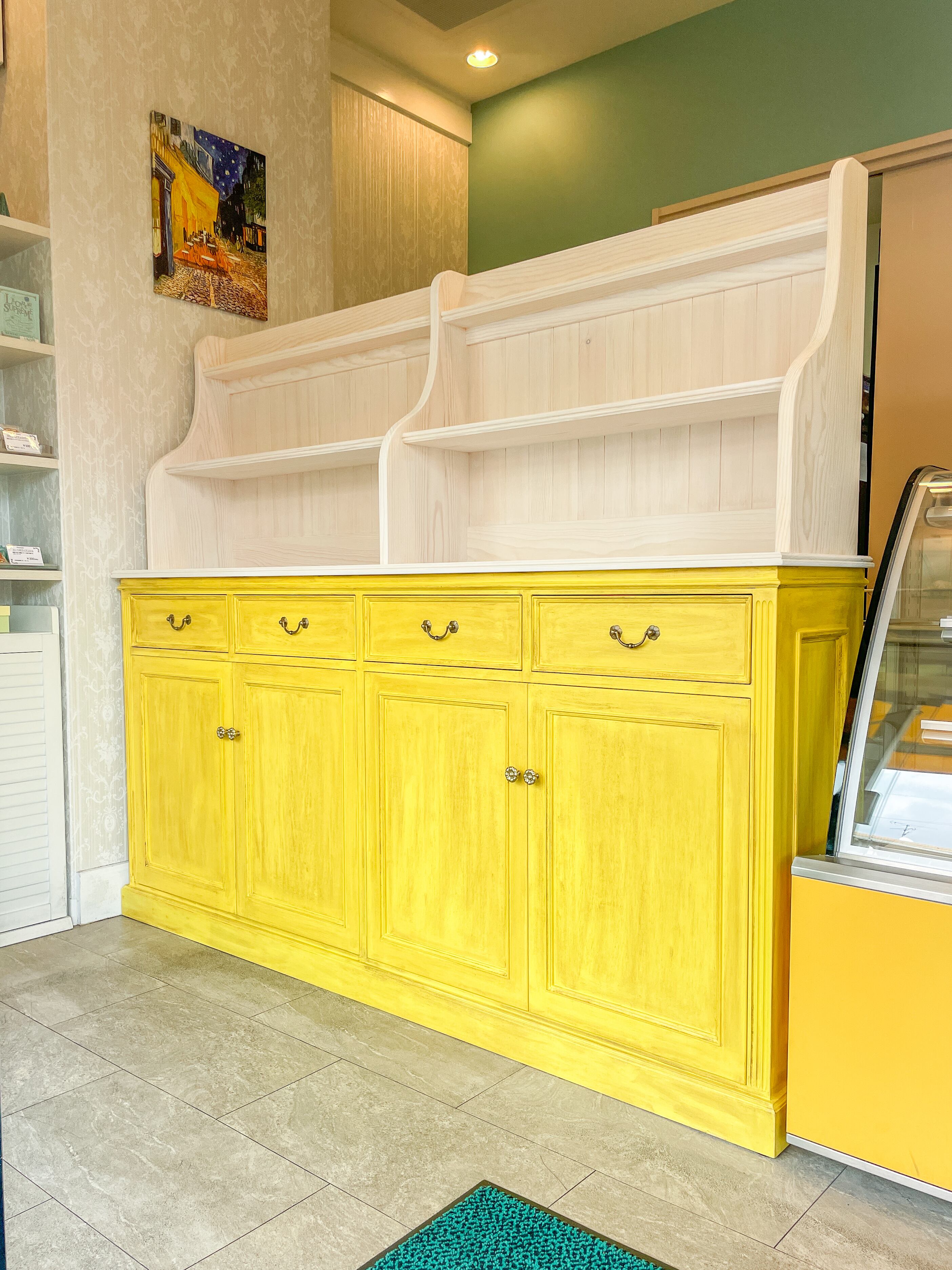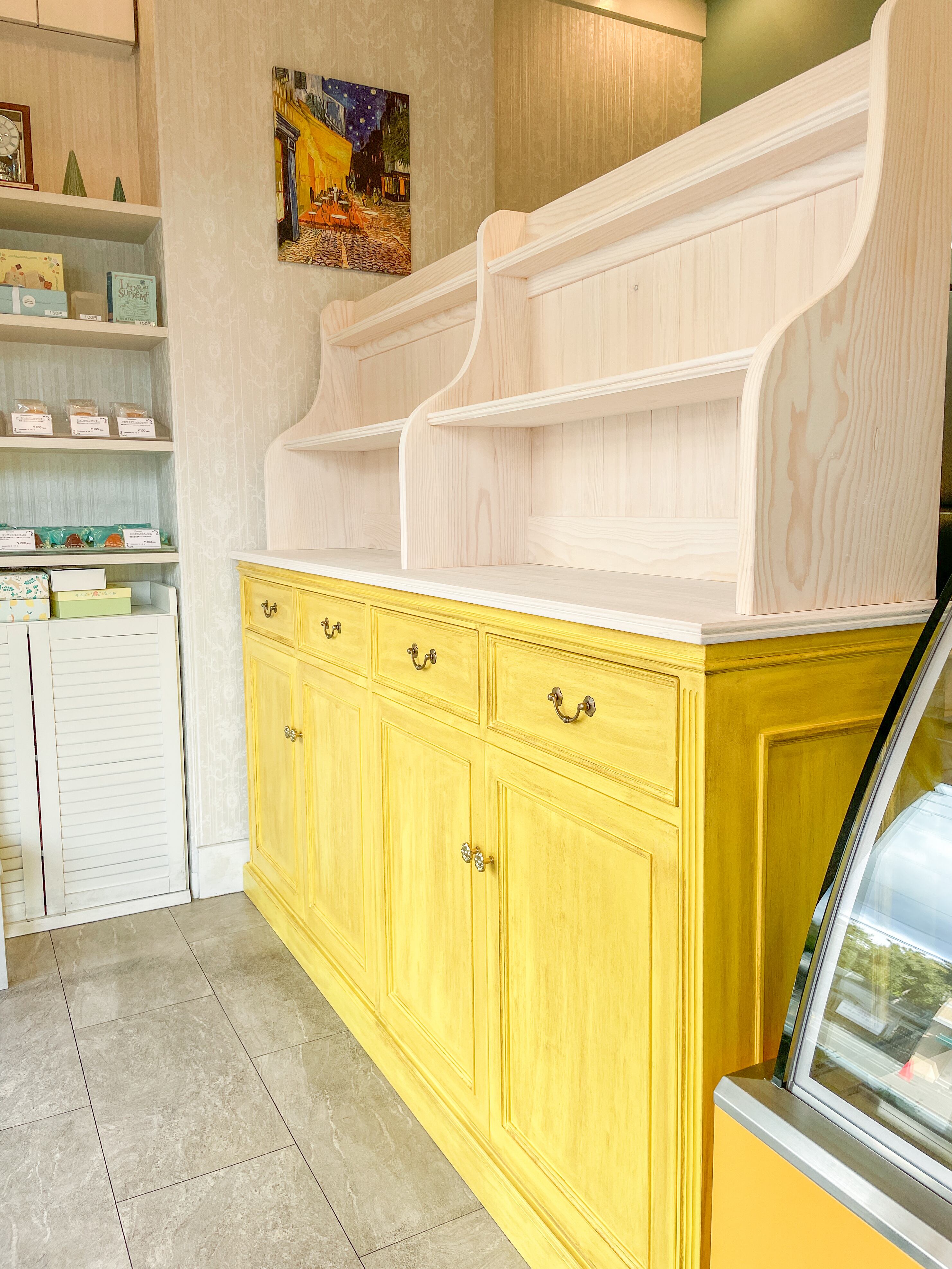 群馬県にオープンするお菓子屋さんに、かわいいディスプレイシェルフを納品させていただきました。フランスアンティーク家具をイメージしたアンティーク調デザインのキャビネット&オープンシェルフ。お店にピッタリのサイズ・カラー、貴店ならではの業務に対応する店舗家具をオーダーメイドで製作する家具店グレイスファニチャーです。