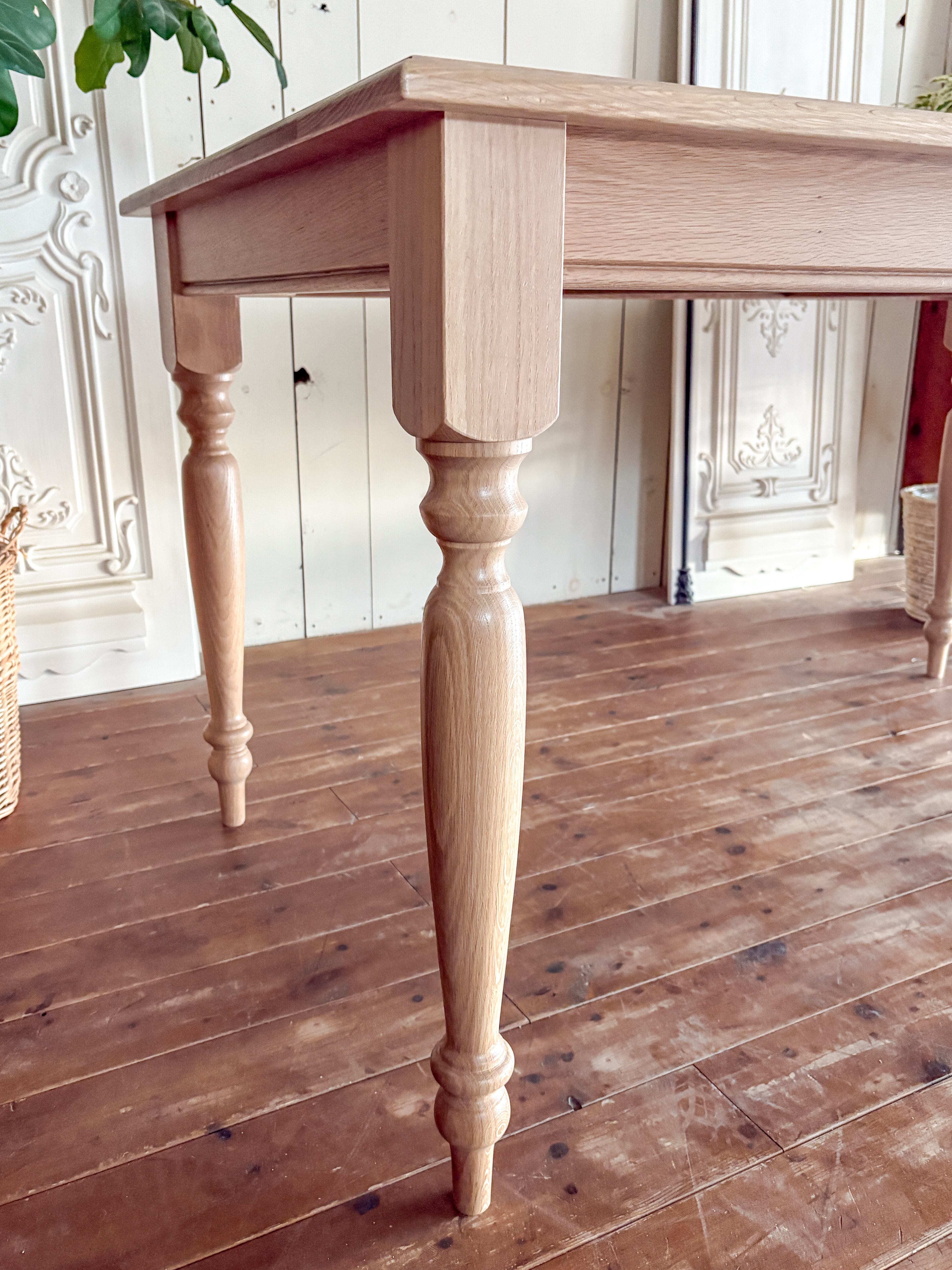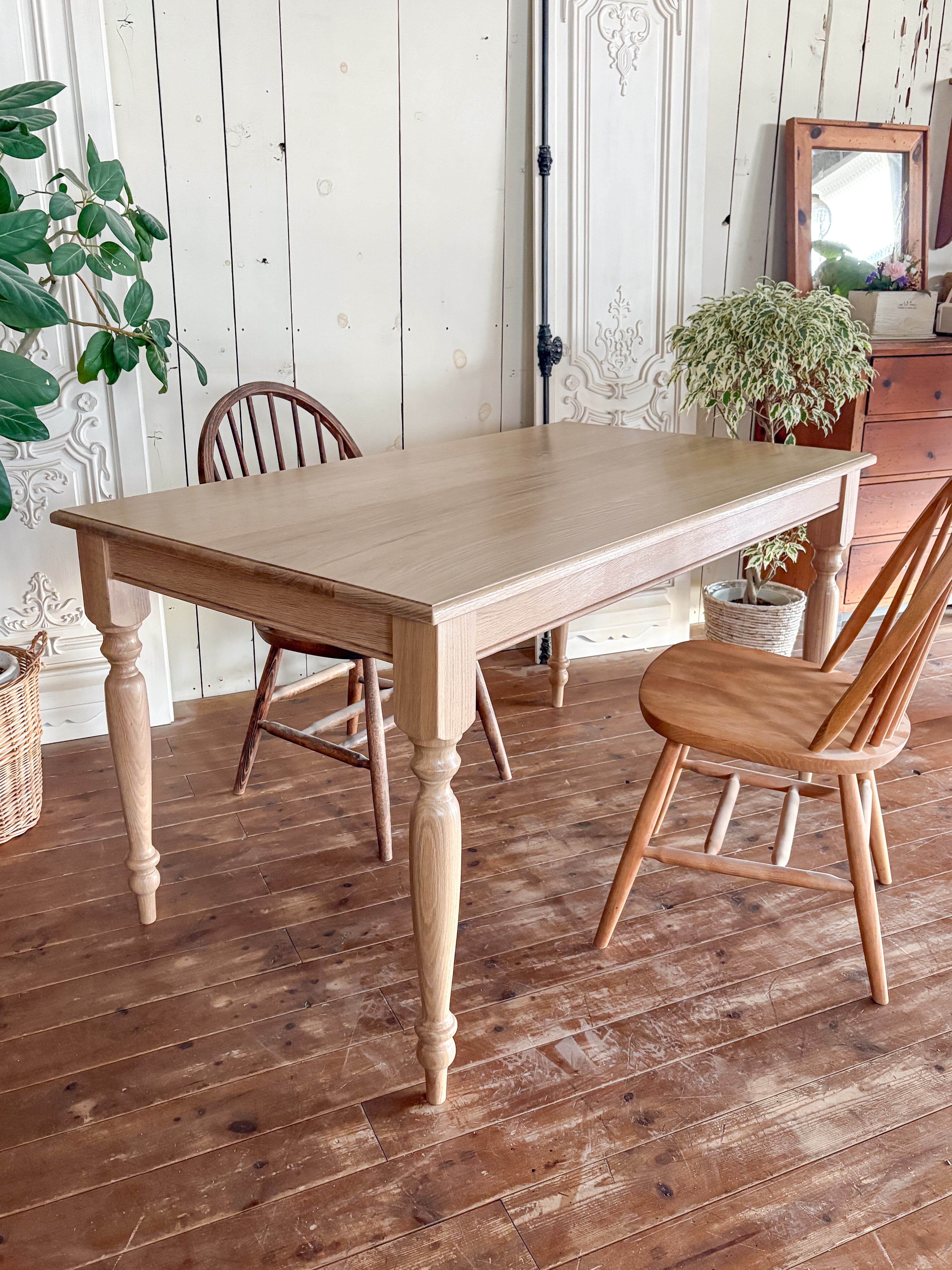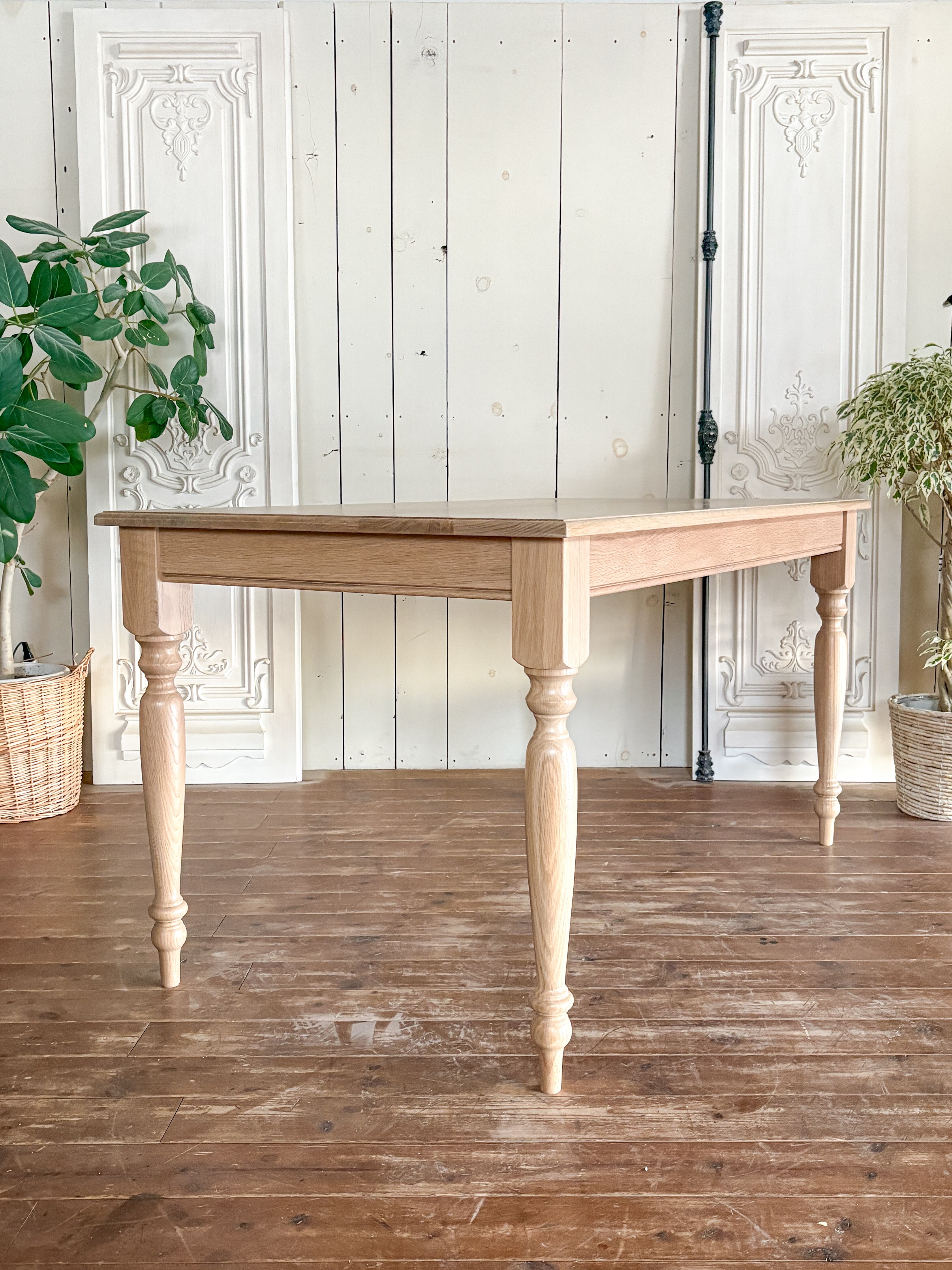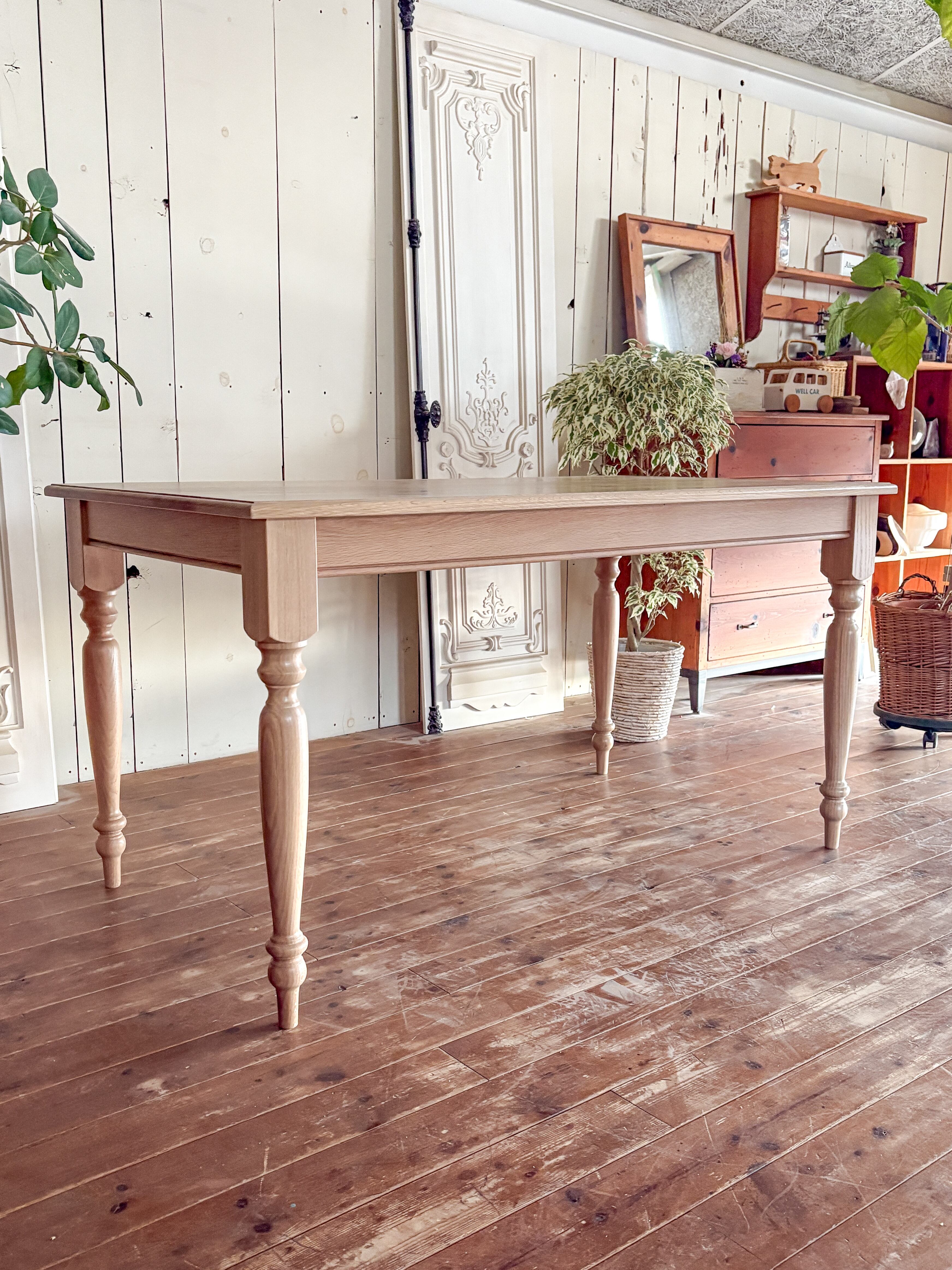 東京都のオーナー様に納品させていただいた、ろくろ足ダイニングテーブル。人気の木材ホワイトオーク無垢材を使って、高級感のある質感と木目を楽しめます。写真はクリア色防水ウレタン仕上げ。カラーやサイズを自由に選べるオーダーメイド家具の専門店です。輸入住宅や海外インテリア、アンティークインテリアによく似合うダイニングテーブルの製作はグレイスファニチャーにお任せ下さい。