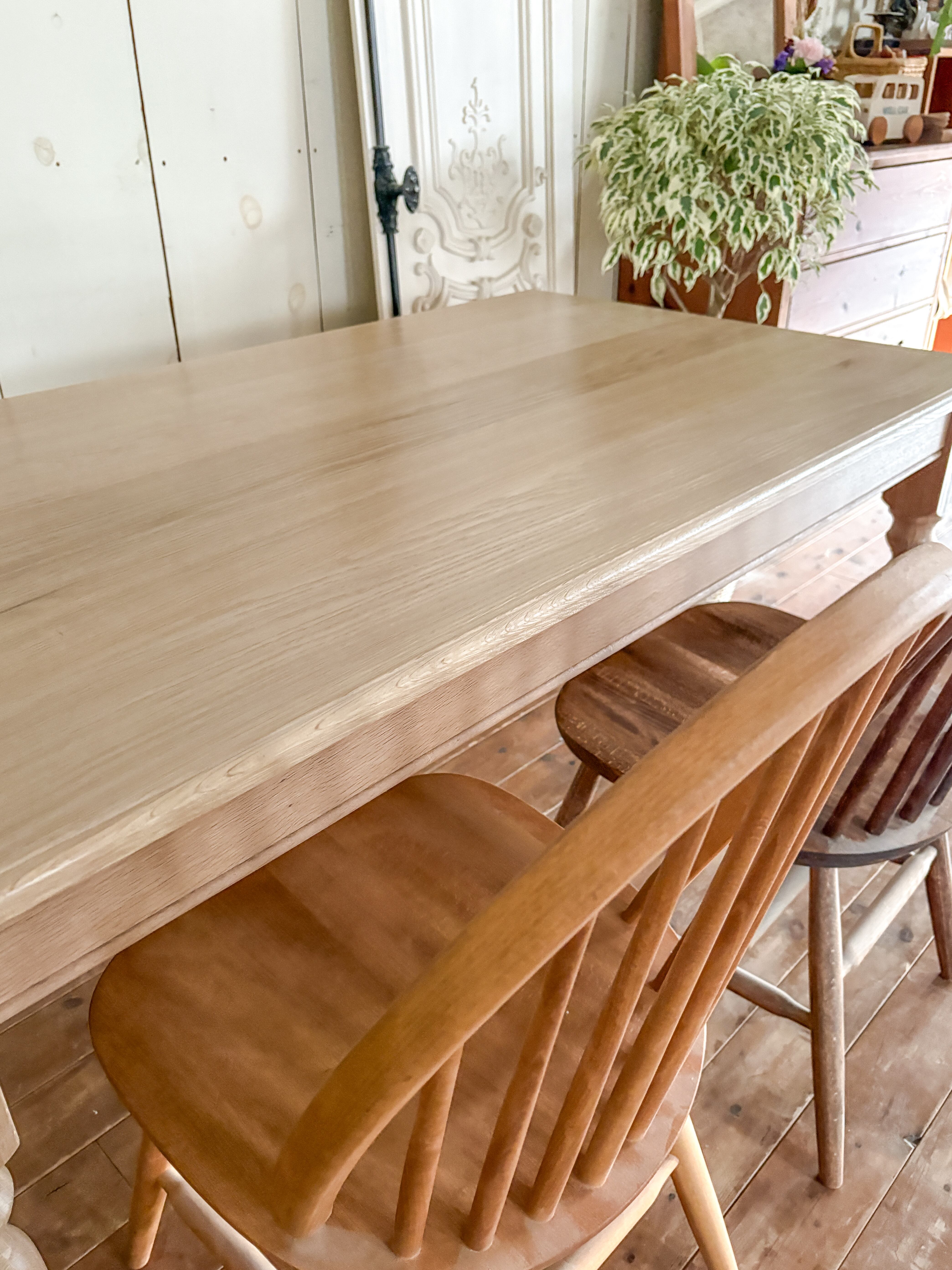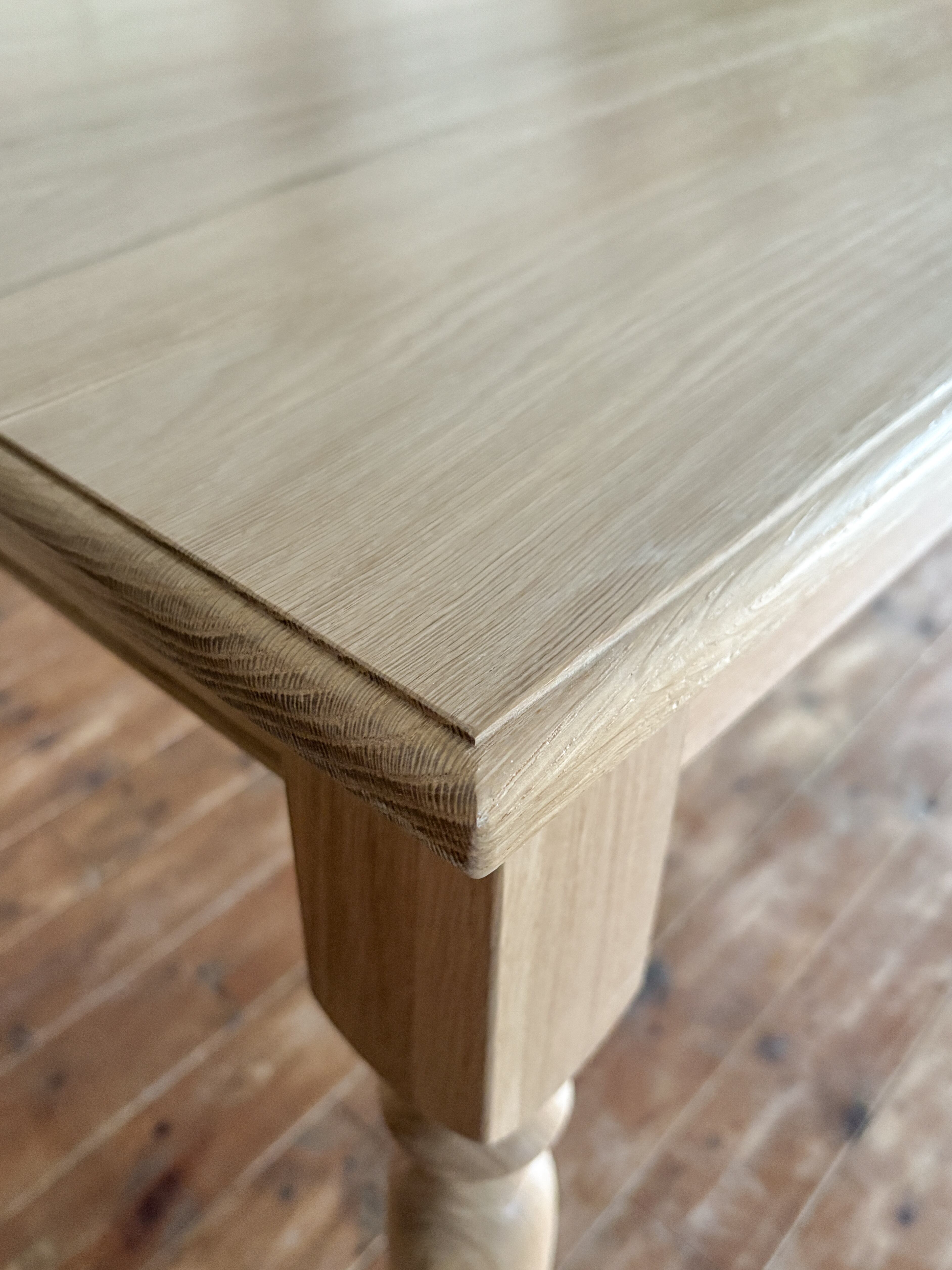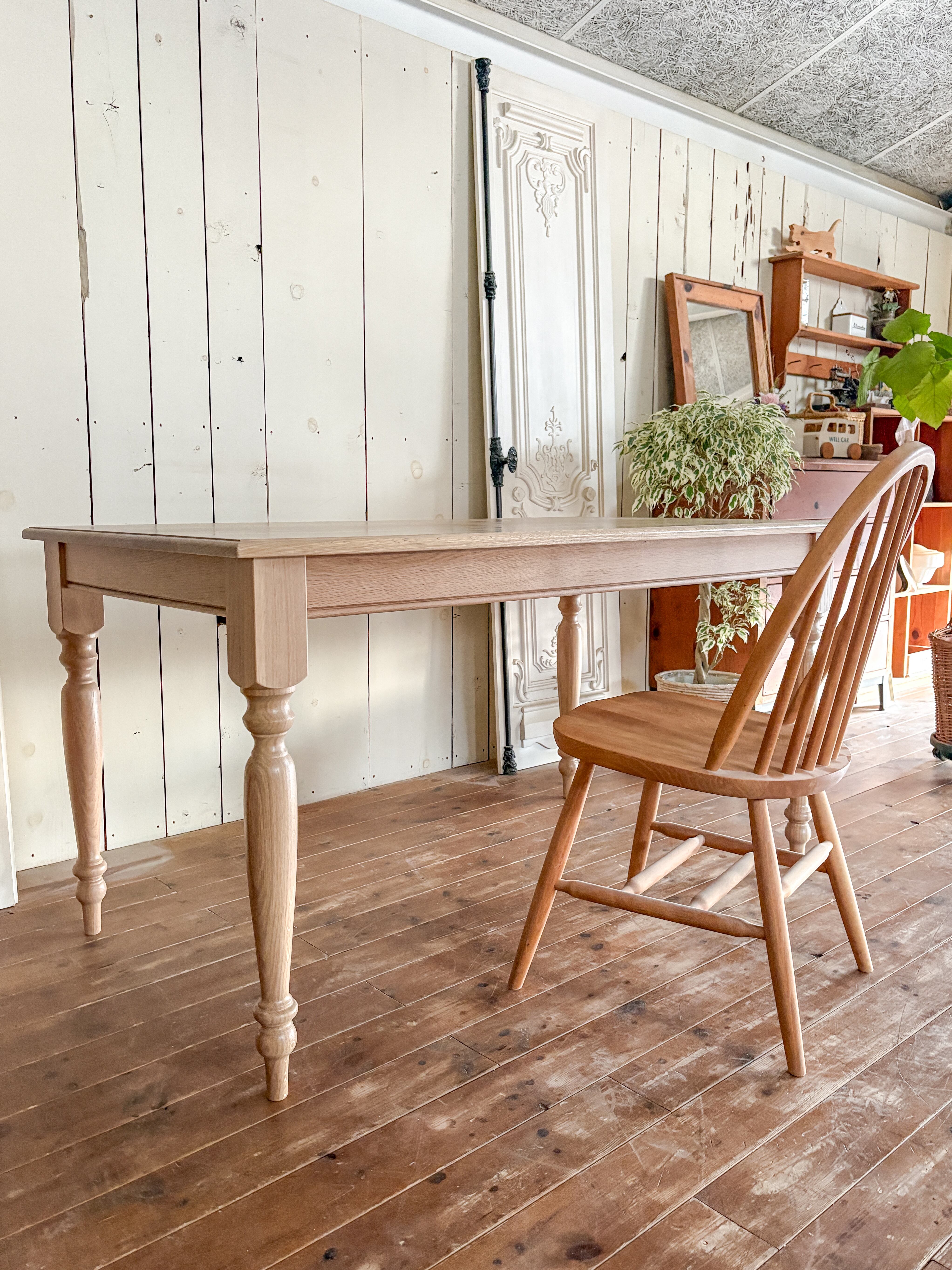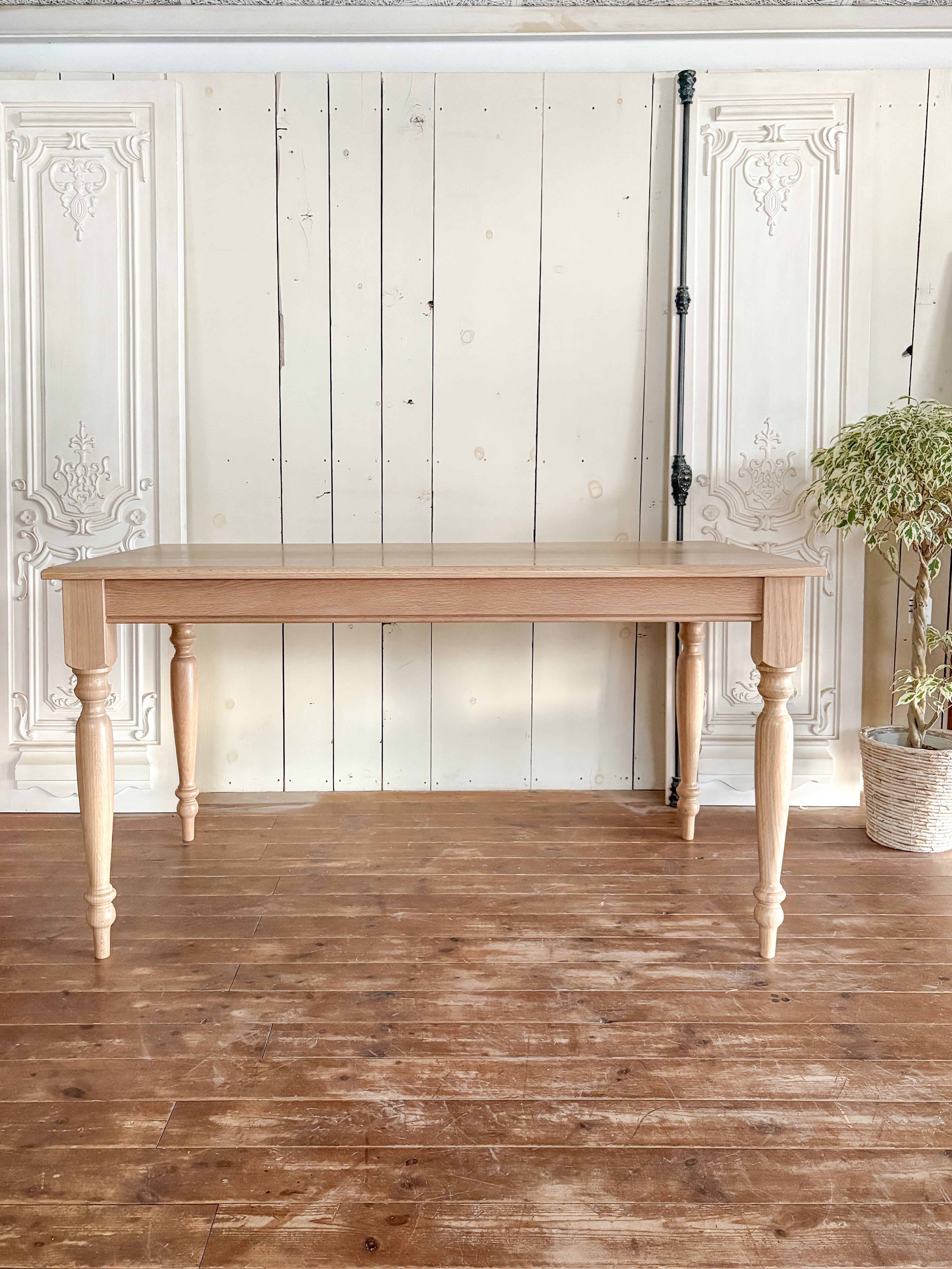 東京都のオーナー様に納品させていただいた、ろくろ足ダイニングテーブル。人気の木材ホワイトオーク無垢材を使って、高級感のある質感と木目を楽しめます。写真はクリア色防水ウレタン仕上げ。カラーやサイズを自由に選べるオーダーメイド家具の専門店です。輸入住宅や海外インテリア、アンティークインテリアによく似合うダイニングテーブルの製作はグレイスファニチャーにお任せ下さい。