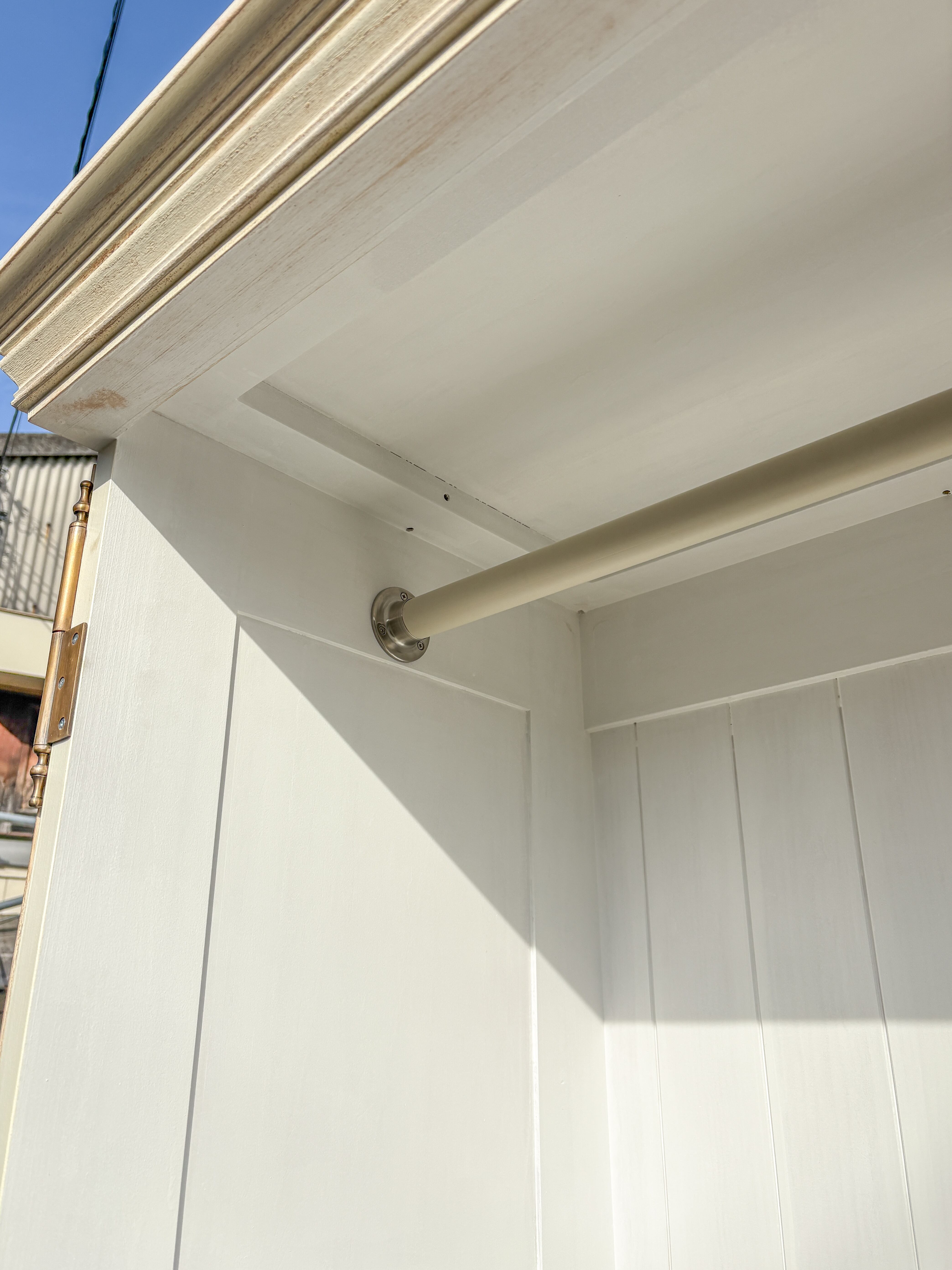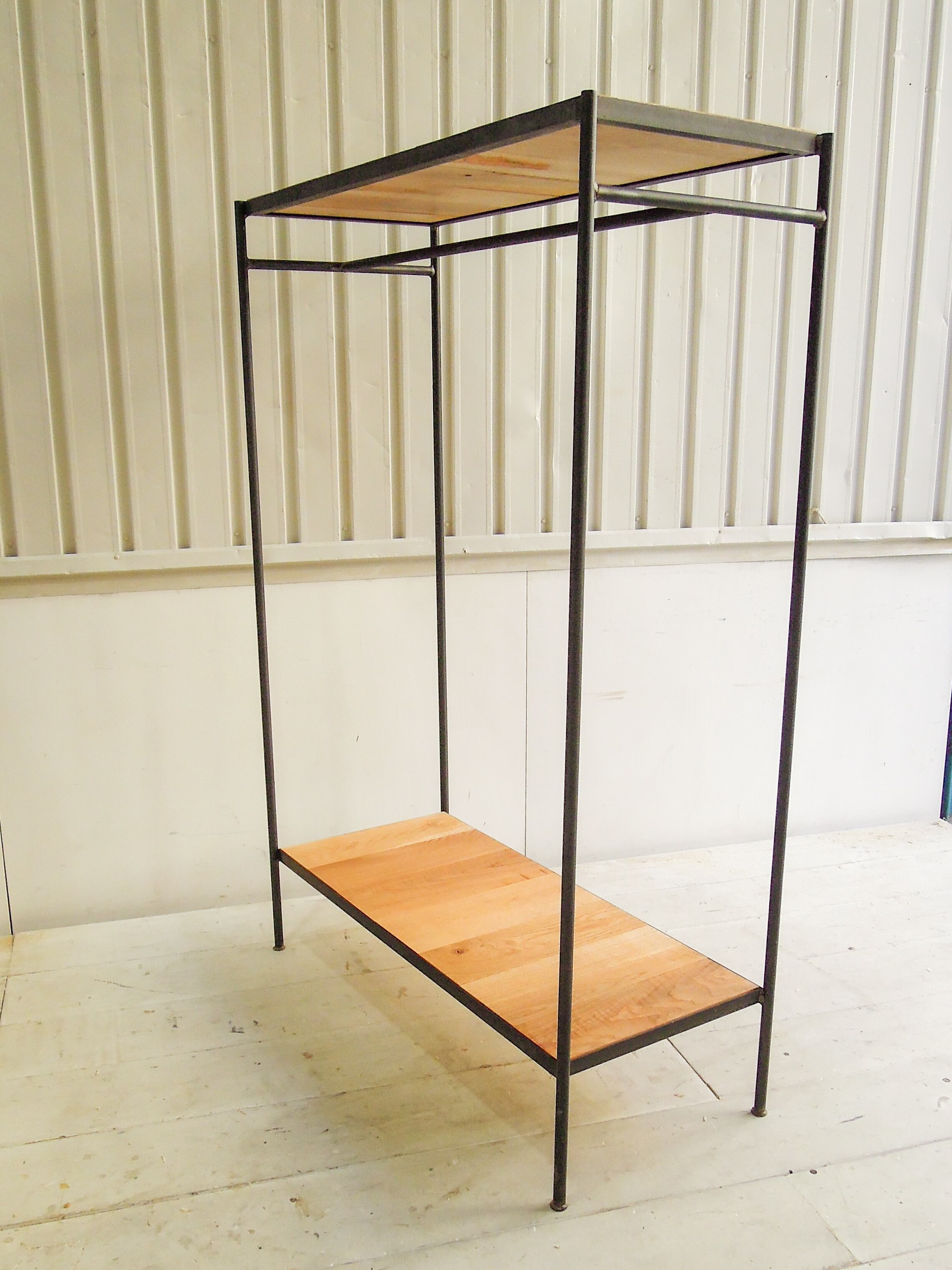 写真のサイズはW1000、D450、H15000mm、サイズオーダー対応いたします。ハンガースペースは1170mm、底板は床から175mm浮いています。ブラックアイアンは日本製。棚は人気の木材ホワイトオーク材を使いました。参考写真はクリア色、その他21色からお選びいただけます。