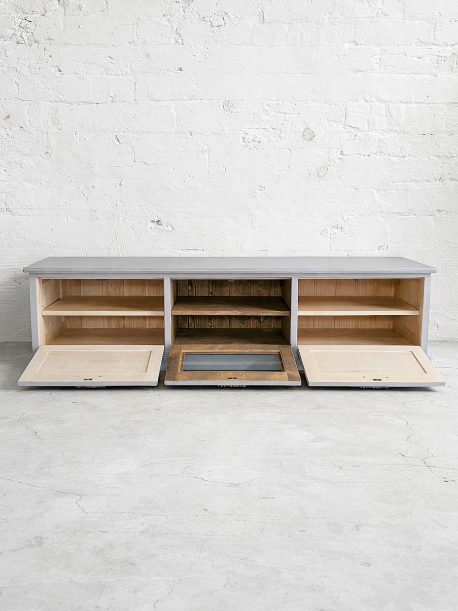 写真は横幅1500 奥行400、高さ400mm。左右の収納は木扉で中に可動棚、中央はガラス扉の中に可動棚です。おしゃれな真鍮取っ手は100種類以上のデザインから選べます。収納はその他、引出し、オープン棚など自由にカスタマイズできます。キャビネットとテレビボードを合体させた壁面収納家具の製作も得意です。