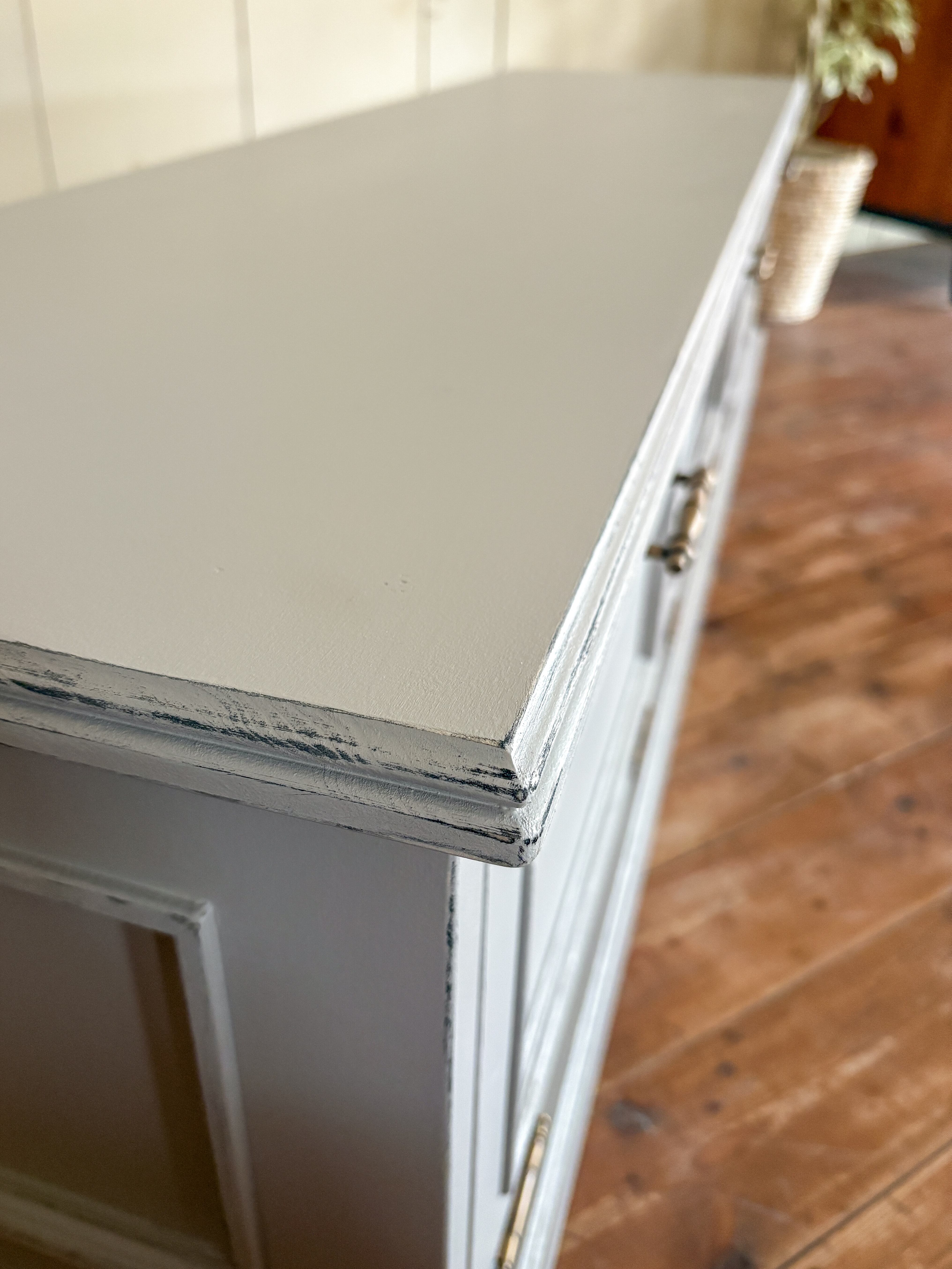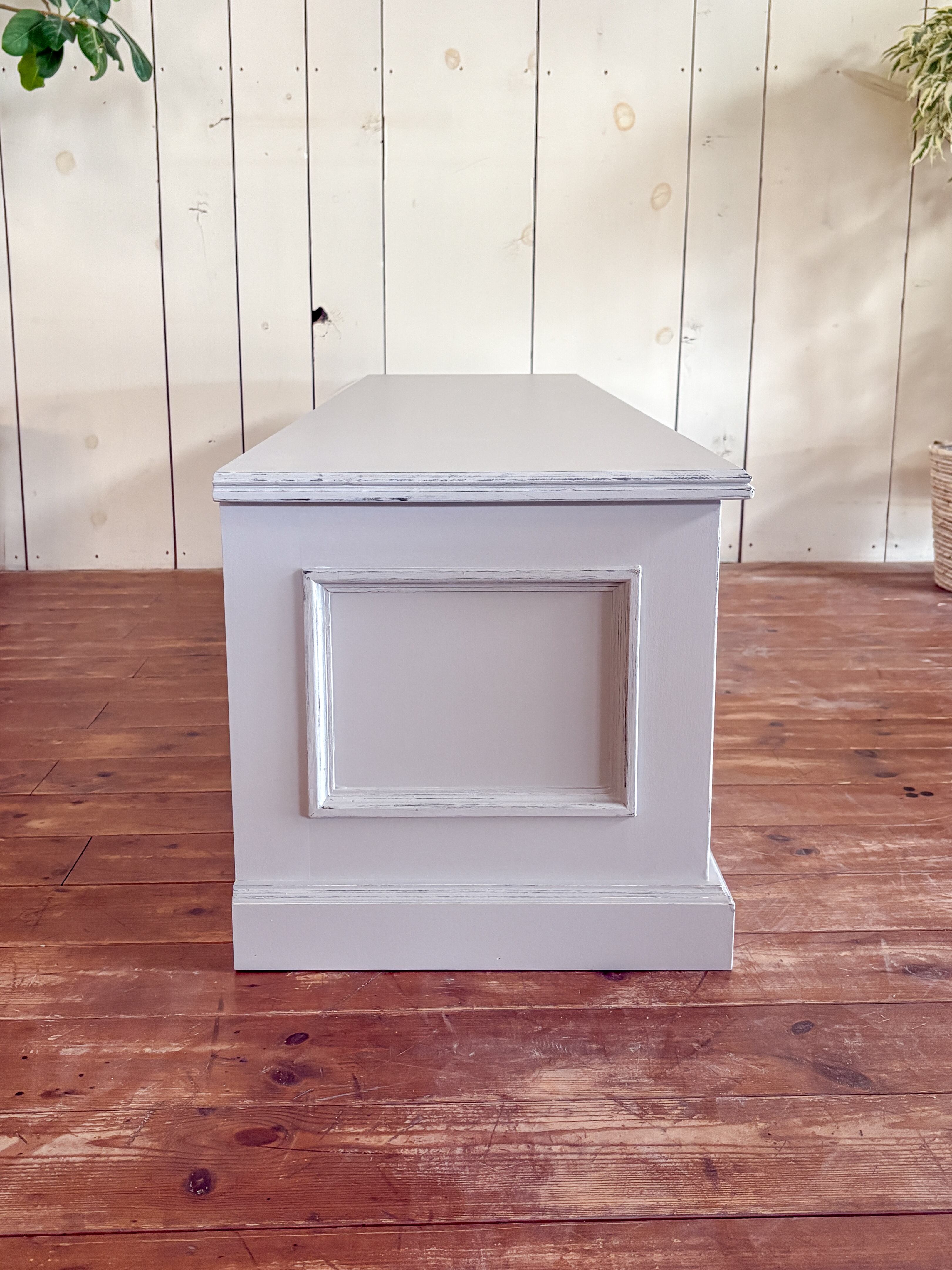 熟練の日本人職人が一点一点手作りしています。無垢の木材を使った家具は丈夫で重厚感があります。写真のカラーは角が削れたようなエイジングペイント「アンティークソフトグレー色」、その他基本カラー21色から選べます。日本全国に家具専用デリバリーで搬入設置致します。納品実績は3500件以上、安心クオリティのオーダーメイド家具専門店です!