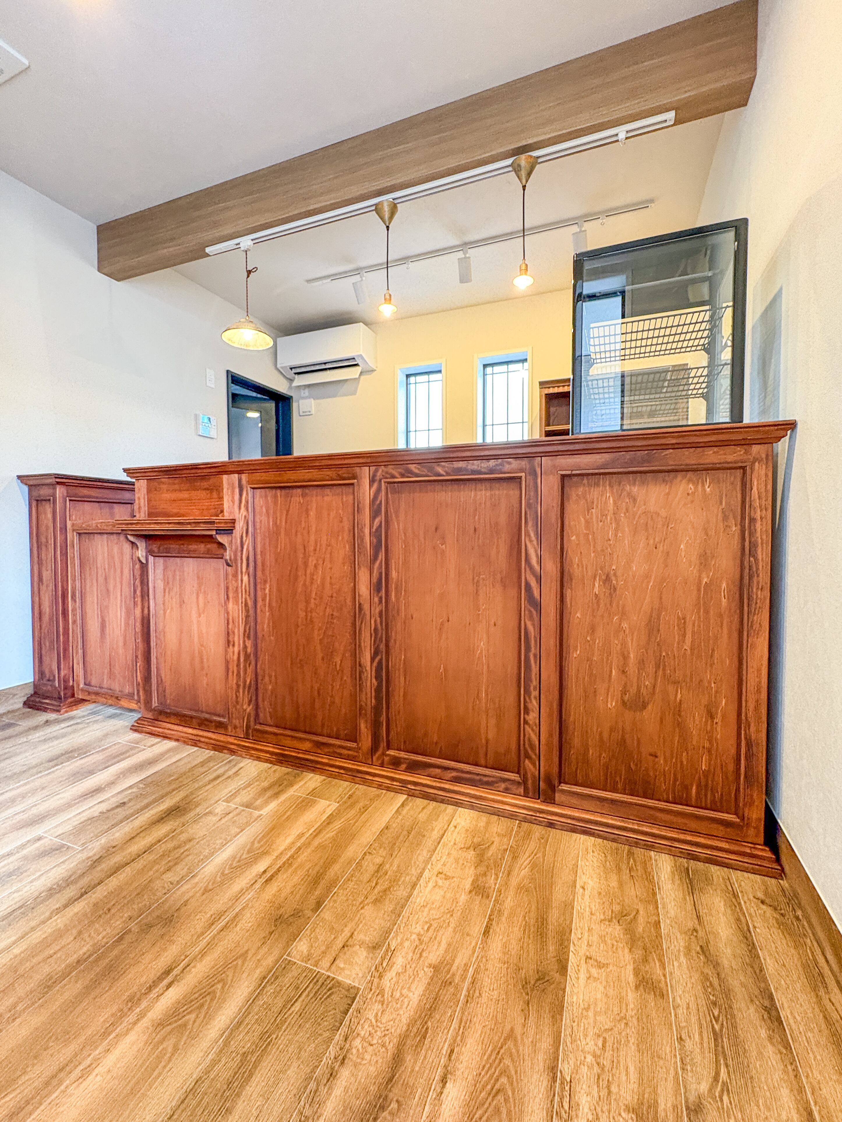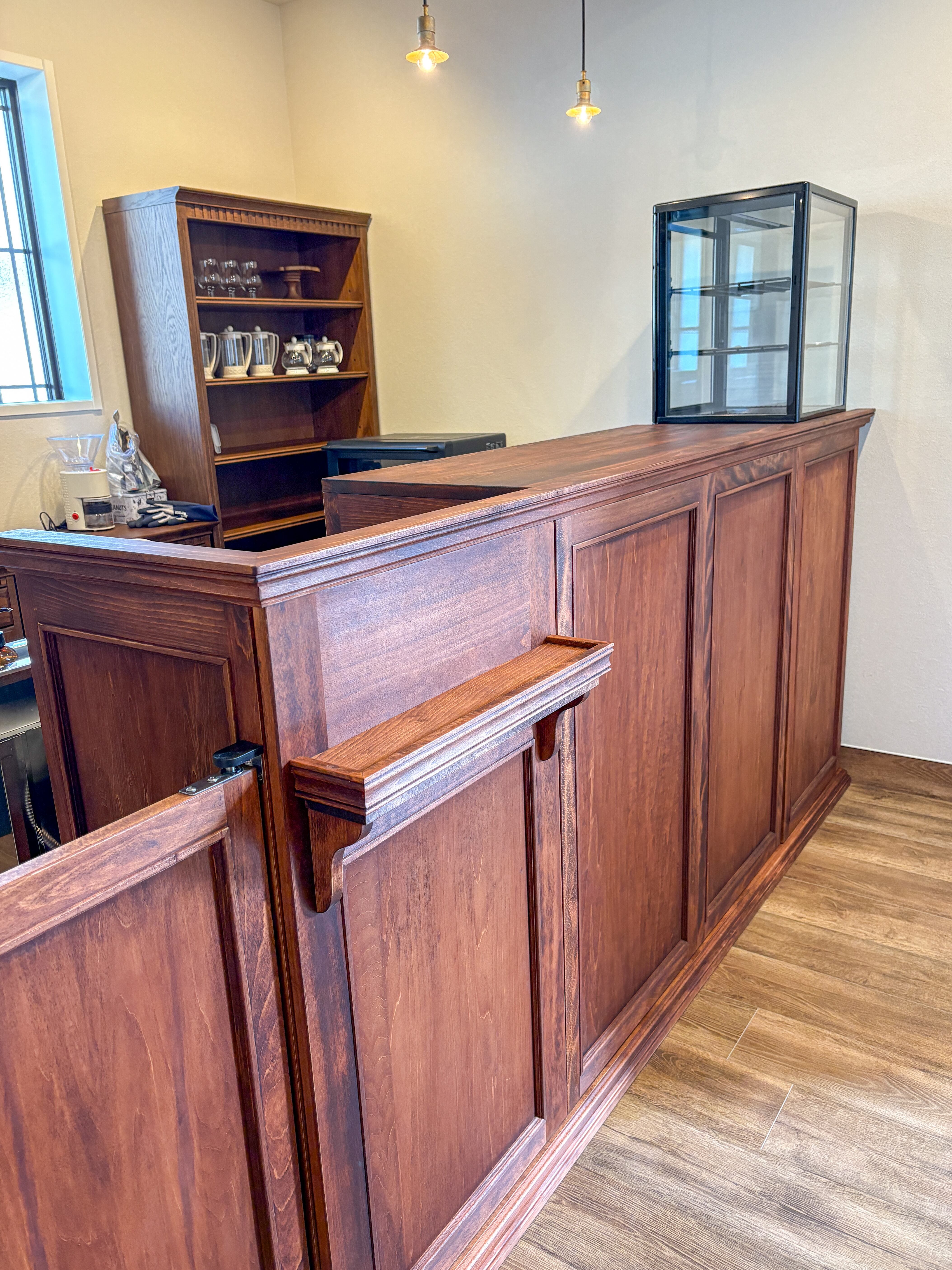 茨城県にオープンするスイーツ屋さんに、ショップカウンターを特注製作させていただきました。ホワイトビーチ無垢材を使った洗練されたイメージのカウンターで、収納カウンター、スイングドア、スリムキャビネットのセットです。総幅3070mmで、お店の端から端までにぴったり設置しました。お菓子屋さんケーキ屋さんにぴったりのカウンター、ショーケースなど、グレイスファニチャーにお任せください!