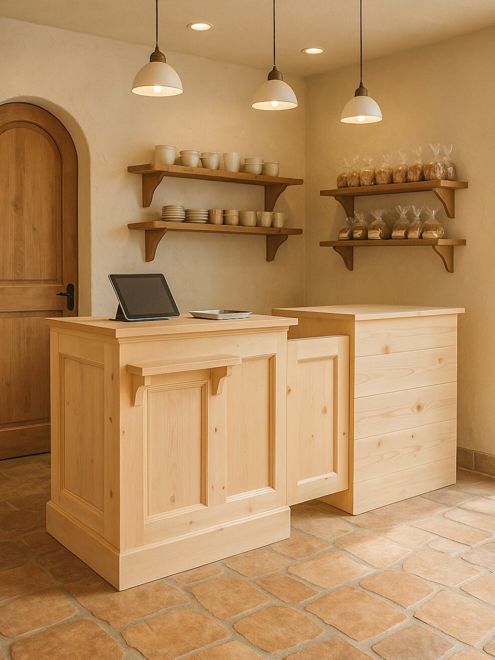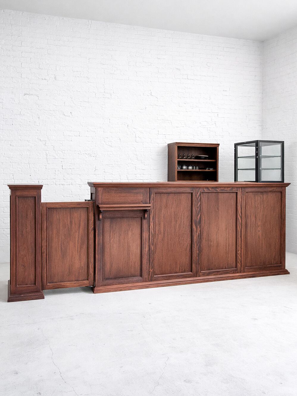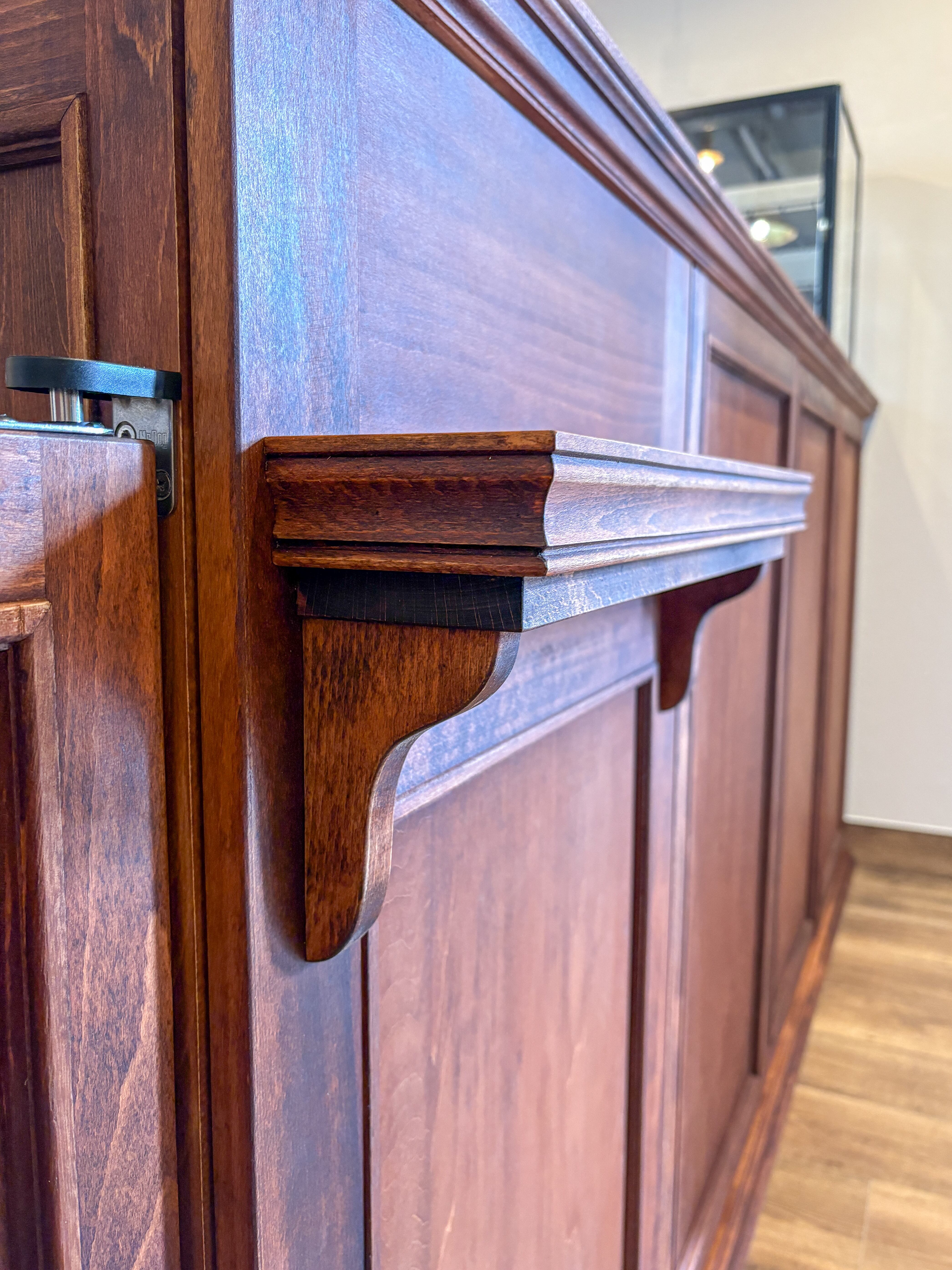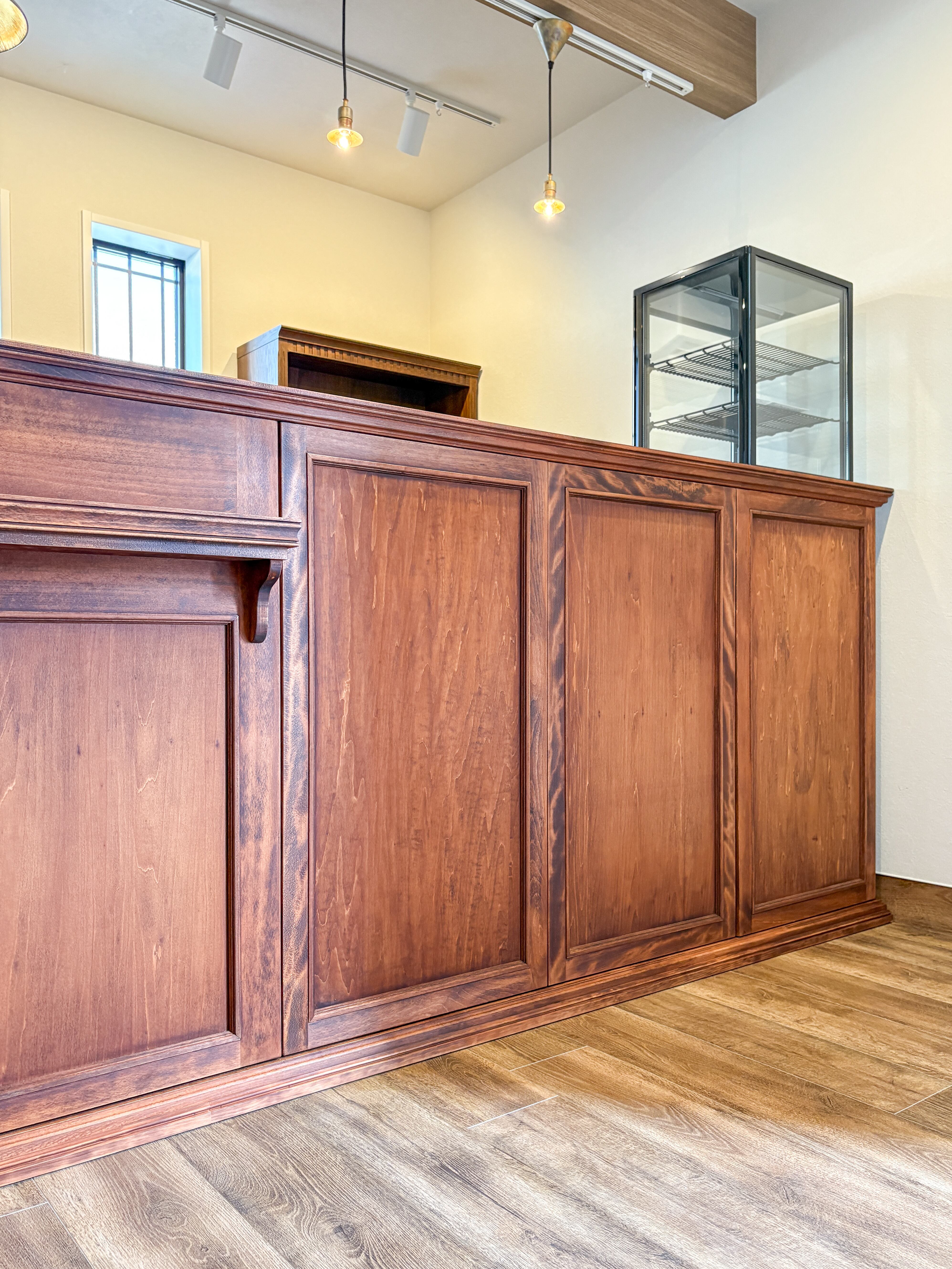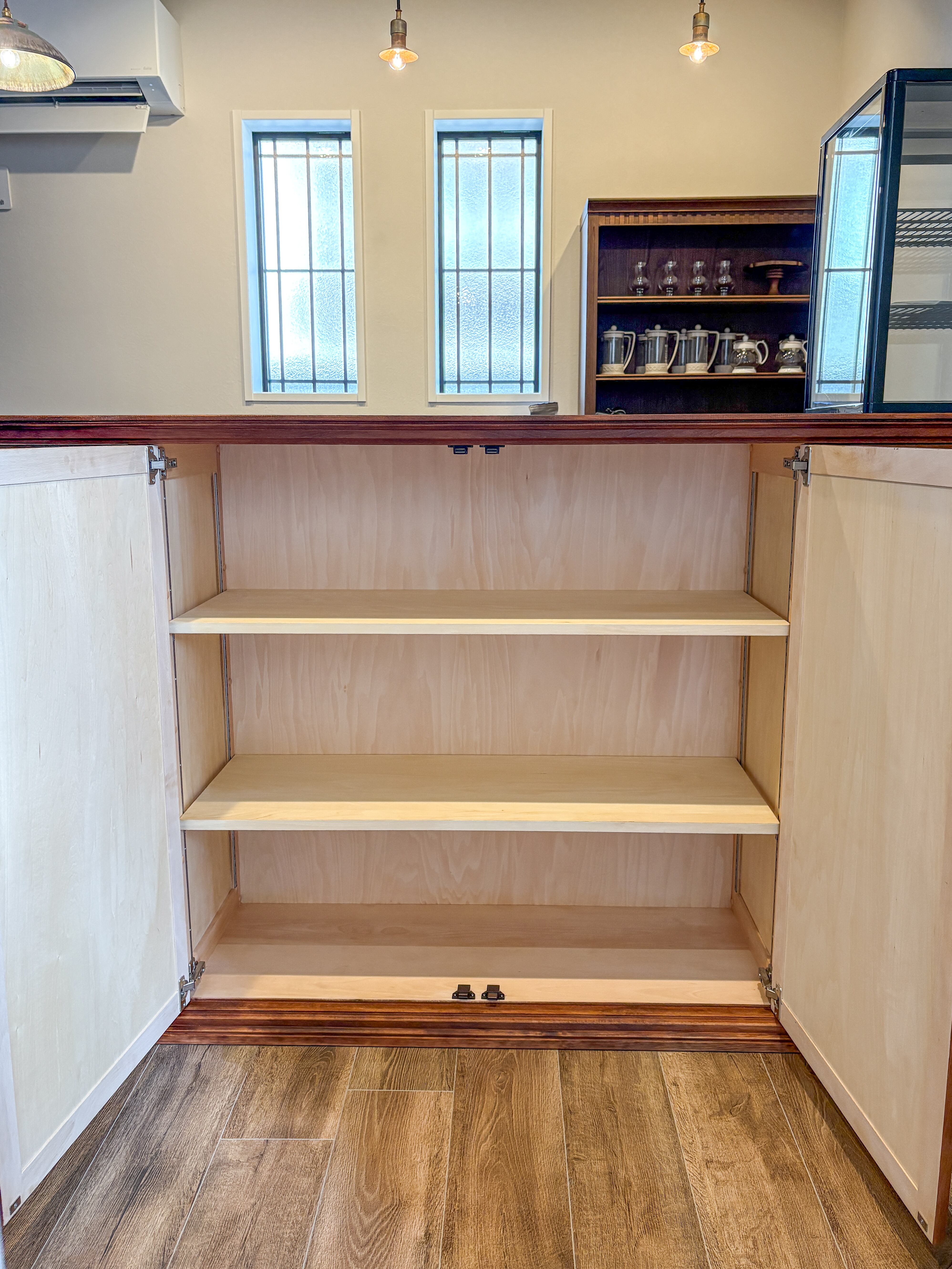 向かって左からスリムキャビネット(内側可動棚)、スイングドア、レジキャッシャーを収めるスペース、扉収納、右端には冷蔵ショーケースを埋め込むスペースです。貴店のニーズに合わせたショップカウンターを、オーダーメイドで承ります。