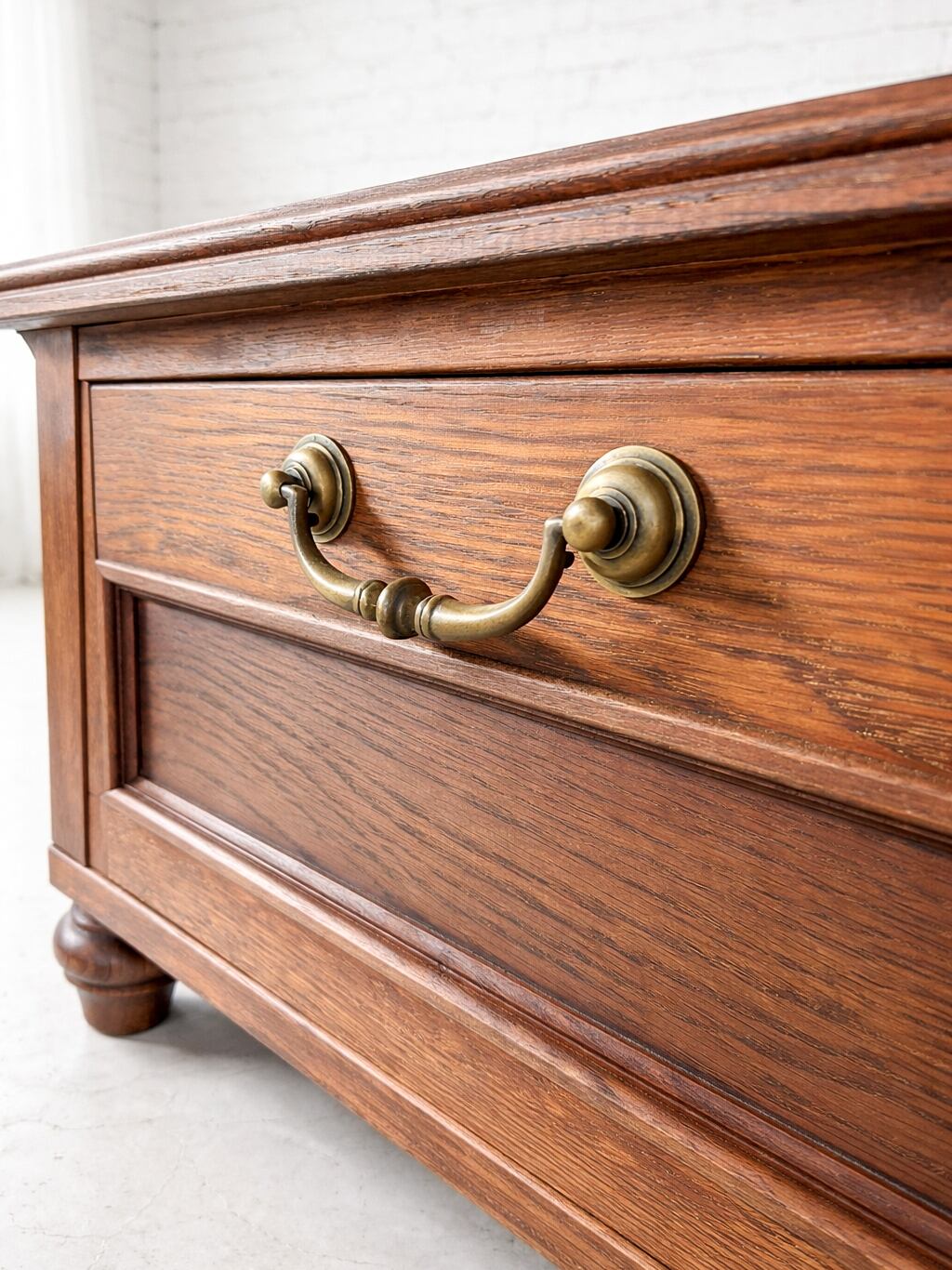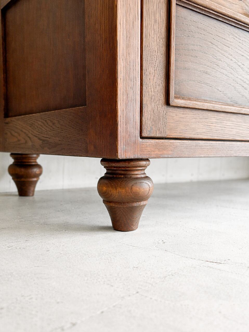 写真はW1650、D500、H400mm、奥行少し大きめの特別なサイズオーダーでした。1cm単位でサイズオーダーも可能です。コロンとかわいいろくろ脚がデザインのポイント、床から10cm浮いています。写真は「特注ダークオーク色」、レッドオークの繊細な木目に濃い色を合わせると高級感が出ます。その他基本カラー21色をご用意しております。
