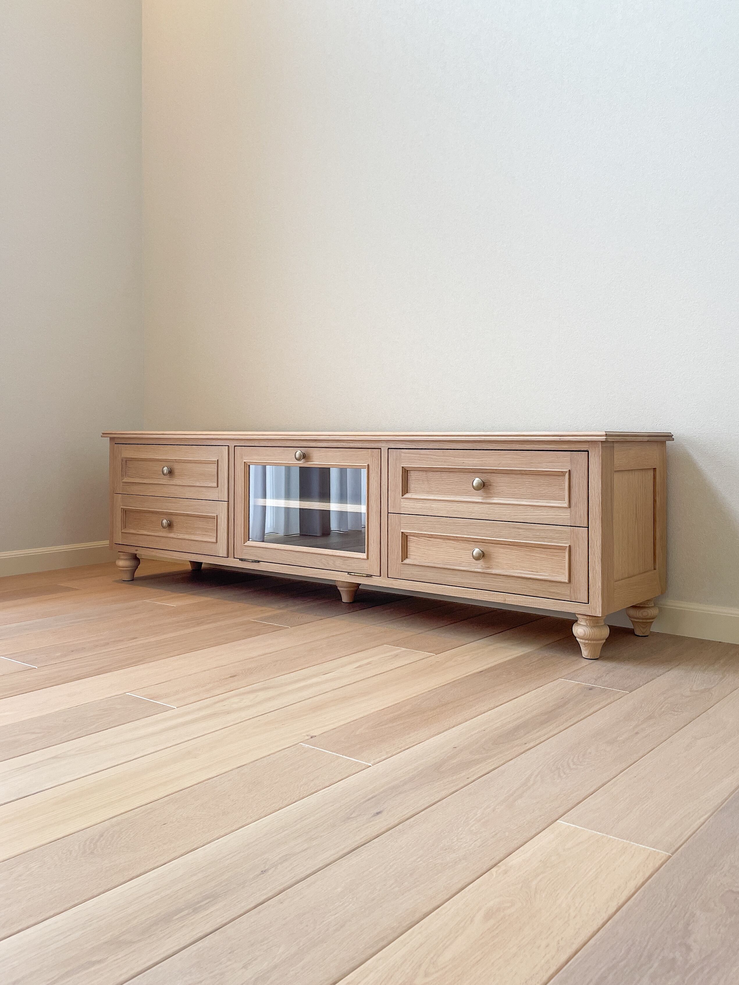 北海道のオーナー様に、レッドオーク材を使ったクラシックアンティーク調のテレビボードを製作させていただきました。輸入住宅に馴染むデザインで、細かなサイズオーダーに対応します。最近は壁掛けテレビも増えてテレビボードの需要も減ってきましたが、ゲーム機や映画の保管などおしゃれなリビング収納にいかがでしょうか。