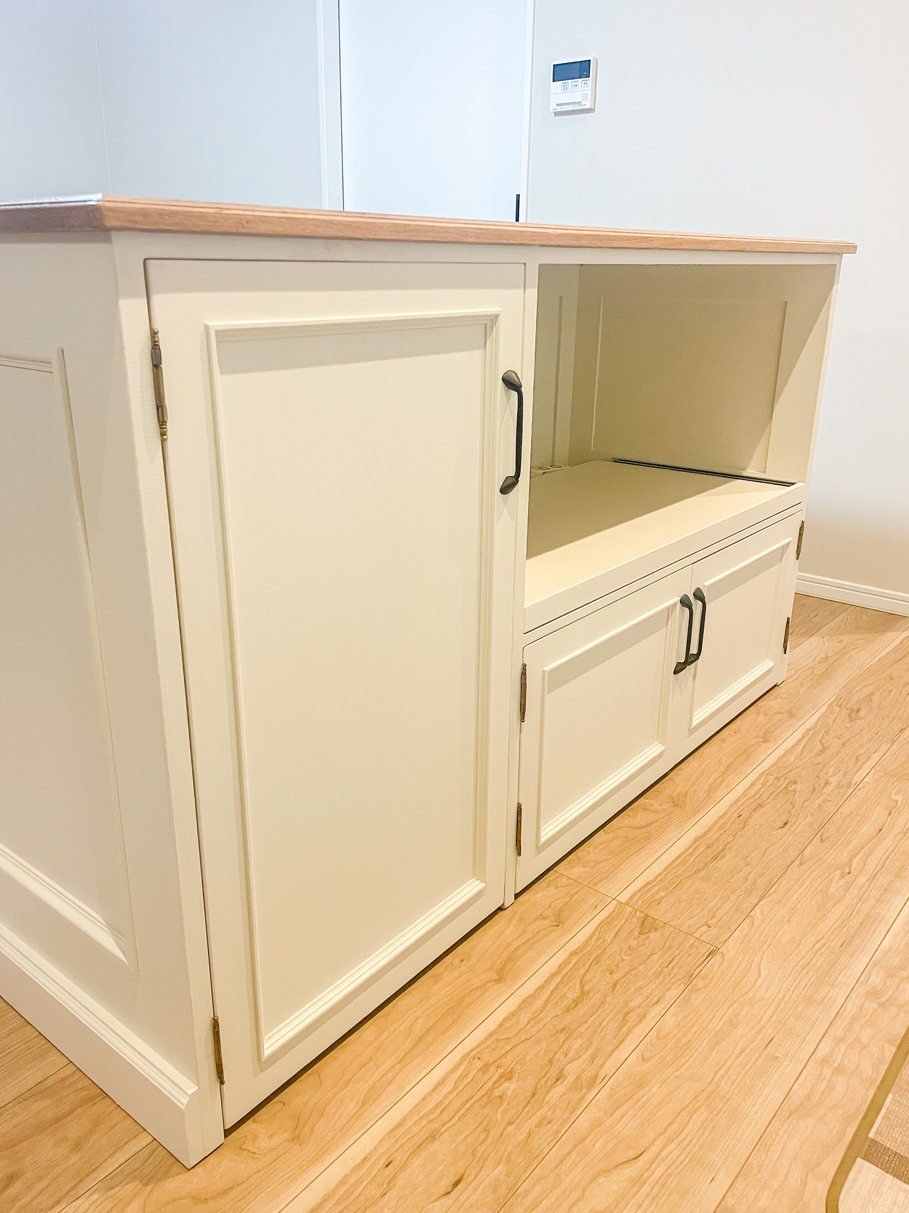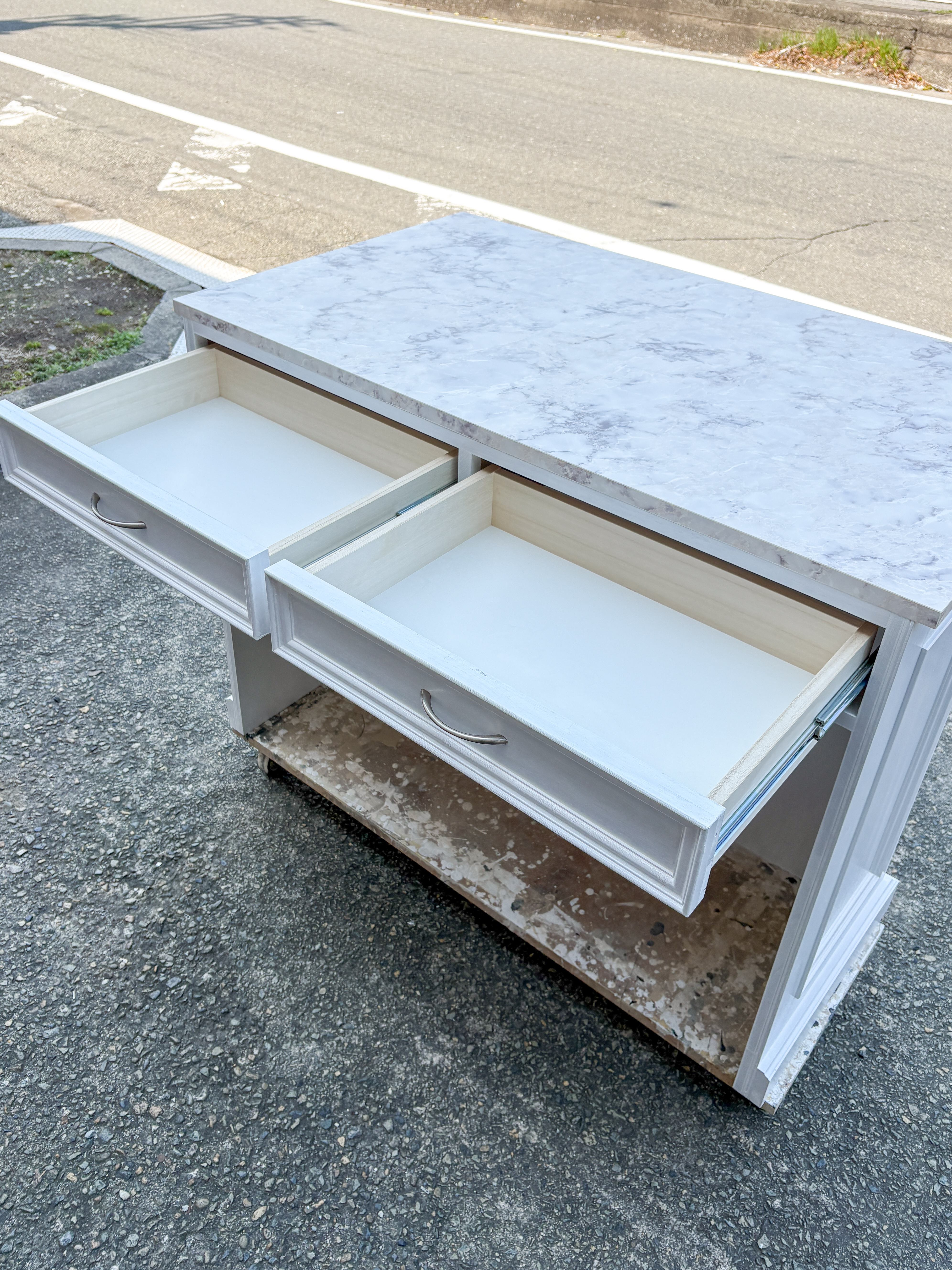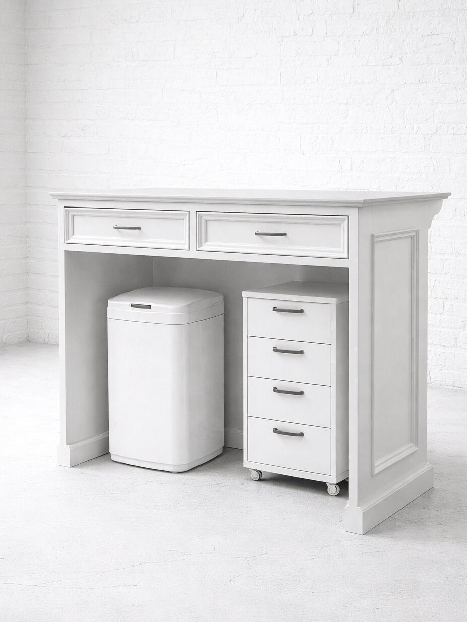 写真はW1200、D700、H900mm、天板が本体から飛び出た形状のカウンターテーブルです。内側の収納は、引出し、扉、スライドテーブルなど自由にカスタマイズできます。写真は、上段に幅広の引出しを2杯設置、下はゴミ箱や既存のワゴン収納を置けるように底板なしオープンに製作しました。
