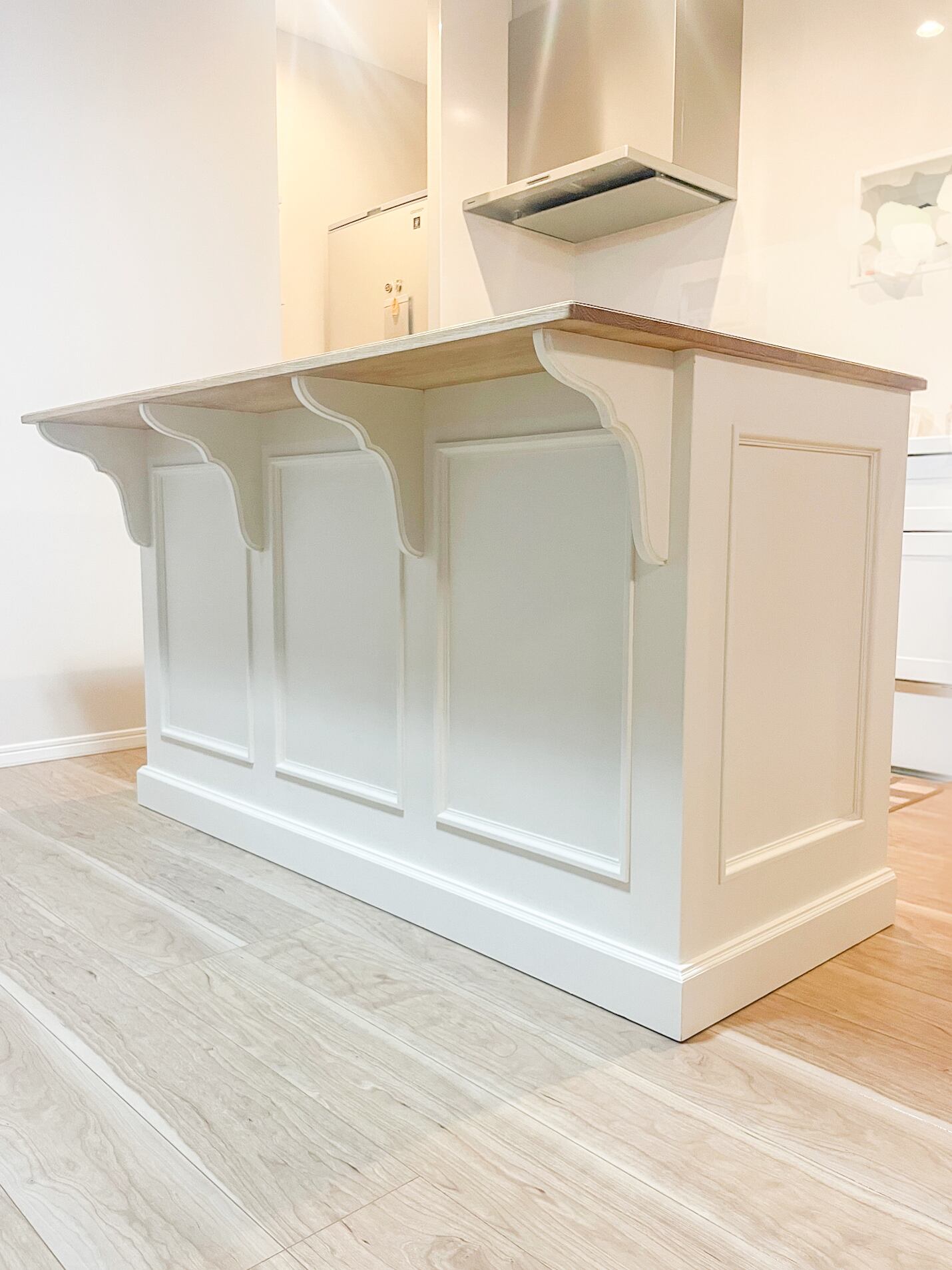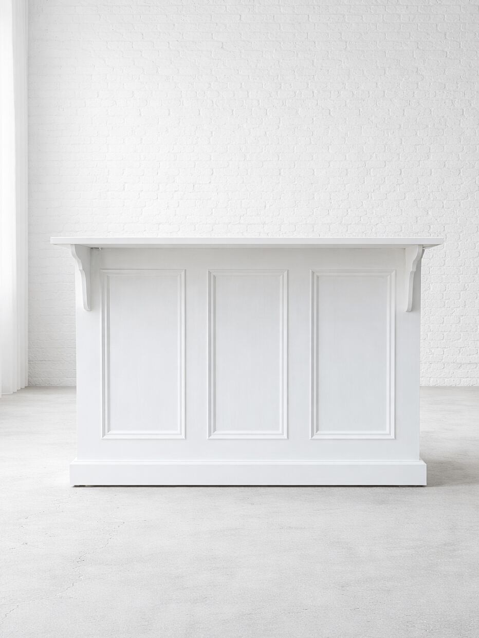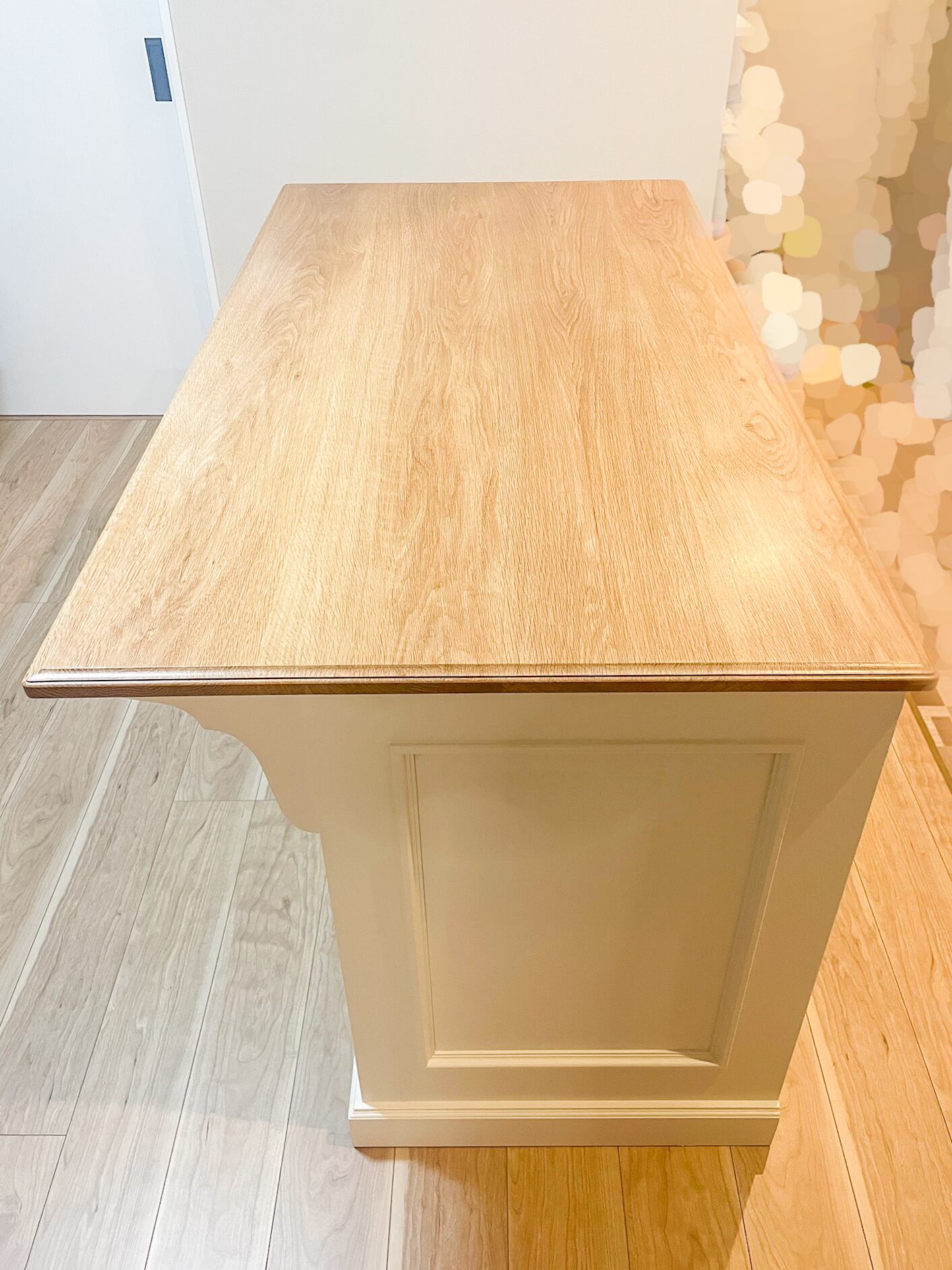写真はW1200、D700、H900mm、天板が本体から飛び出た形状のカウンターテーブルです。内側の収納は、引出し、扉、スライドテーブルなど自由にカスタマイズできます。写真は、上段に幅広の引出しを2杯設置、下はゴミ箱や既存のワゴン収納を置けるように底板なしオープンに製作しました。
