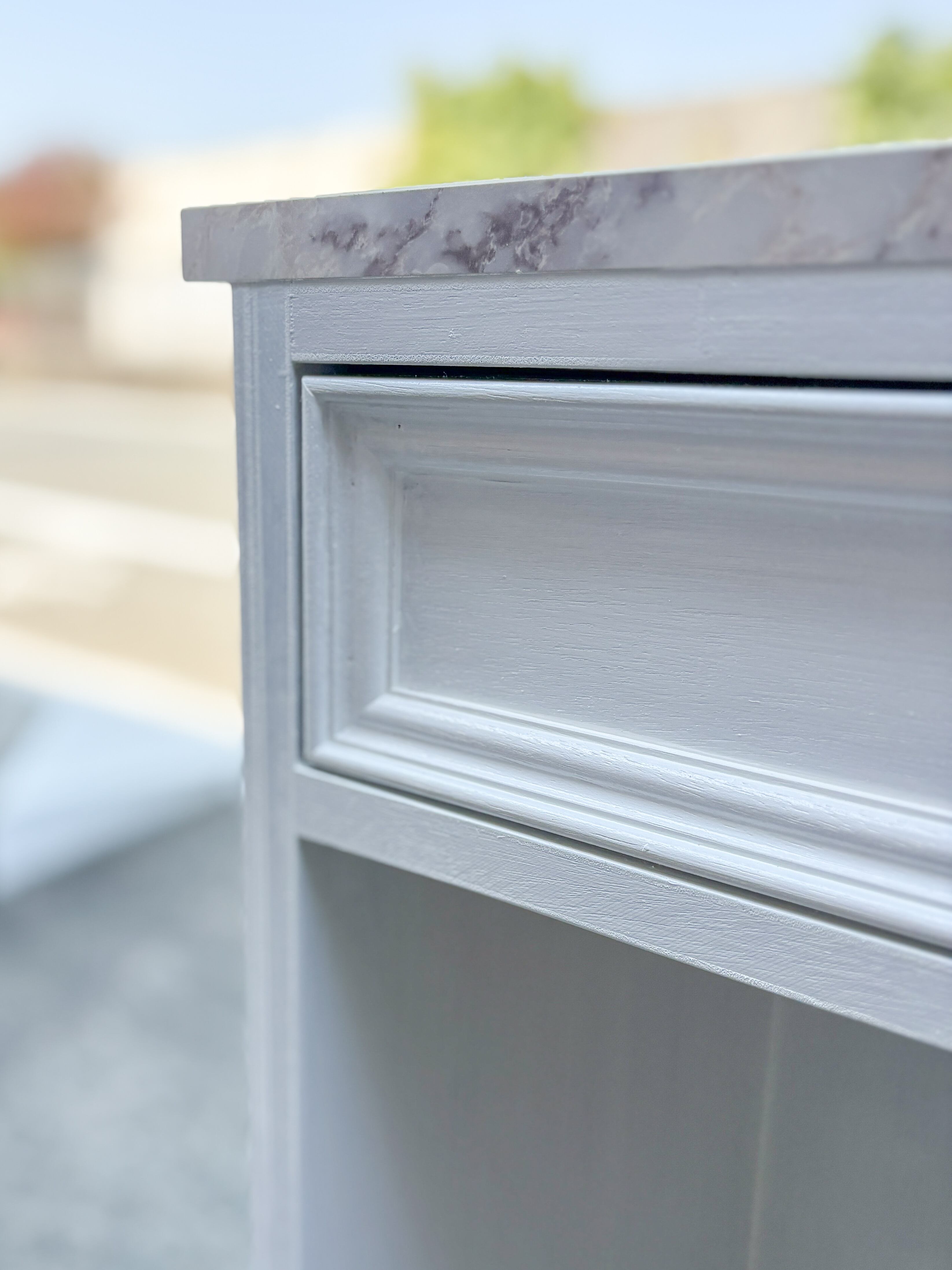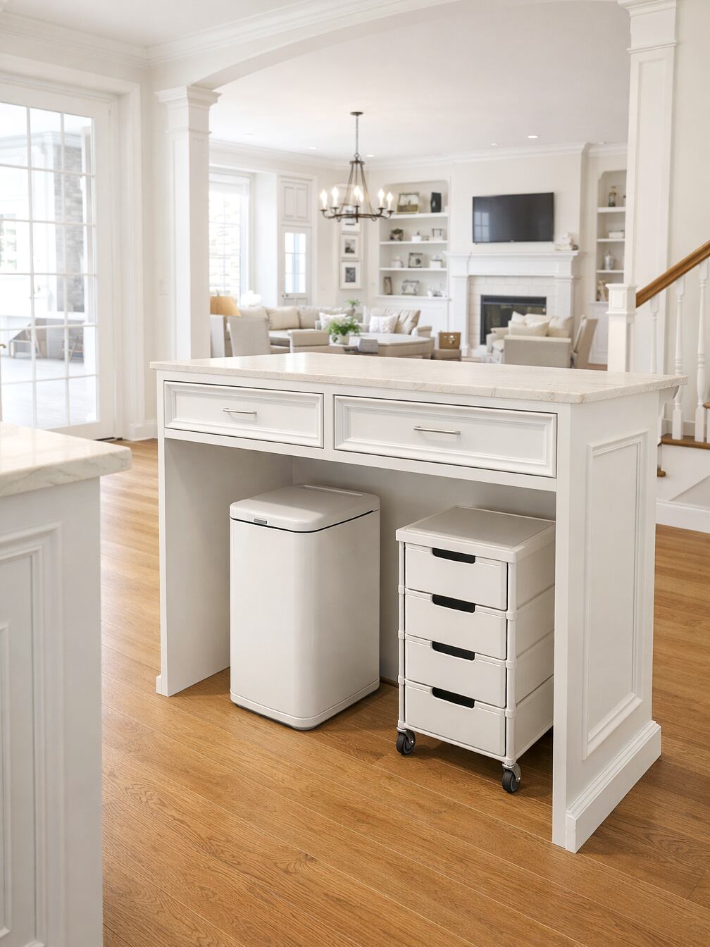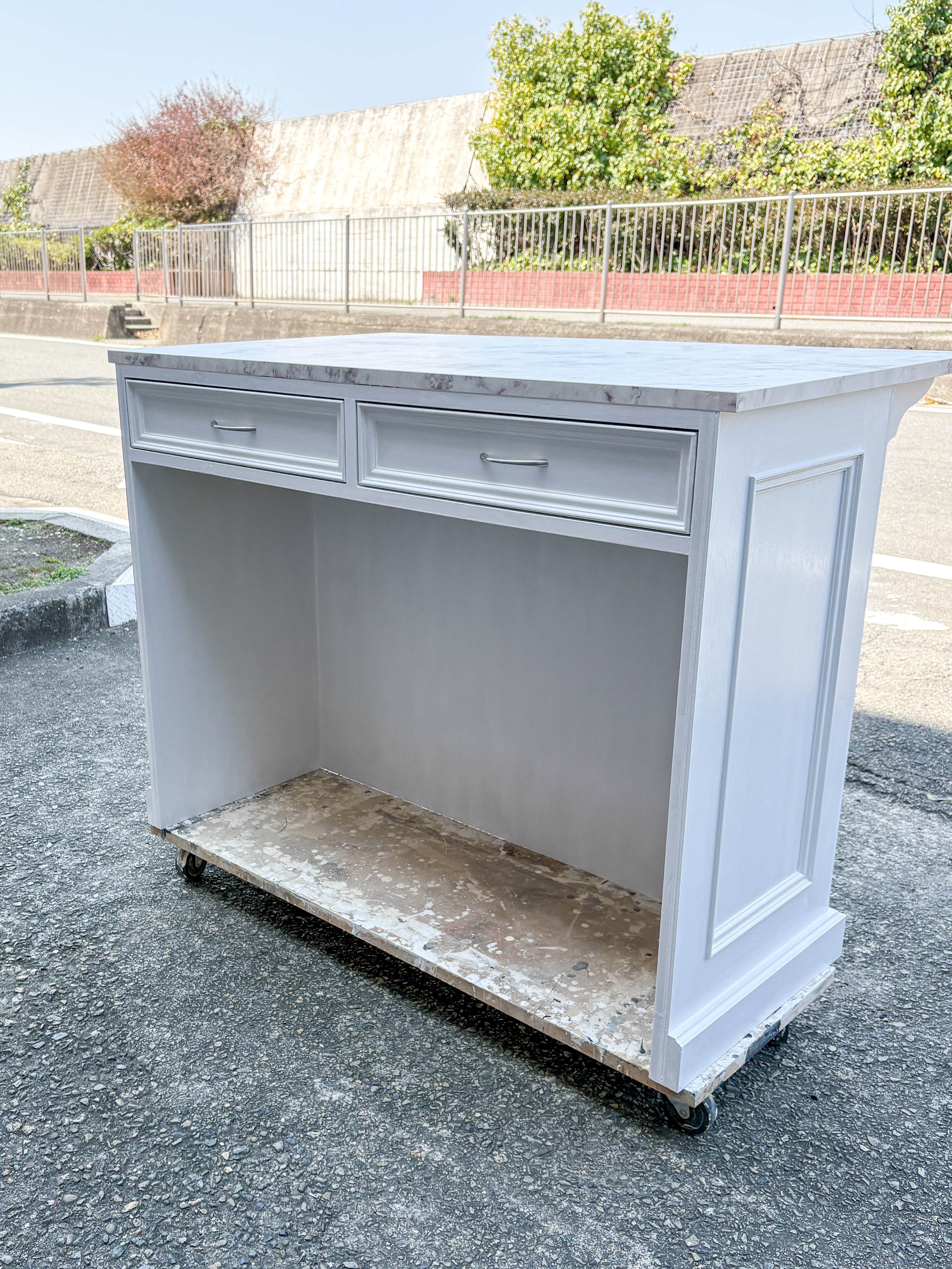 兵庫県のご新築住宅に、海外インテリア風のアイランドカウンターを製作させていただきました。天板には大理石メラミンを使い、おしゃれで高級感がありつつ、耐水耐熱耐キズ性能も高いです。収納は幅広の引出しを2杯、下はゴミ箱や既存のワゴン収納を入れるためオープンスペースにしました。キッチンカウンター、キッチンバック収納家具、手洗い台などのオーダーメイド、グレイスファニチャーにお任せ下さい。
