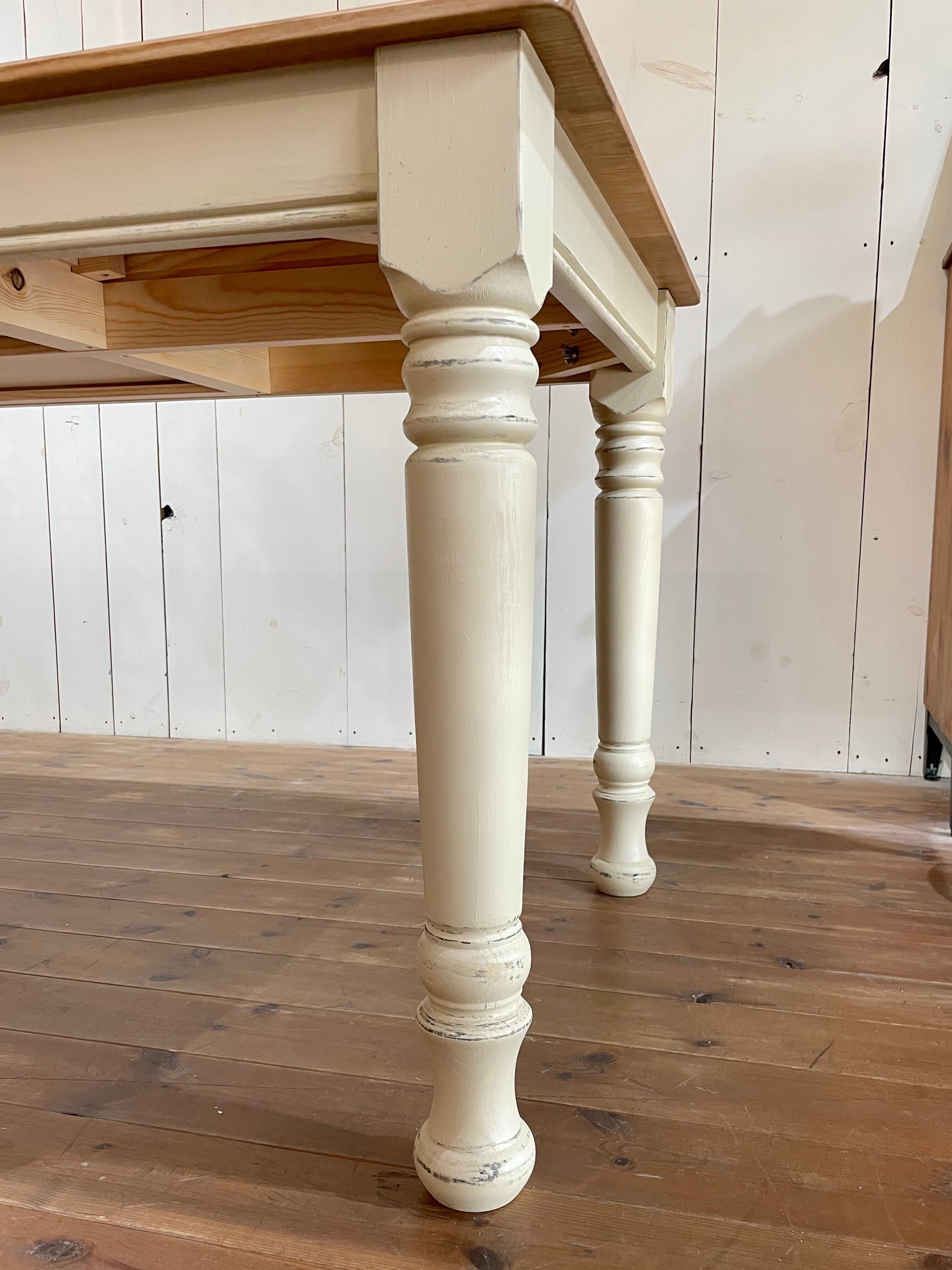 のどかな田舎農家で使い古された、アンティークテーブルをイメージしたダイニングテーブル。ベージュ色の塗装と、今世界中で人気の高まっているホワイトオーク無垢材を合わせたターンドレッグ(ろくろ脚)テーブルです。柔らかい色合いで優しい雰囲気のダイニング空間を演出します。お好みで引き出しをつけたり、エイジングペイントを施せます。