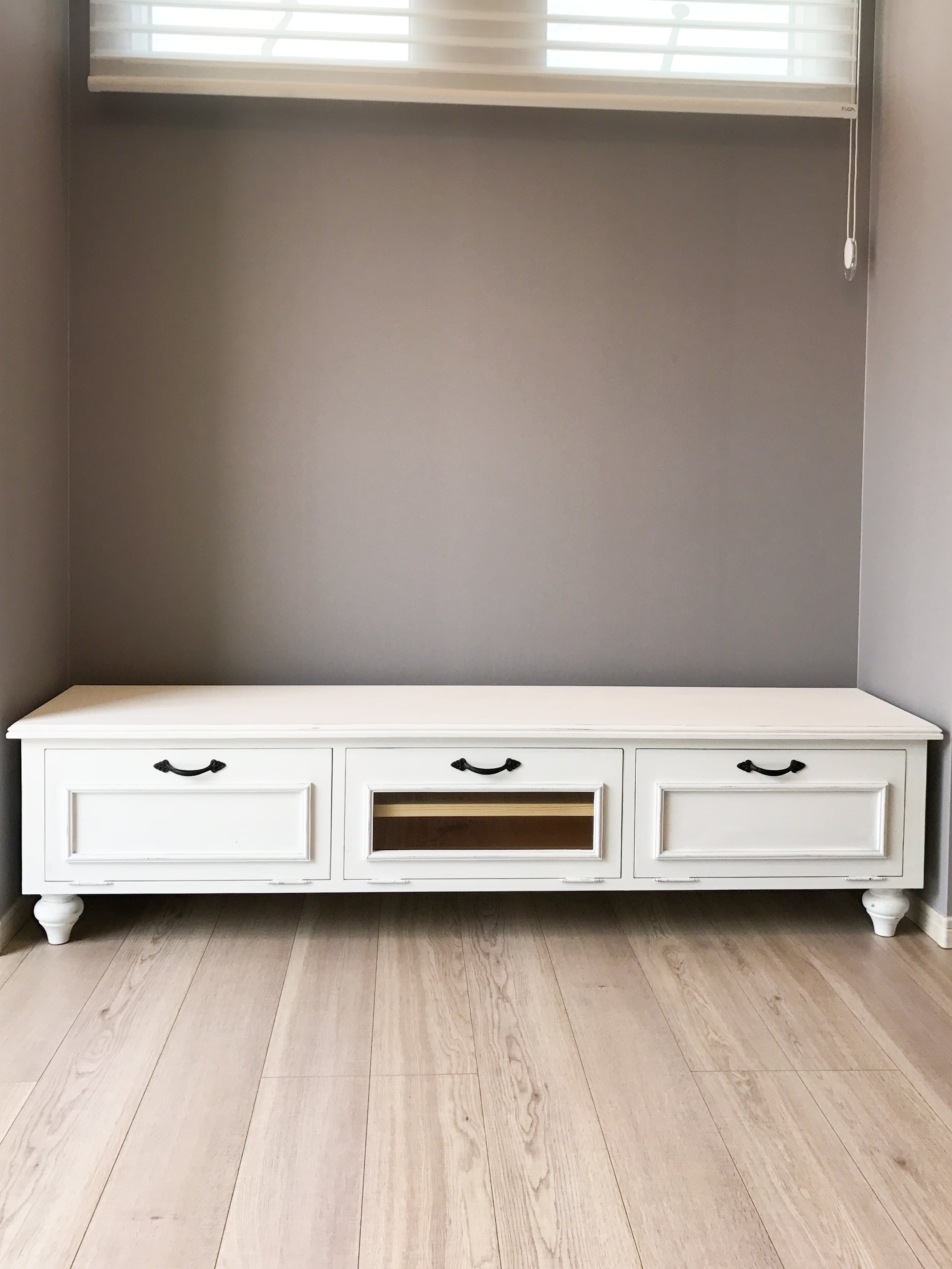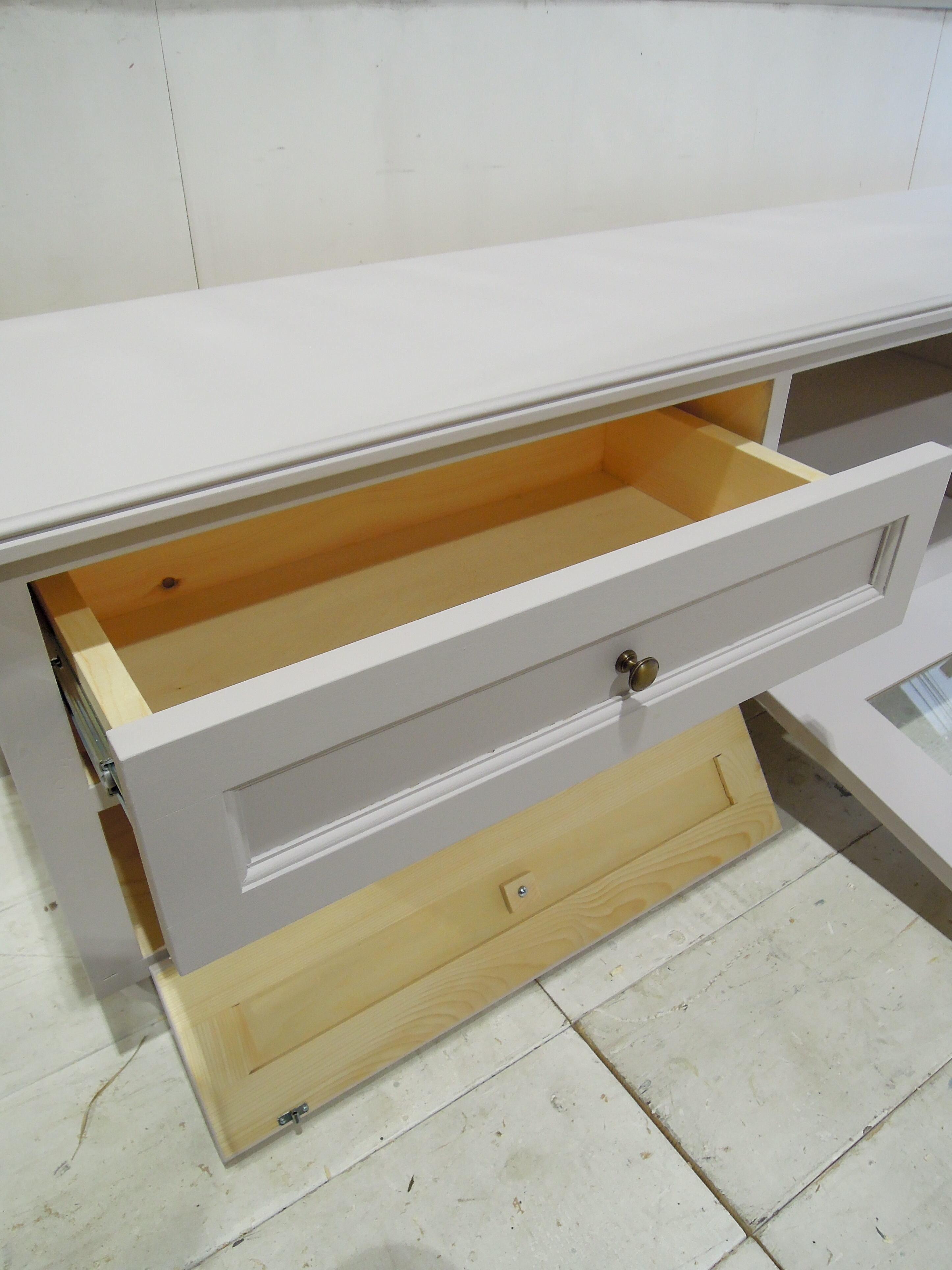 アンティーク家具をモチーフに、シンプルなデザインの中にもクラシカルな印象を与えるテレビボードです。実際のアンティーク家具にはTV台というものが存在しないため、オーダーメイドで製作いたしました。輸入住宅や洋書インテリアによく合います!