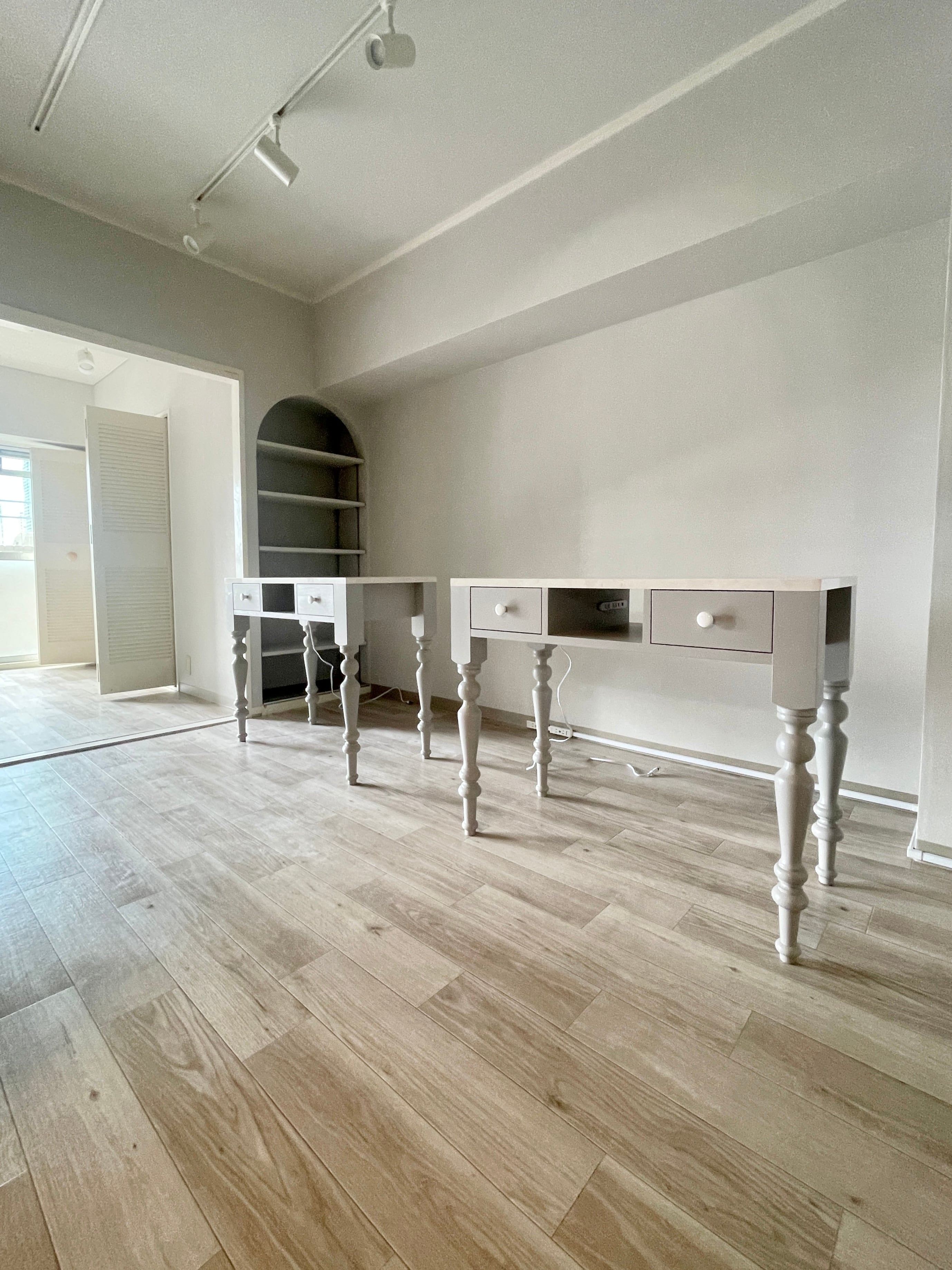 大阪にNEWOPENのネイルサロンに、とってもかわいいネイルテーブルを製作致しました。ドライフラワーを飾る大人シックな空間に似合う、可愛らしさと品格を兼ね備えたろくろ脚のネイルテーブルです。
