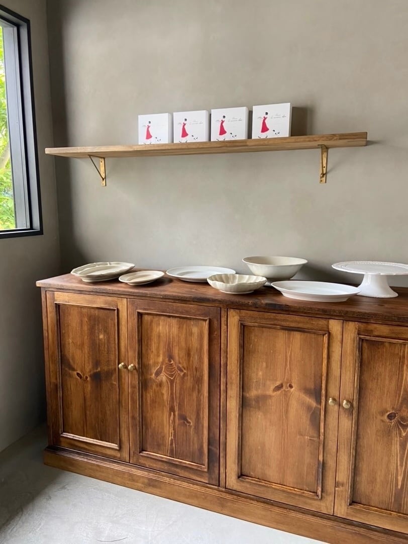 観音扉の中には棚板が5枚、片開き扉の中はフルオープンと収納力も抜群です。様々な店舗で、かわいく魅せるインテリアとして、巨大な収納家具として活躍します。モールディングで美しく装飾したアンティーク風のデザインに、くすんだグリーングレーのエイジングペイント仕上げ。貴店に合わせたサイズ、カラーでオーダーメイド致します。お気軽にご相談くださいませ。