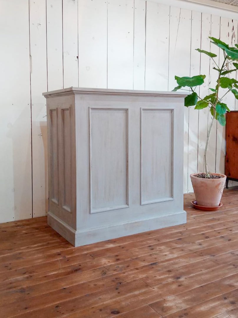 写真のサイズはW1000✕D600サイズ。お店のイメージカラーの水色に合わせて、少しエイジングペイントを施したアンティーク仕上げのカウンターです。内側は作業台と棚、立って作業しやすい高さです。お好みで引き出しをつけたり、お使いのイスに合わせて細かなサイズオーダーにもお応えします。 貴店の業務に最適なショップカウンターを、オープン日に合わせて特注製作致します。