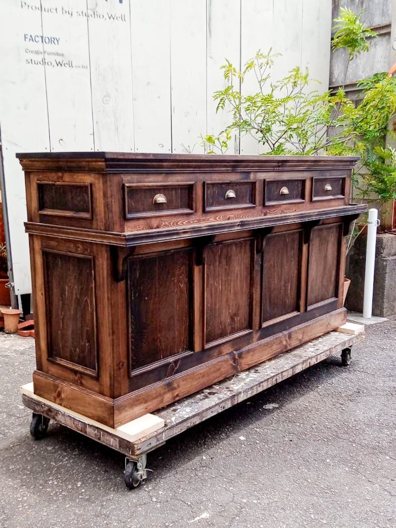 パイン無垢材を使い、ナチュラルでいて重厚感を感じさせるダークブラウン色、美容室や雑貨屋さんなど店舗什器にも人気です。写真はW1800、D570、高さ950、腰くらいの高さ、サイズオーダー対応致します。内側の収納は引き出しや可動棚など自由にカスタマイズできます。