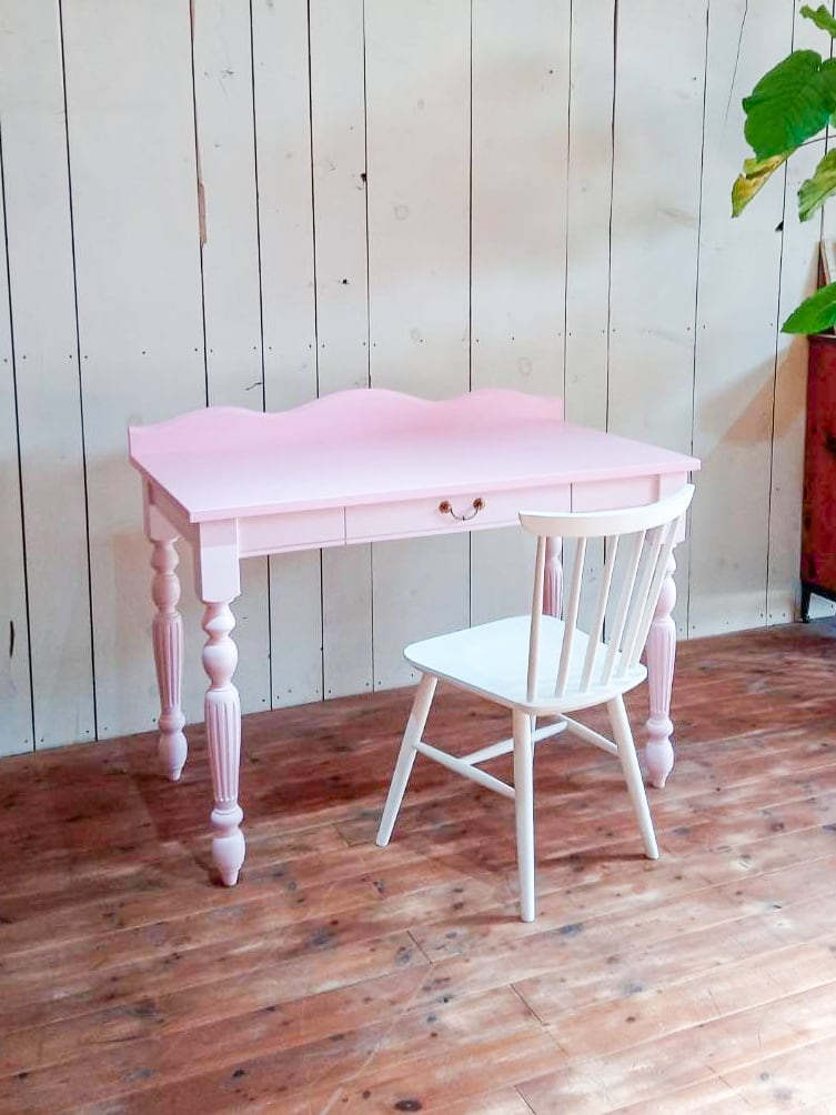 大阪府のオーナー様に、海外インテリア風のかわいいキッズデスクを製作させて頂きました。天板とろくろ足で濃さのちがうソフトピンク、こだわりのカラーオーダーです。サイズはW1100×D650、学習机やワークデスクとしては少し大きめのサイジング。引出し一つ付き、アンティーク調の真鍮取っ手が鈍く光ります。天板の上の衝立をアーチ状にカットして、とても目を引くインテリアになります。