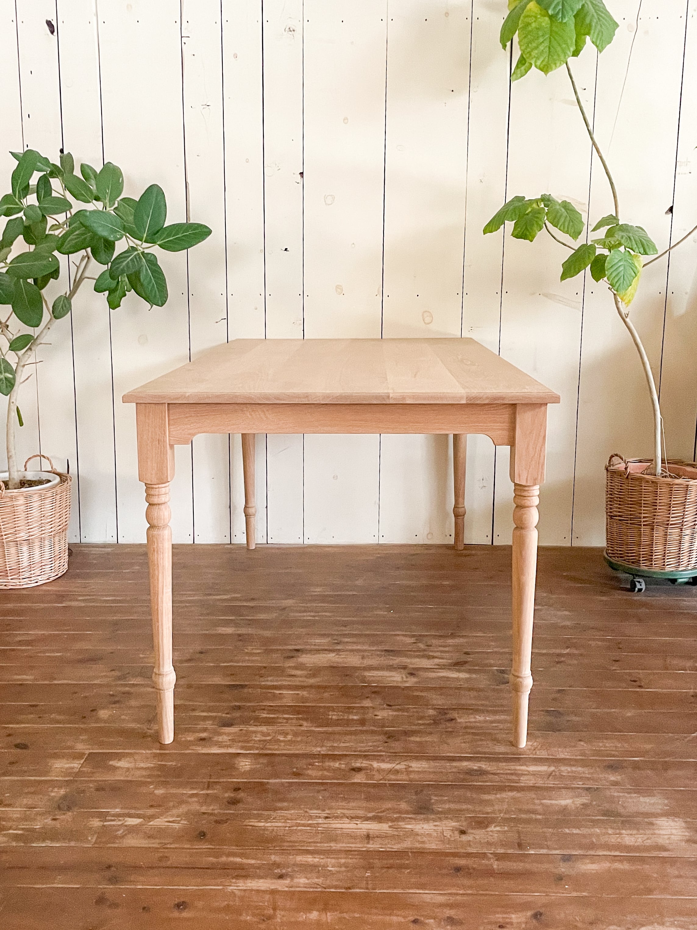写真はW1600×D900×H800、ゆったりした4人がけテーブルです。細くてレトロなシルエットのろくろ足「スリム」、幕板をえぐり込んで足元が広い特別なデザイン。今世界中で人気のホワイトオーク材を使ったテーブル、木材の温かみを感じながら家族団らんをお楽しみください。現状無塗装ですので、21色の基本カラーからお選びいただけます。