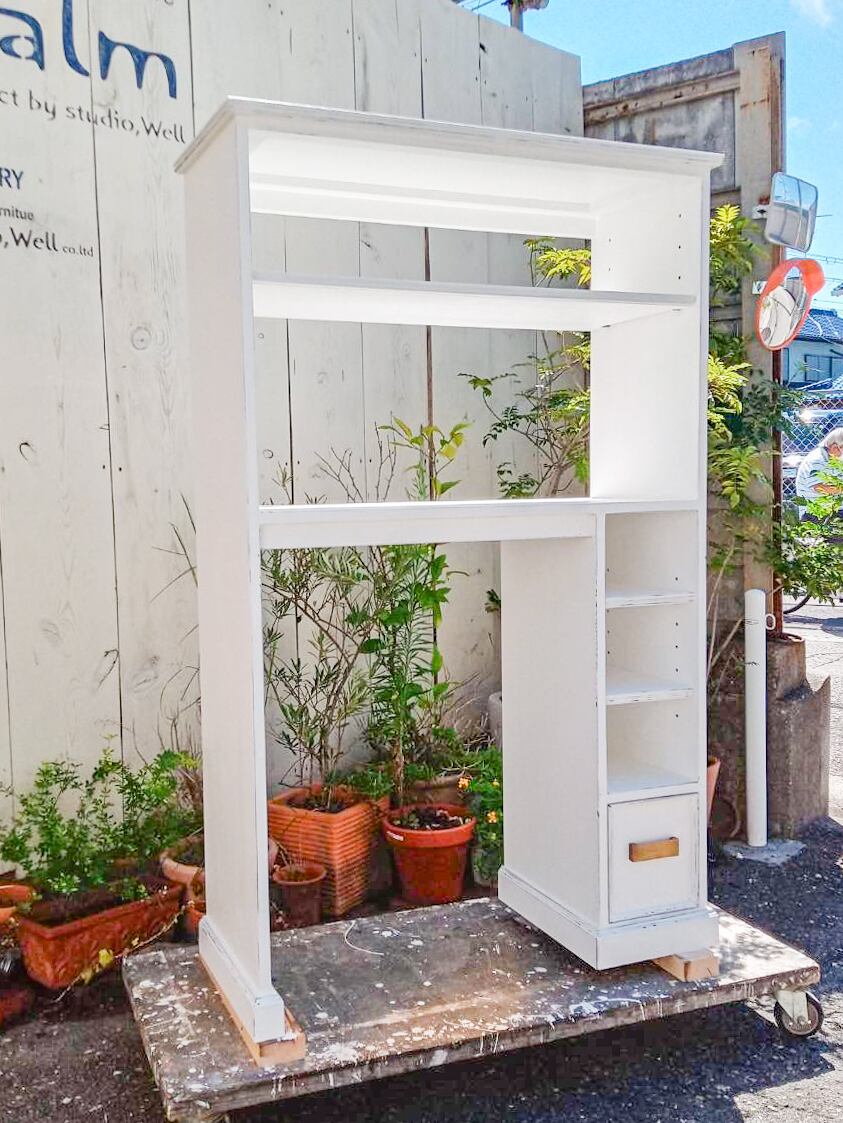 写真はW1000、D420、H1600mm、細かなサイズオーダーにお応えします。下段はゴミ箱などを置くためにオープン、小さな棚と引き出しを設置。上中段にはオーブンレンジや炊飯器を置くテーブル、その上に可動棚板。壁のコンセントを避けて棚を設置するなど、オーナー様ひとりひとりの事情に合わせたスキマ家具を製作します。